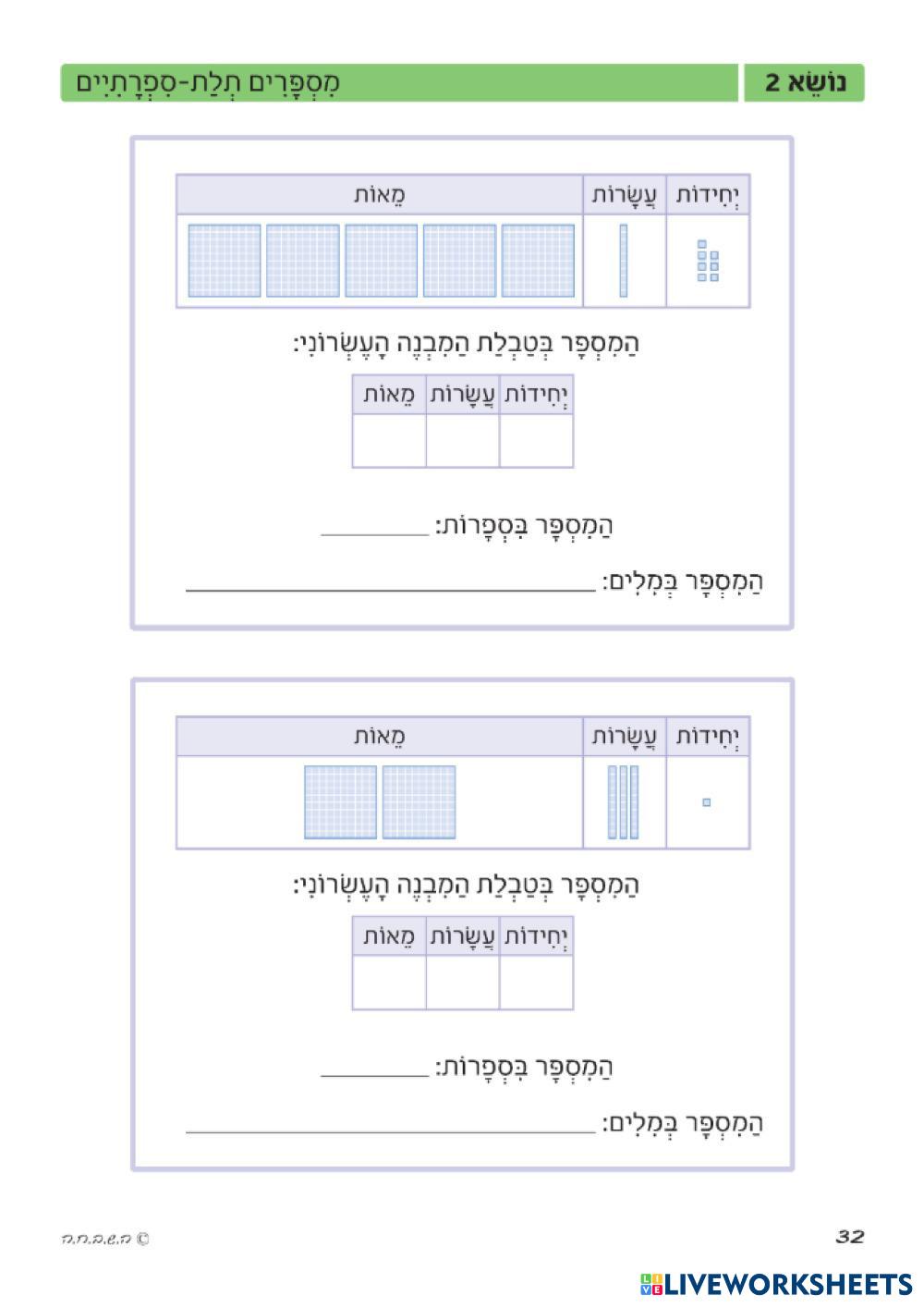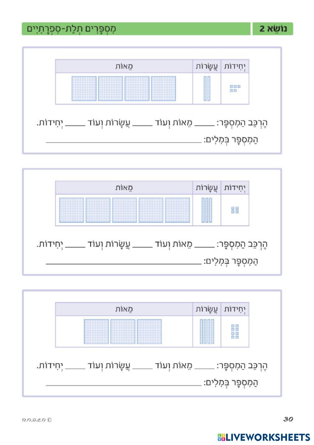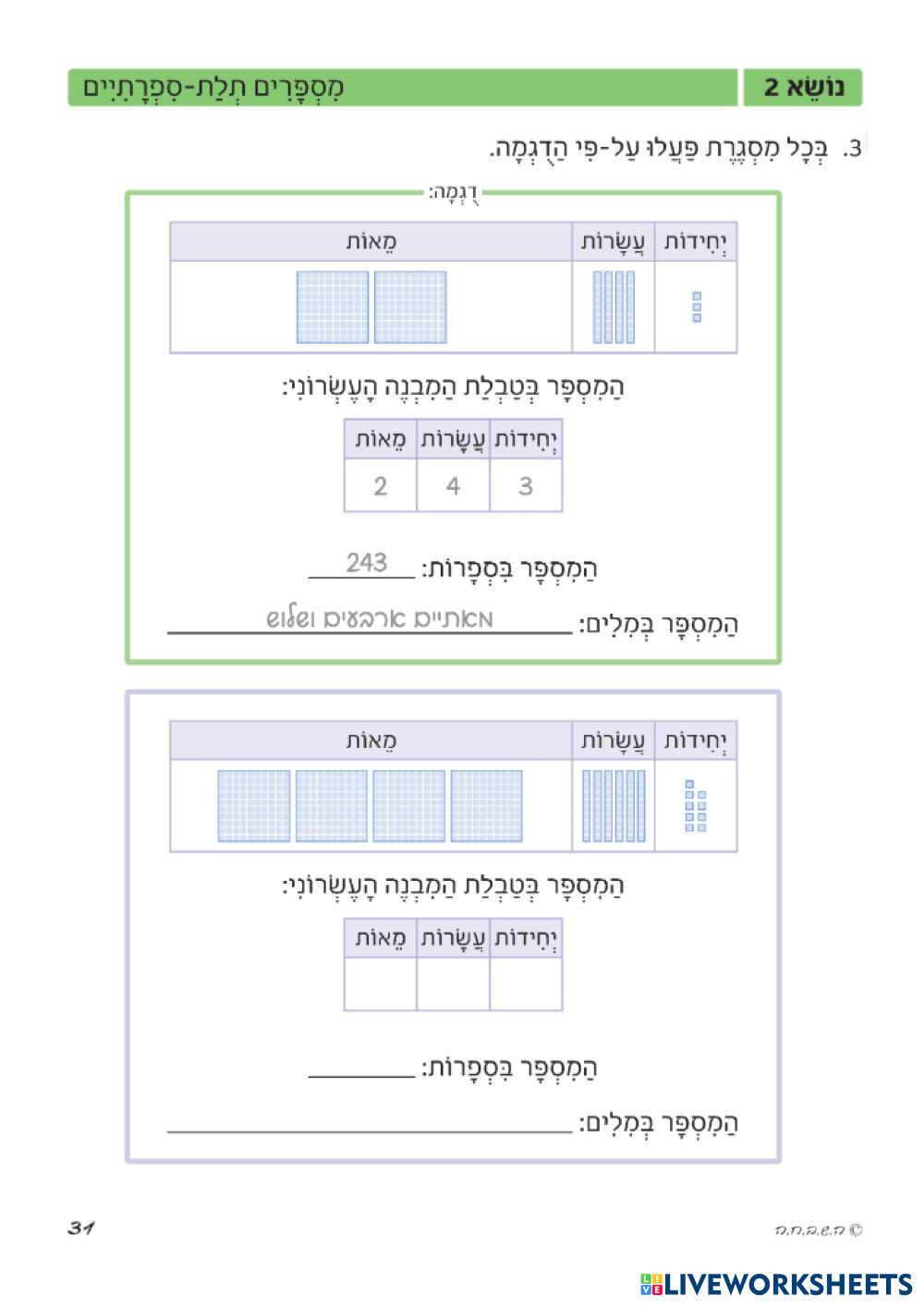 Created byNadine Ghantous Math Elementary 2nd grade Place Value Hebrew (modern) Author's Instructions פתרו את העמודים הבאים. My Google Classroom Courses × 0 classes selected (0 students total) Quick Access Select all classes (0 classes) All Classes Loading courses... Cancel Share Share to selected Course __COURSE_NAME__ __STUDENT_NAME__ (__STUDENT_EMAIL__) מספרים תלת ספרתיים Download Worksheet Validation Check my answers Emails my answers to my teacher Full name Group/level School subject Teacher's email or key code Close Submit Validating worksheet... (12) Your answers have been sent to your teacher. Good luck! OK We encountered an error submitting your answers. Please try again. OK Advertisement | Go Ad Free Created byNadine Ghantous Math Elementary 2nd grade Place Value Hebrew (modern) Author's Instructions פתרו את העמודים הבאים. Explore Worksheets اعداد ثلاثية المنزلة Math 2nd grade اعداد ثلاثية المنزلة Place Value - Math حلّوا الصّفحات التّالية. Decoration for Festivals Math 2nd grade Decoration for Festivals Place Value - Math Joyful Mathematics | Class 2 | Decoration for Festivals | Addition Suma ACS Math 2nd grade Suma ACS Place Value - Math Resuelve Suma ACS Math 2nd grade Suma ACS Place Value - Math Resuelve estas sumas