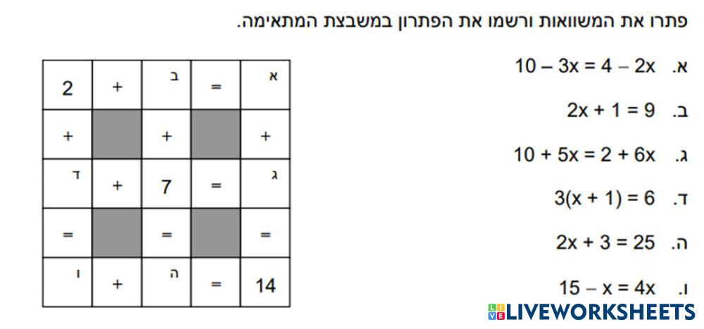 פתרו את המשוואות. רשמו פתרון כל משוואה במקום המתאים