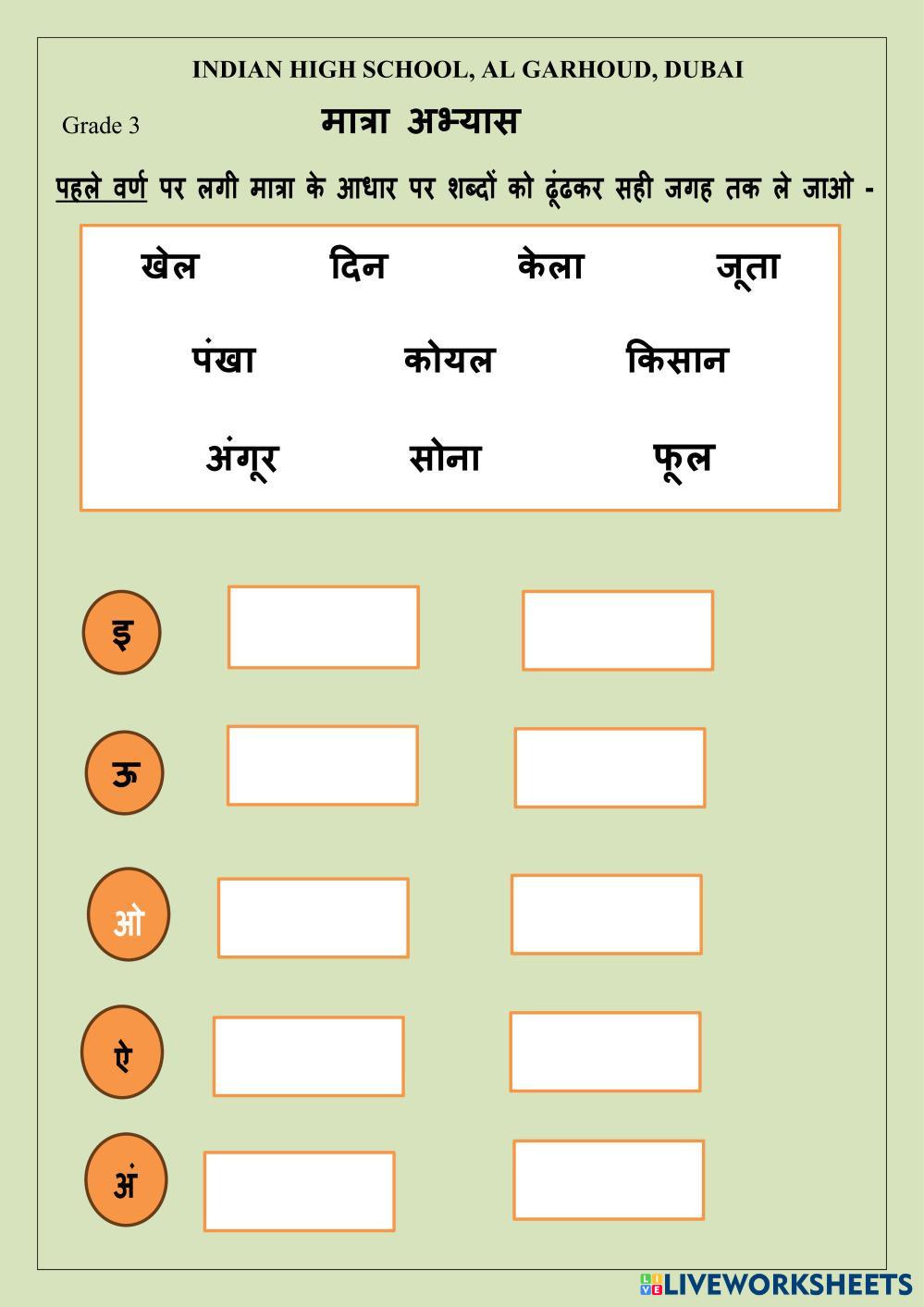 Created by Savita13 ESL A2 Vocabulary Hindi Author's Instructions शब्दों को सही मात्रा पर ले जाएँ My Google Classroom Courses × 0 classes selected (0 students total) Quick Access Select all classes (0 classes) All Classes Loading courses... Cancel Share Share to selected Course __COURSE_NAME__ __STUDENT_NAME__ (__STUDENT_EMAIL__) मात्रा अभ्यास Download Worksheet Validation Check my answers Emails my answers to my teacher Full name Group/level School subject Teacher's email or key code Close Submit Validating worksheet... (12) Your answers have been sent to your teacher. Good luck! OK We encountered an error submitting your answers. Please try again. OK Advertisement | Go Ad Free Created by Savita13 ESL A2 Vocabulary Hindi Author's Instructions शब्दों को सही मात्रा पर ले जाएँ Explore Worksheets long vowel e ESL A2 long vowel e Vocabulary - ESL choose the right answer Reading comprehension ESL A2 Reading comprehension Vocabulary - ESL drag the words to the correct pictures phonic: ld and lt ESL A2 phonic: ld and lt Vocabulary - ESL write the correct answer Homework 07: Food ESL A2 Homework 07: Food Vocabulary - ESL drag the word to the picture
