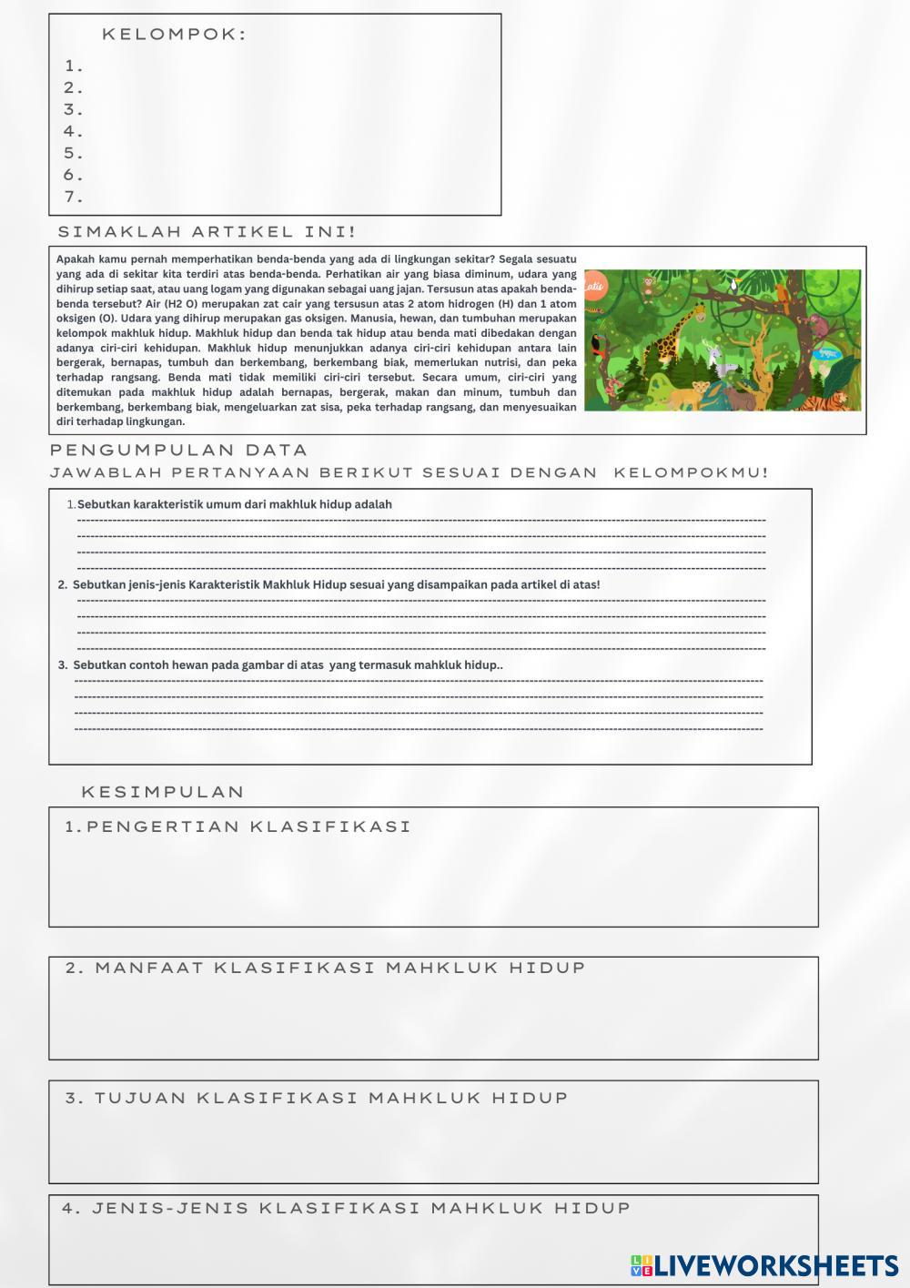Created byYuni Chartika Kudadiri 7 C KLASIFIKASI MAHKLUK HIDUP Age 12-17 level: 7 SMP Indonesian Author's Instructions My Google Classroom Courses × 0 classes selected (0 students total) Quick Access Select all classes (0 classes) All Classes Loading courses... Cancel Share Share to selected Course __COURSE_NAME__ __STUDENT_NAME__ (__STUDENT_EMAIL__) LEMBAR KERJA PESERTA DIDIK KLASIFIKASI MAHKLUK HIDUP Download Worksheet Validation Check my answers Emails my answers to my teacher Full name Group/level School subject Teacher's email or key code Close Submit Validating worksheet... (12) Your answers have been sent to your teacher. Good luck! OK We encountered an error submitting your answers. Please try again. OK Advertisement | Go Ad Free Created byYuni Chartika Kudadiri 7 C KLASIFIKASI MAHKLUK HIDUP Age 12-17 level: 7 SMP Indonesian Author's Instructions