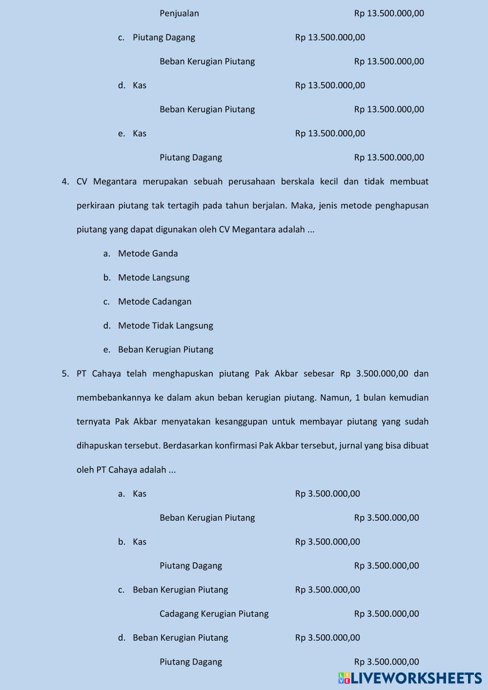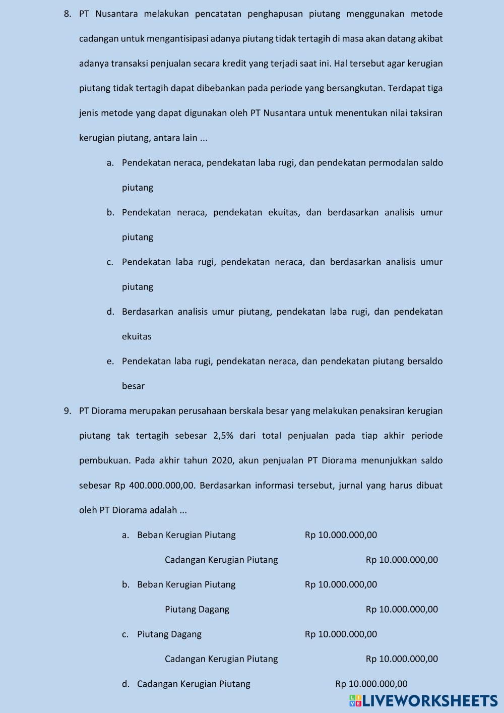 Created bySiti Tasriah AKUNTANSI KEUANGAN piutang Age 15+ level: medium Indonesian Author's Instructions My Google Classroom Courses × 0 classes selected (0 students total) Quick Access Select all classes (0 classes) All Classes Loading courses... Cancel Share Share to selected Course __COURSE_NAME__ __STUDENT_NAME__ (__STUDENT_EMAIL__) Pilihan Ganda Piutang Tak Tertagih Download Worksheet Validation Check my answers Emails my answers to my teacher Full name Group/level School subject Teacher's email or key code Close Submit Validating worksheet... (12) Your answers have been sent to your teacher. Good luck! OK We encountered an error submitting your answers. Please try again. OK Advertisement | Go Ad Free Created bySiti Tasriah AKUNTANSI KEUANGAN piutang Age 15+ level: medium Indonesian Author's Instructions