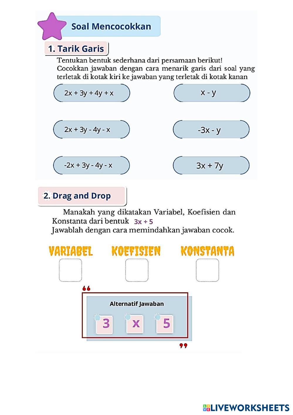 Created bySitti Sarina ALJABAR Bentuk aljabar Age 12+ level: 3 Indonesian Author's Instructions My Google Classroom Courses × 0 classes selected (0 students total) Quick Access Select all classes (0 classes) All Classes Loading courses... Cancel Share Share to selected Course __COURSE_NAME__ __STUDENT_NAME__ (__STUDENT_EMAIL__) Bentuk Aljabar Download Worksheet Validation Check my answers Emails my answers to my teacher Full name Group/level School subject Teacher's email or key code Close Submit Validating worksheet... (12) Your answers have been sent to your teacher. Good luck! OK We encountered an error submitting your answers. Please try again. OK Advertisement | Go Ad Free Created bySitti Sarina ALJABAR Bentuk aljabar Age 12+ level: 3 Indonesian Author's Instructions
