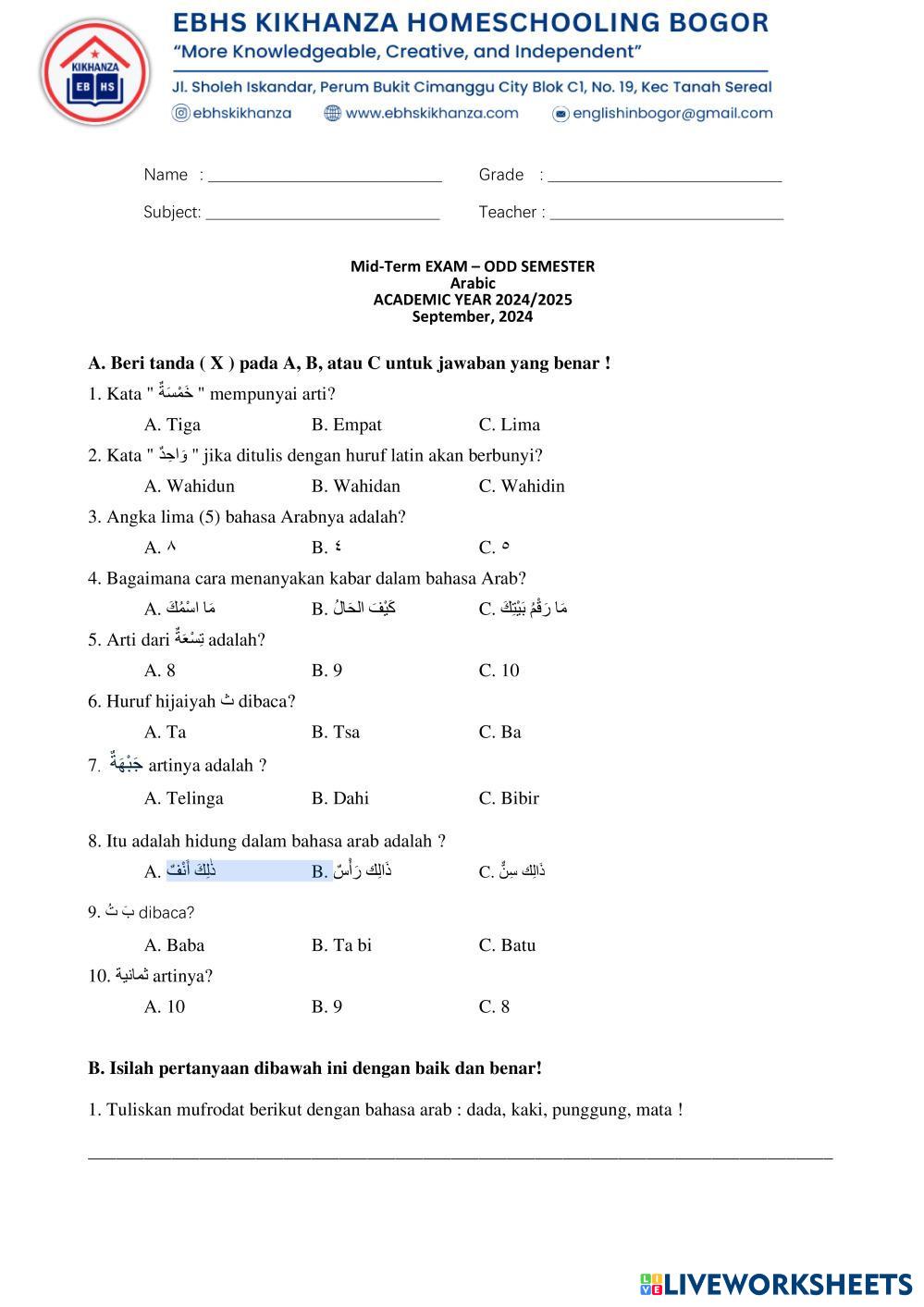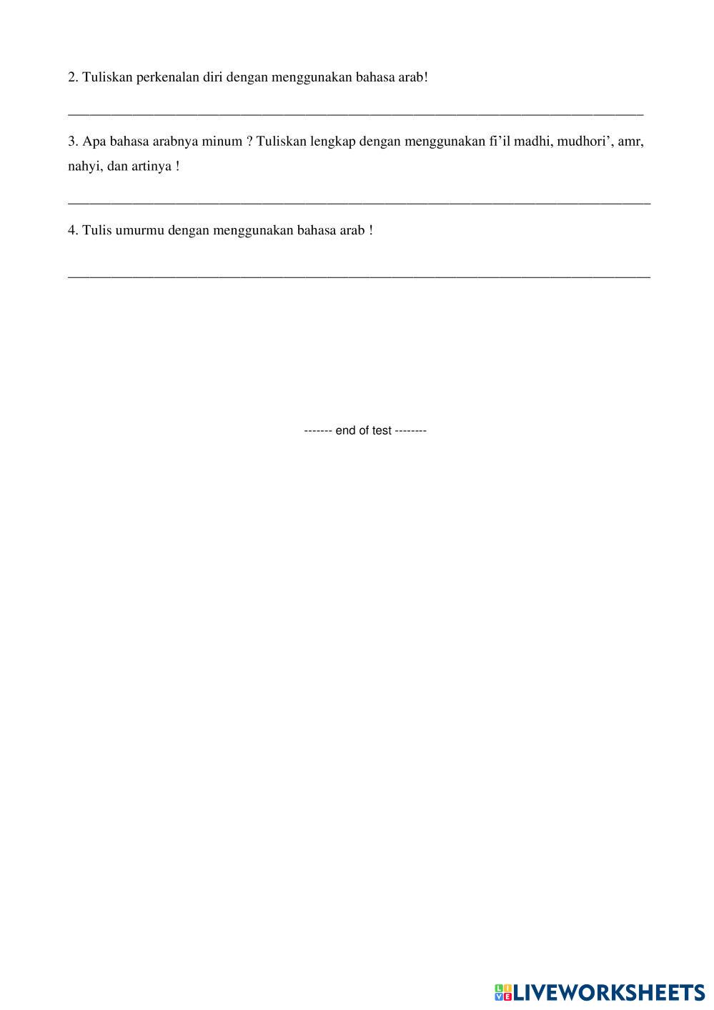 Created byHesti Sulistyowati arabic Arabic practice Age 15+ level: Grade 11 Indonesian Author's Instructions My Google Classroom Courses × 0 classes selected (0 students total) Quick Access Select all classes (0 classes) All Classes Loading courses... Cancel Share Share to selected Course __COURSE_NAME__ __STUDENT_NAME__ (__STUDENT_EMAIL__) PTS Bahasa Arab Semester Ganjil Download Worksheet Validation Check my answers Emails my answers to my teacher Full name Group/level School subject Teacher's email or key code Close Submit Validating worksheet... (12) Your answers have been sent to your teacher. Good luck! OK We encountered an error submitting your answers. Please try again. OK Advertisement | Go Ad Free Created byHesti Sulistyowati arabic Arabic practice Age 15+ level: Grade 11 Indonesian Author's Instructions