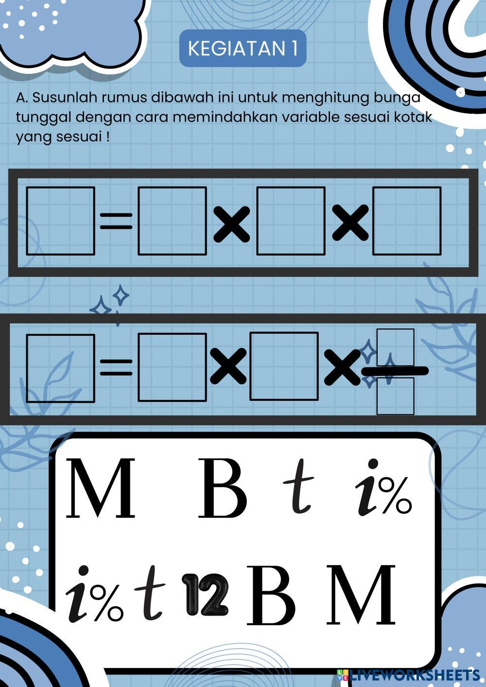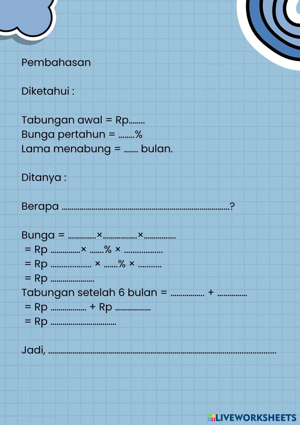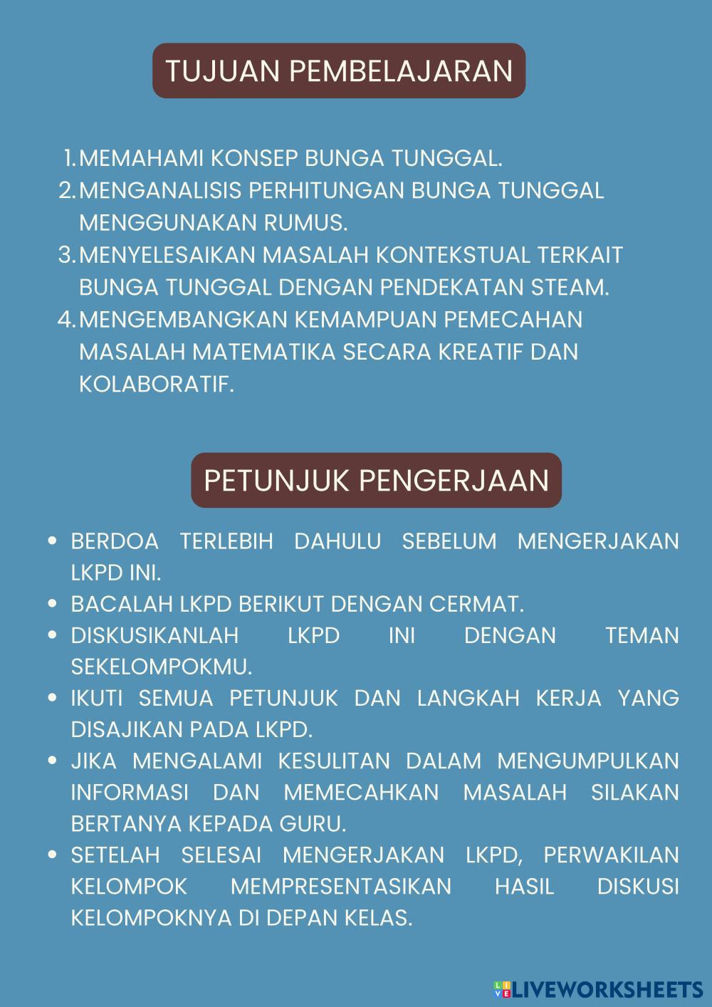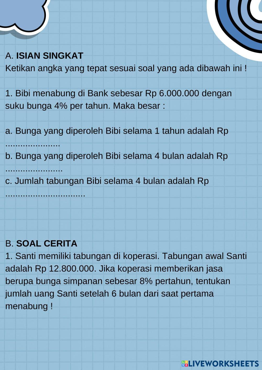 Created byHanna Fauziyah ARITMATIKA SOSIAL Bunga dan Tabungan Age 12-16 level: VII Indonesian Author's Instructions My Google Classroom Courses × 0 classes selected (0 students total) Quick Access Select all classes (0 classes) All Classes Loading courses... Cancel Share Share to selected Course __COURSE_NAME__ __STUDENT_NAME__ (__STUDENT_EMAIL__) LKPD BUNGA TUNGGAL Download Worksheet Validation Check my answers Emails my answers to my teacher Full name Group/level School subject Teacher's email or key code Close Submit Validating worksheet... (12) Your answers have been sent to your teacher. Good luck! OK We encountered an error submitting your answers. Please try again. OK Advertisement | Go Ad Free Created byHanna Fauziyah ARITMATIKA SOSIAL Bunga dan Tabungan Age 12-16 level: VII Indonesian Author's Instructions
