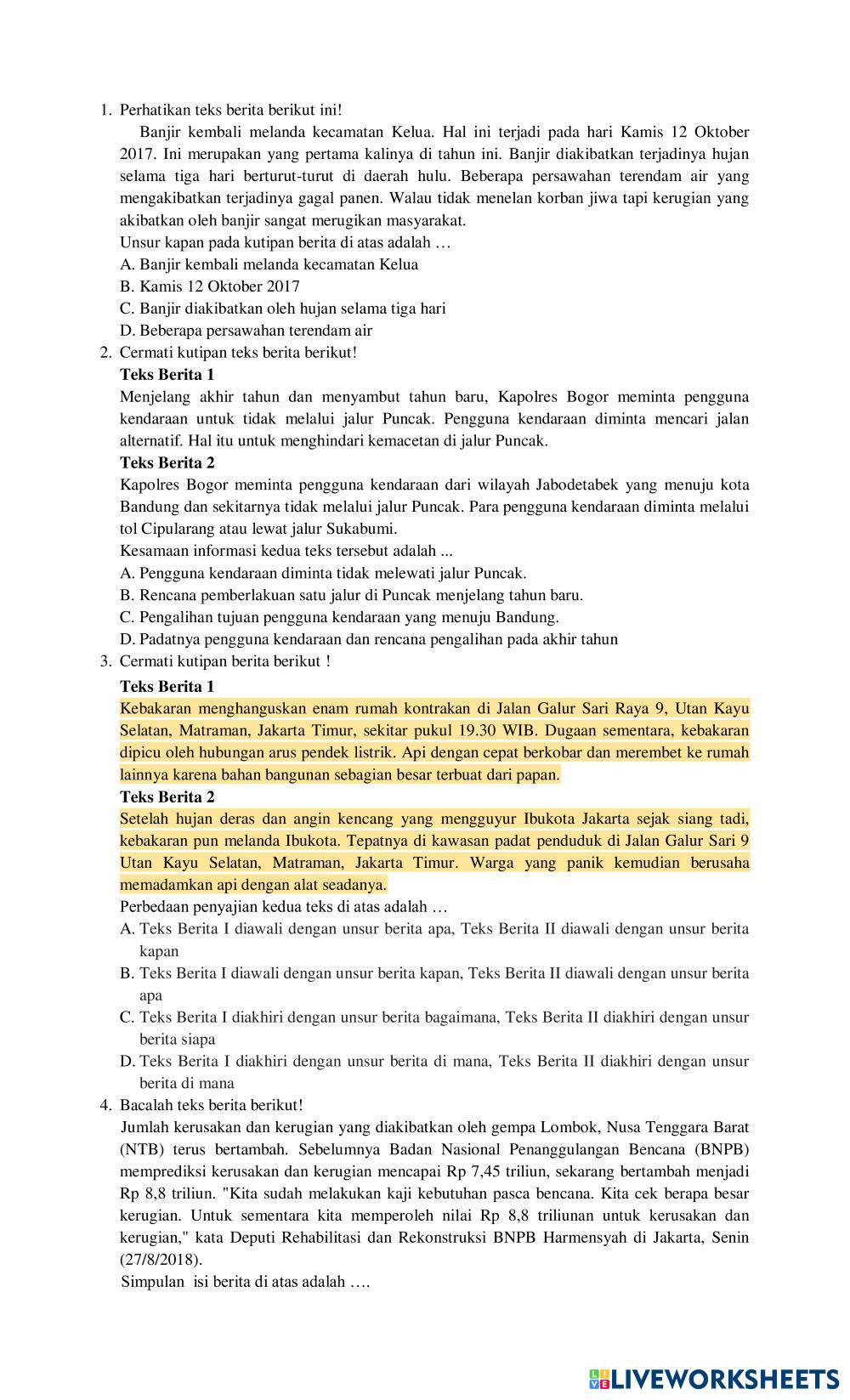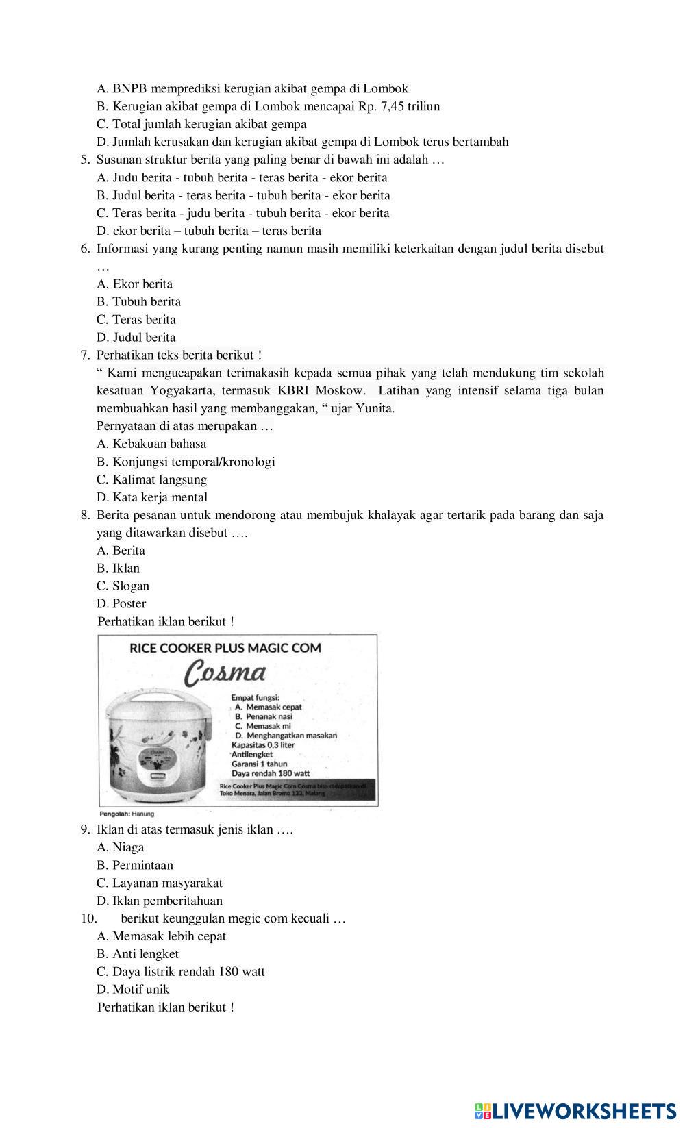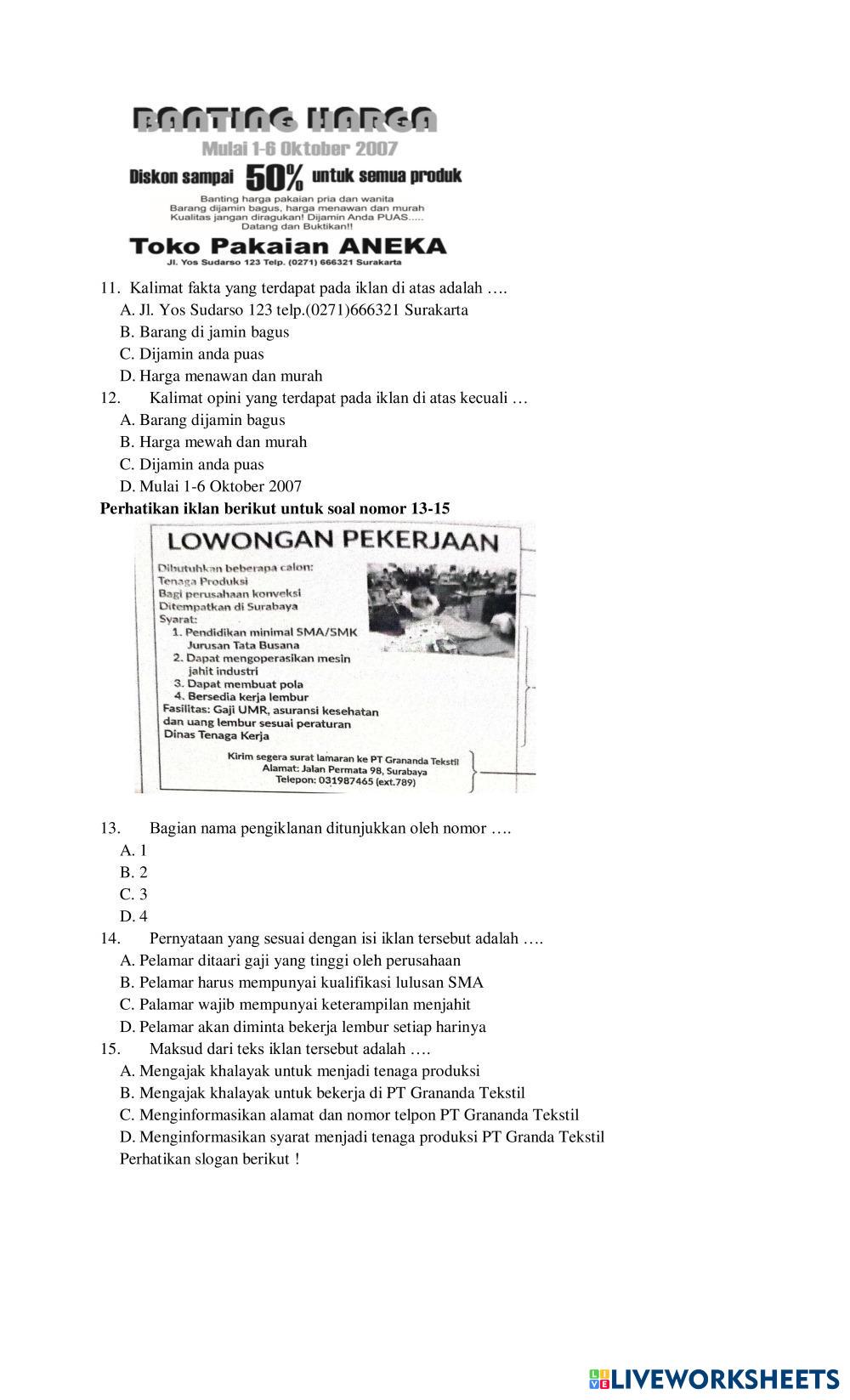 Created byhudriana1987 Bahasa Indonesia Teks Berita dan Teks Iklan Age 14-18 level: 8 Indonesian Author's Instructions My Google Classroom Courses × 0 classes selected (0 students total) Quick Access Select all classes (0 classes) All Classes Loading courses... Cancel Share Share to selected Course __COURSE_NAME__ __STUDENT_NAME__ (__STUDENT_EMAIL__) KELAS VIII C Download Worksheet Validation Check my answers Emails my answers to my teacher Full name Group/level School subject Teacher's email or key code Close Submit Validating worksheet... (12) Your answers have been sent to your teacher. Good luck! OK We encountered an error submitting your answers. Please try again. OK Advertisement | Go Ad Free Created byhudriana1987 Bahasa Indonesia Teks Berita dan Teks Iklan Age 14-18 level: 8 Indonesian Author's Instructions