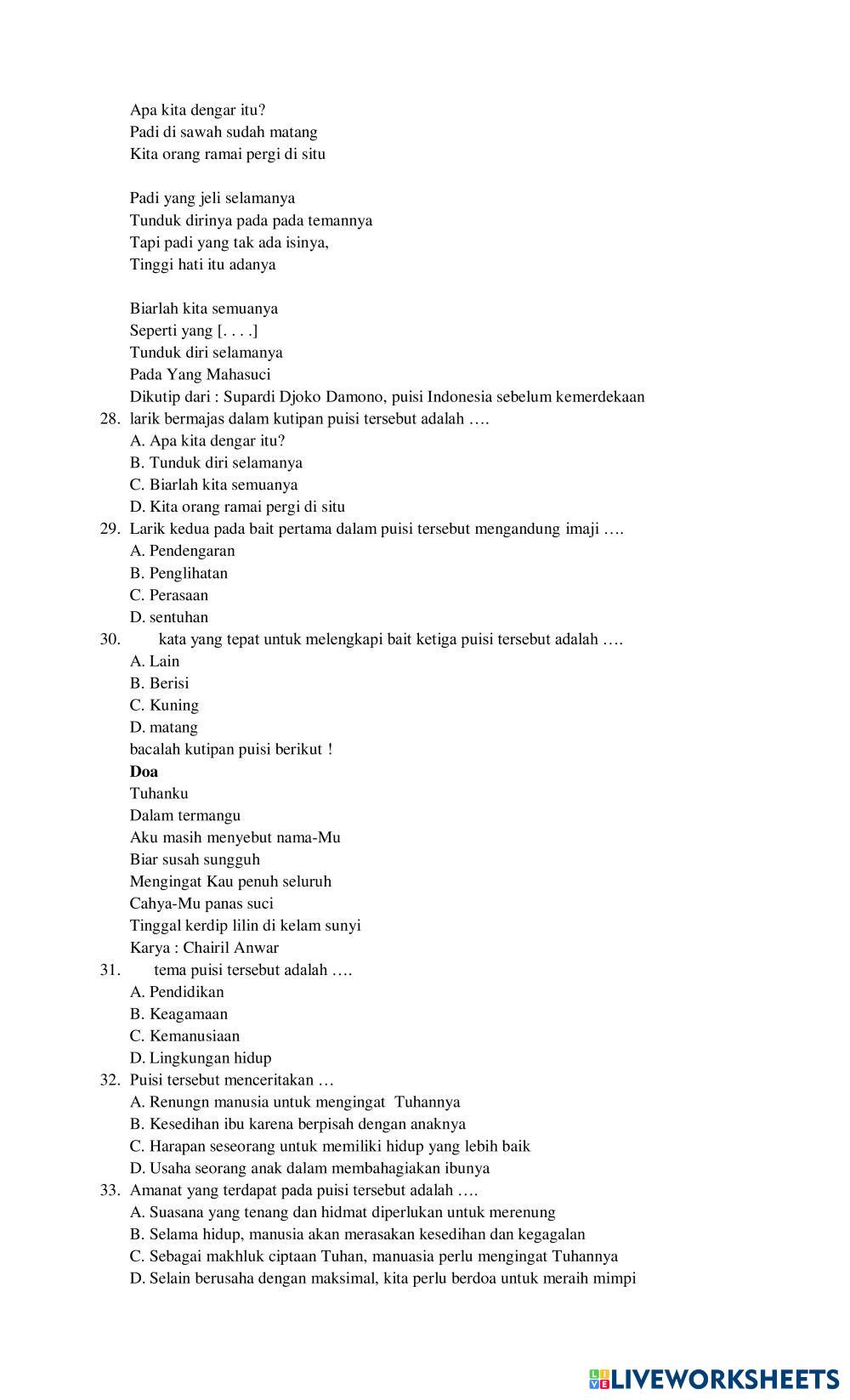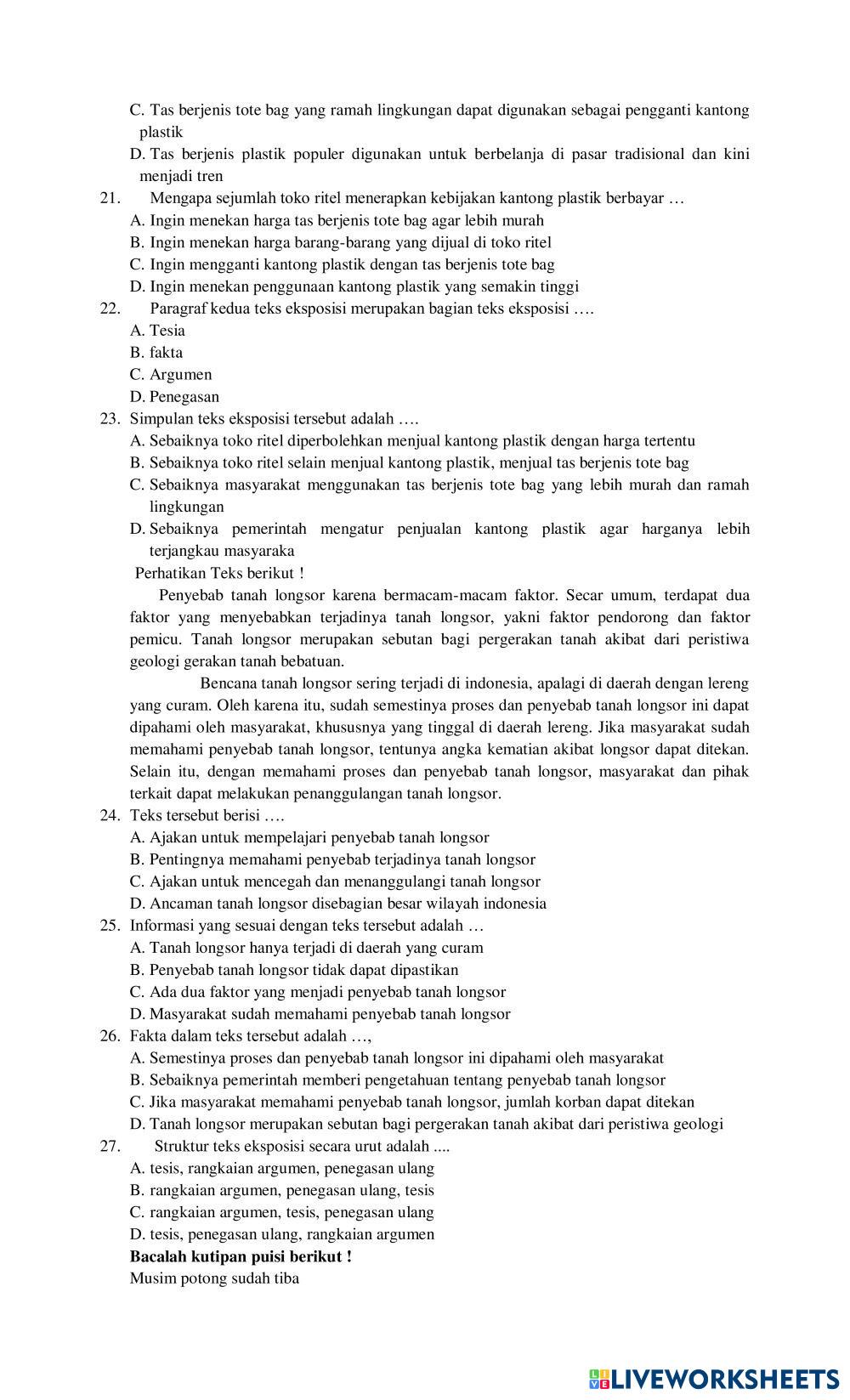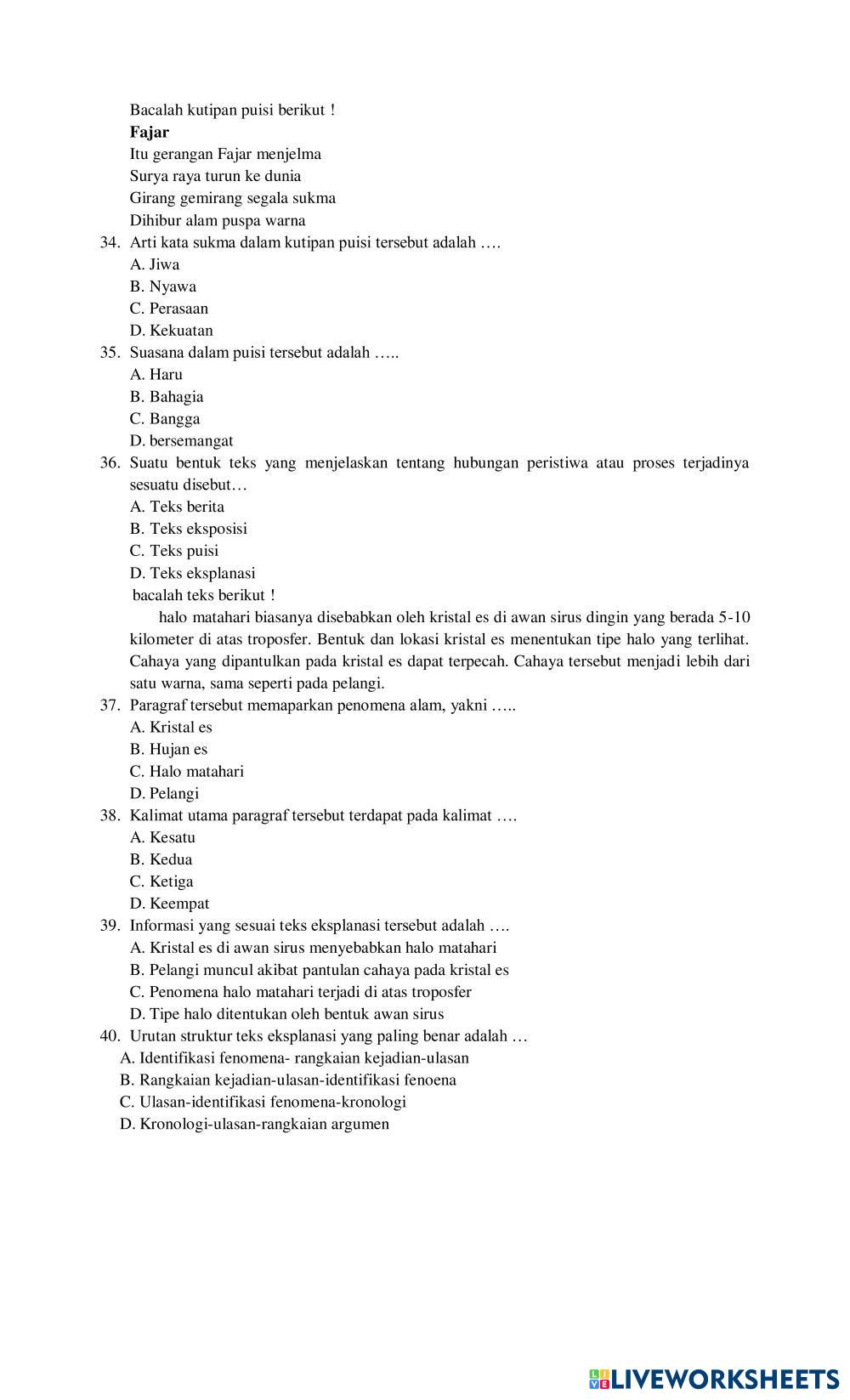 Created byhudriana1987 Bahasa Indonesia Teks Berita dan Teks Iklan Age 14-18 level: 8 Indonesian Author's Instructions My Google Classroom Courses × 0 classes selected (0 students total) Quick Access Select all classes (0 classes) All Classes Loading courses... Cancel Share Share to selected Course __COURSE_NAME__ __STUDENT_NAME__ (__STUDENT_EMAIL__) KELAS VIII C Download Worksheet Validation Check my answers Emails my answers to my teacher Full name Group/level School subject Teacher's email or key code Close Submit Validating worksheet... (12) Your answers have been sent to your teacher. Good luck! OK We encountered an error submitting your answers. Please try again. OK Advertisement | Go Ad Free Created byhudriana1987 Bahasa Indonesia Teks Berita dan Teks Iklan Age 14-18 level: 8 Indonesian Author's Instructions