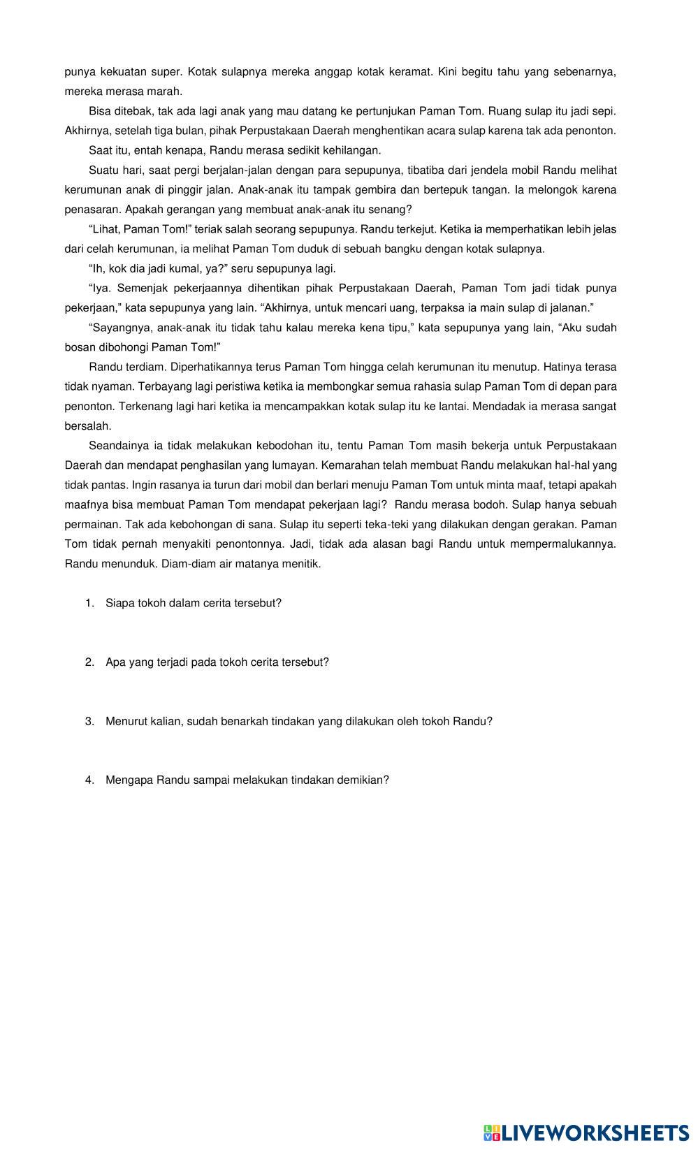 Created byTaufik Amin Bahasa Indonesia Menjawab pertanyaan berdasarkan teks cerita Age 13-18 level: 8 Indonesian Author's Instructions Mendiskusikan Isi Karya Fiksi My Google Classroom Courses × 0 classes selected (0 students total) Quick Access Select all classes (0 classes) All Classes Loading courses... Cancel Share Share to selected Course __COURSE_NAME__ __STUDENT_NAME__ (__STUDENT_EMAIL__) Mendiskusikan Isi Karya Fiksi Download Worksheet Validation Check my answers Emails my answers to my teacher Full name Group/level School subject Teacher's email or key code Close Submit Validating worksheet... (12) Your answers have been sent to your teacher. Good luck! OK We encountered an error submitting your answers. Please try again. OK Advertisement | Go Ad Free Created byTaufik Amin Bahasa Indonesia Menjawab pertanyaan berdasarkan teks cerita Age 13-18 level: 8 Indonesian Author's Instructions Mendiskusikan Isi Karya Fiksi