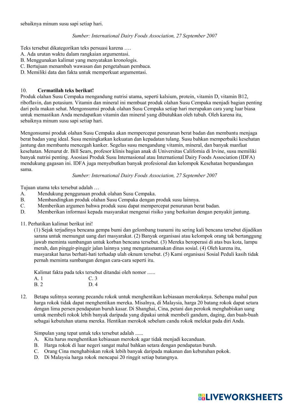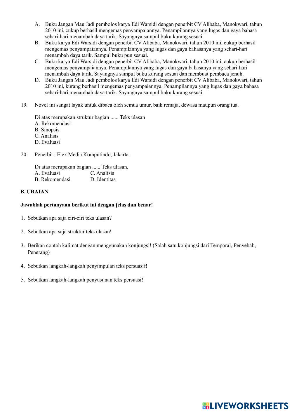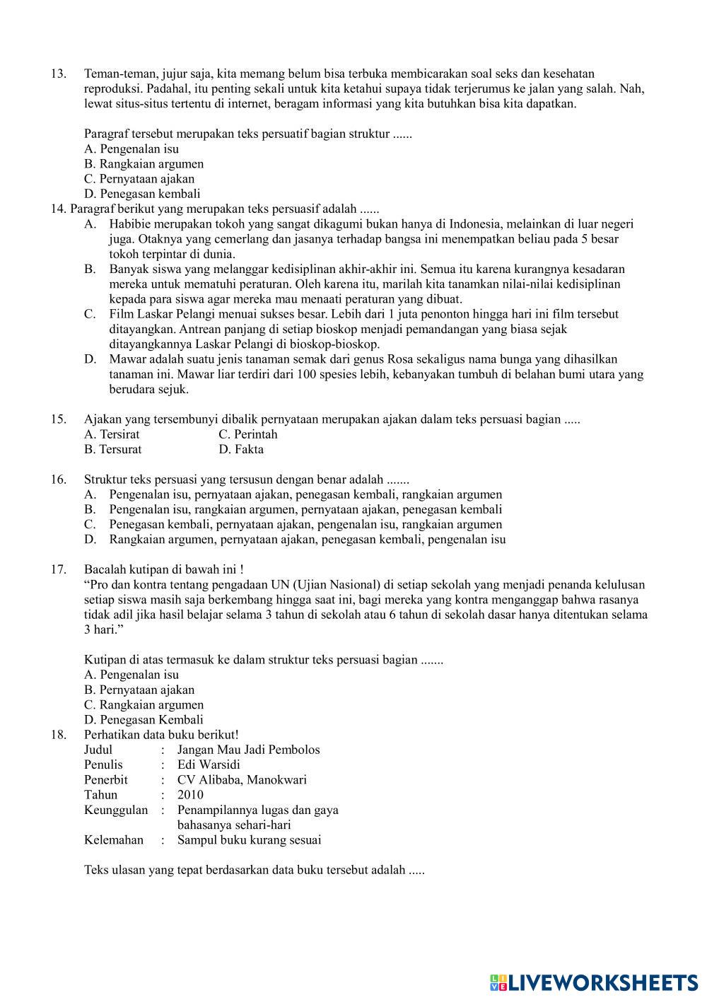 Created bymadrasah alakbar Bahasa Indonesia Penilaian Tengah Semester Age 11-16 level: 8 Indonesian Author's Instructions My Google Classroom Courses × 0 classes selected (0 students total) Quick Access Select all classes (0 classes) All Classes Loading courses... Cancel Share Share to selected Course __COURSE_NAME__ __STUDENT_NAME__ (__STUDENT_EMAIL__) PTS genap Bahasa Indonesia VIII Download Worksheet Validation Check my answers Emails my answers to my teacher Full name Group/level School subject Teacher's email or key code Close Submit Validating worksheet... (12) Your answers have been sent to your teacher. Good luck! OK We encountered an error submitting your answers. Please try again. OK Advertisement | Go Ad Free Created bymadrasah alakbar Bahasa Indonesia Penilaian Tengah Semester Age 11-16 level: 8 Indonesian Author's Instructions