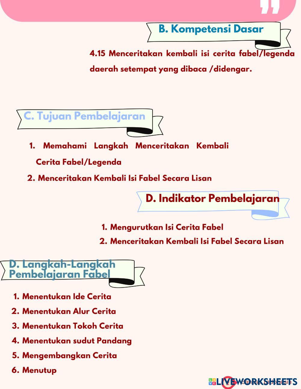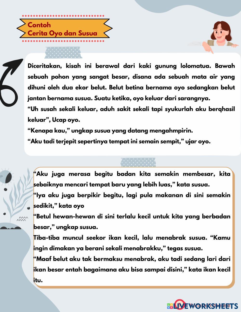 Created byannariatinazara Bahasa Indonesia Cerita Fabel Age 14+ level: 7 Indonesian Author's Instructions Ceita Fabel My Google Classroom Courses × 0 classes selected (0 students total) Quick Access Select all classes (0 classes) All Classes Loading courses... Cancel Share Share to selected Course __COURSE_NAME__ __STUDENT_NAME__ (__STUDENT_EMAIL__) anariati nazara Download Worksheet Validation Check my answers Emails my answers to my teacher Full name Group/level School subject Teacher's email or key code Close Submit Validating worksheet... (12) Your answers have been sent to your teacher. Good luck! OK We encountered an error submitting your answers. Please try again. OK Advertisement | Go Ad Free Created byannariatinazara Bahasa Indonesia Cerita Fabel Age 14+ level: 7 Indonesian Author's Instructions Ceita Fabel