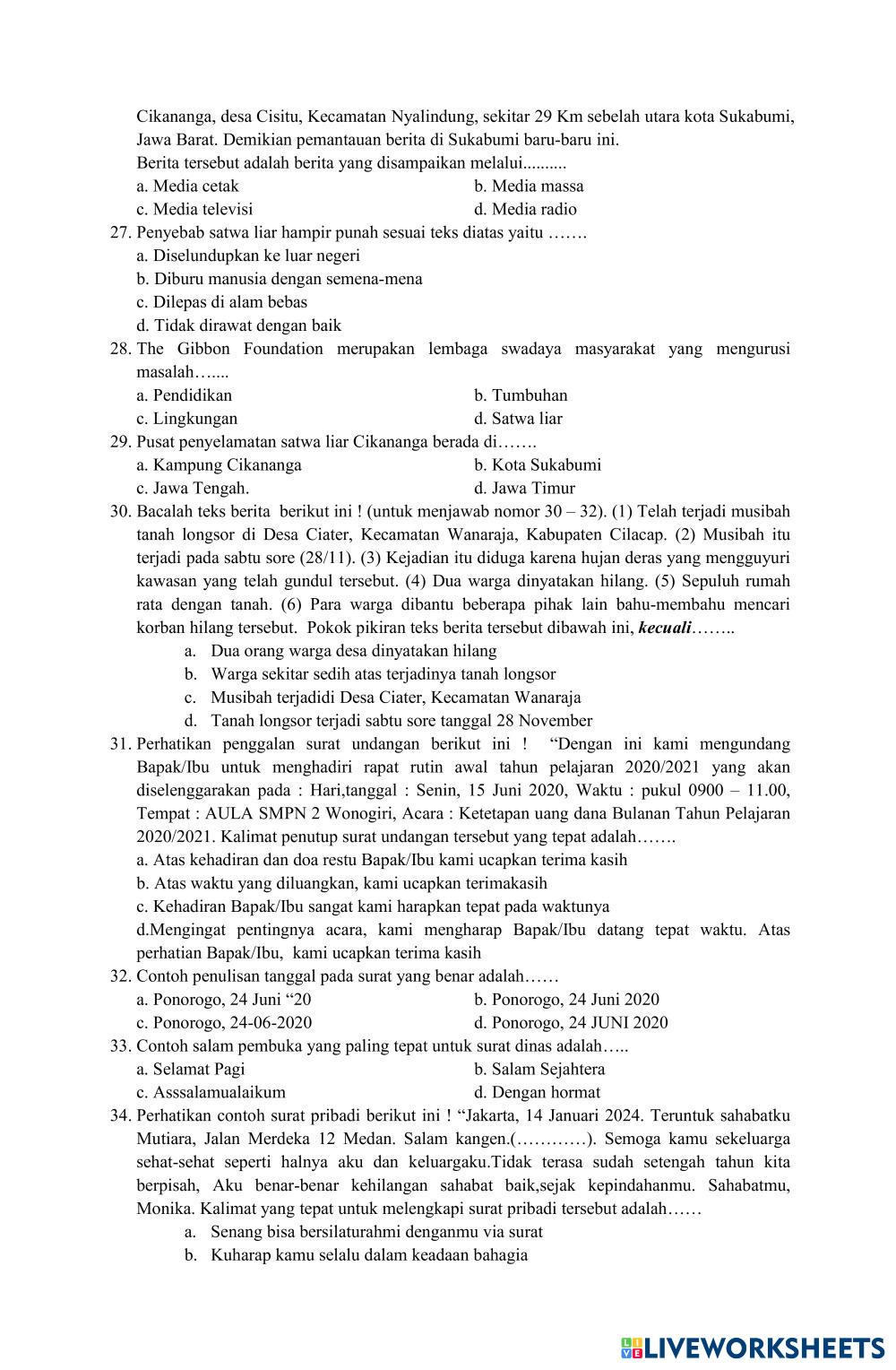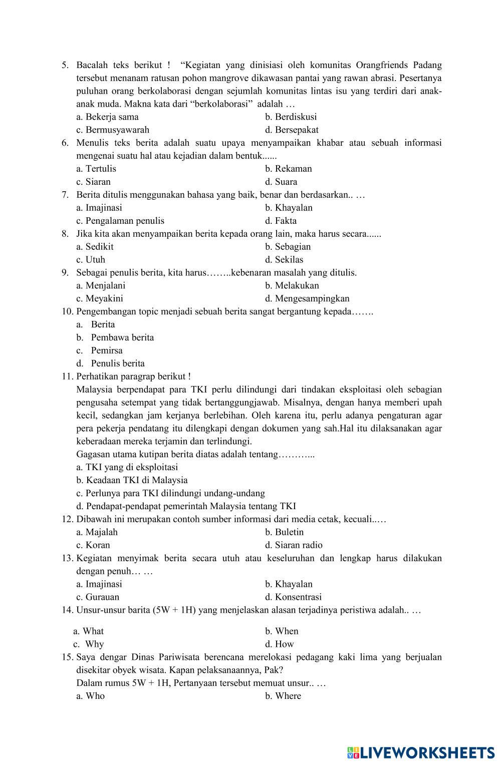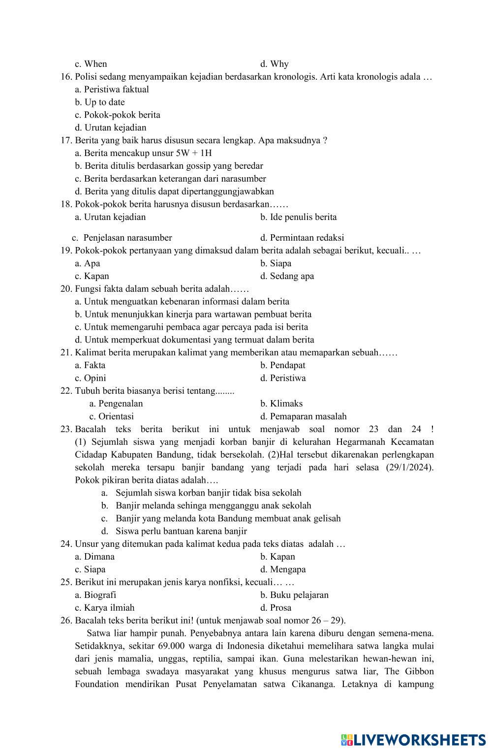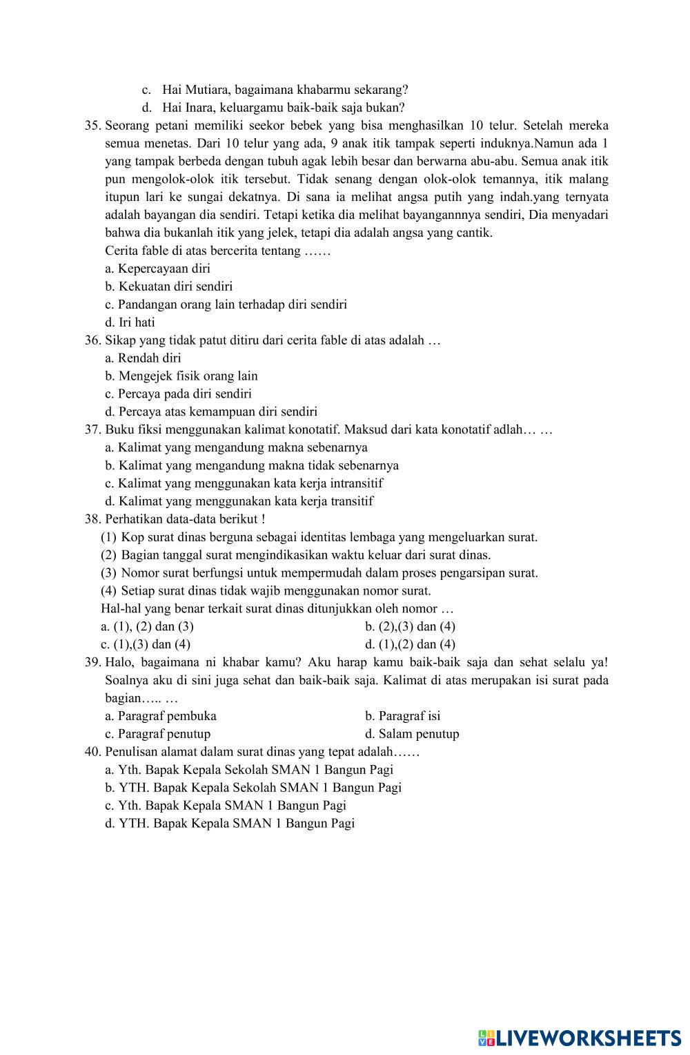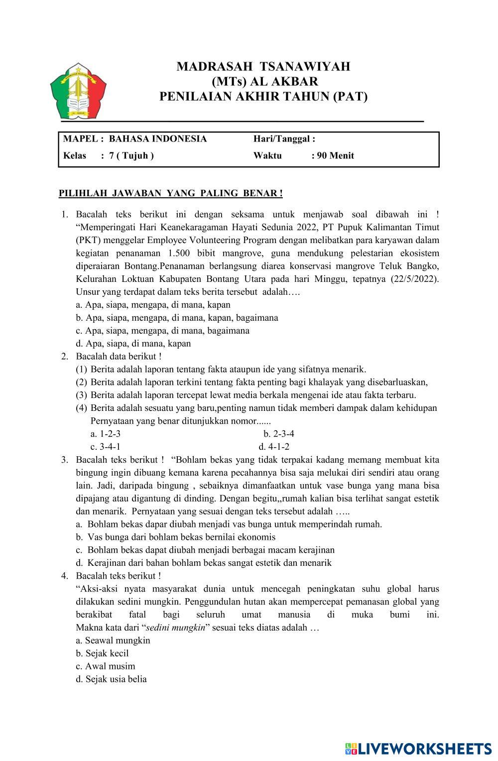 Created bylawan Bahasa Indonesia Soal PAT Bahasa Indonesia Age 14-18 level: 7 Indonesian Author's Instructions My Google Classroom Courses × 0 classes selected (0 students total) Quick Access Select all classes (0 classes) All Classes Loading courses... Cancel Share Share to selected Course __COURSE_NAME__ __STUDENT_NAME__ (__STUDENT_EMAIL__) PAT 7 B.INDO Download Worksheet Validation Check my answers Emails my answers to my teacher Full name Group/level School subject Teacher's email or key code Close Submit Validating worksheet... (12) Your answers have been sent to your teacher. Good luck! OK We encountered an error submitting your answers. Please try again. OK Advertisement | Go Ad Free Created bylawan Bahasa Indonesia Soal PAT Bahasa Indonesia Age 14-18 level: 7 Indonesian Author's Instructions