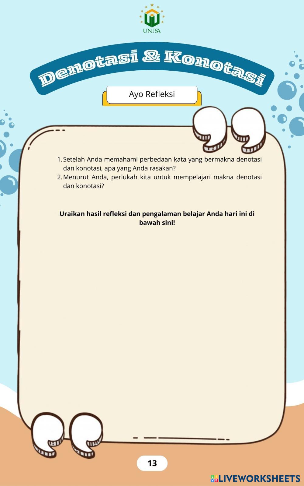 Created byNADIA MARDLOTILLAH Bahasa Indonesia Konotasi dan Denotasi Age 10-18 level: Sekolah Dasar Indonesian Author's Instructions My Google Classroom Courses × 0 classes selected (0 students total) Quick Access Select all classes (0 classes) All Classes Loading courses... Cancel Share Share to selected Course __COURSE_NAME__ __STUDENT_NAME__ (__STUDENT_EMAIL__) refleksi denotasi Download Worksheet Validation Check my answers Emails my answers to my teacher Full name Group/level School subject Teacher's email or key code Close Submit Validating worksheet... (12) Your answers have been sent to your teacher. Good luck! OK We encountered an error submitting your answers. Please try again. OK Advertisement | Go Ad Free Created byNADIA MARDLOTILLAH Bahasa Indonesia Konotasi dan Denotasi Age 10-18 level: Sekolah Dasar Indonesian Author's Instructions