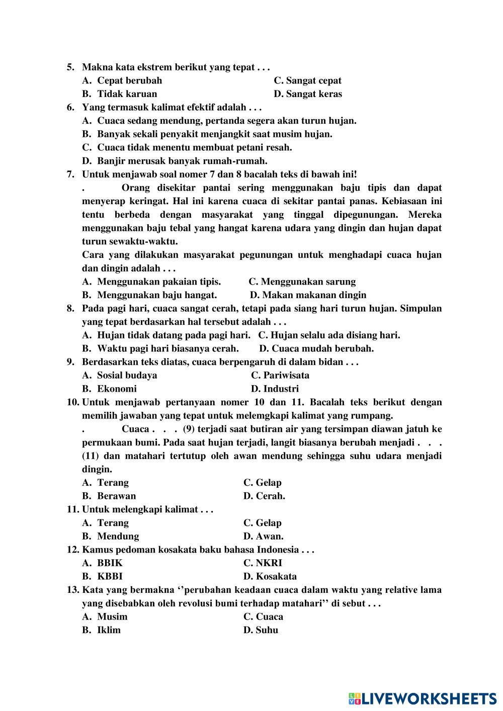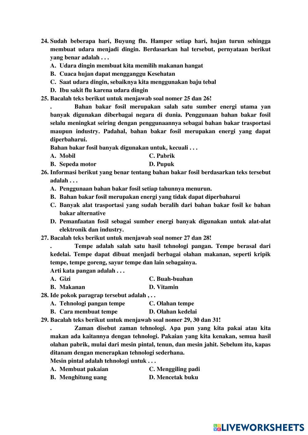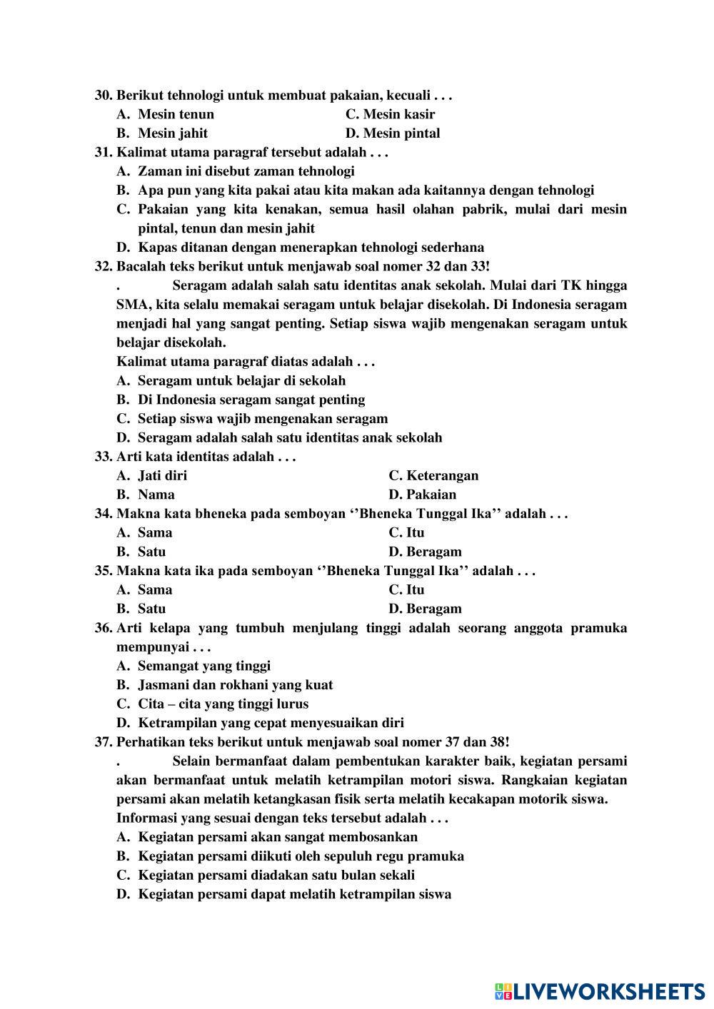 Created by sitiebar Bahasa Indonesia Soal PAT Bahasa Indonesia Age 8-13 level: 3 Indonesian Author's Instructions My Google Classroom Courses × 0 classes selected (0 students total) Quick Access Select all classes (0 classes) All Classes Loading courses... Cancel Share Share to selected Course __COURSE_NAME__ __STUDENT_NAME__ (__STUDENT_EMAIL__) MI. HID. MUB. DEMPEL Download Worksheet Validation Check my answers Emails my answers to my teacher Full name Group/level School subject Teacher's email or key code Close Submit Validating worksheet... (12) Your answers have been sent to your teacher. Good luck! OK We encountered an error submitting your answers. Please try again. OK Advertisement | Go Ad Free Created by sitiebar Bahasa Indonesia Soal PAT Bahasa Indonesia Age 8-13 level: 3 Indonesian Author's Instructions