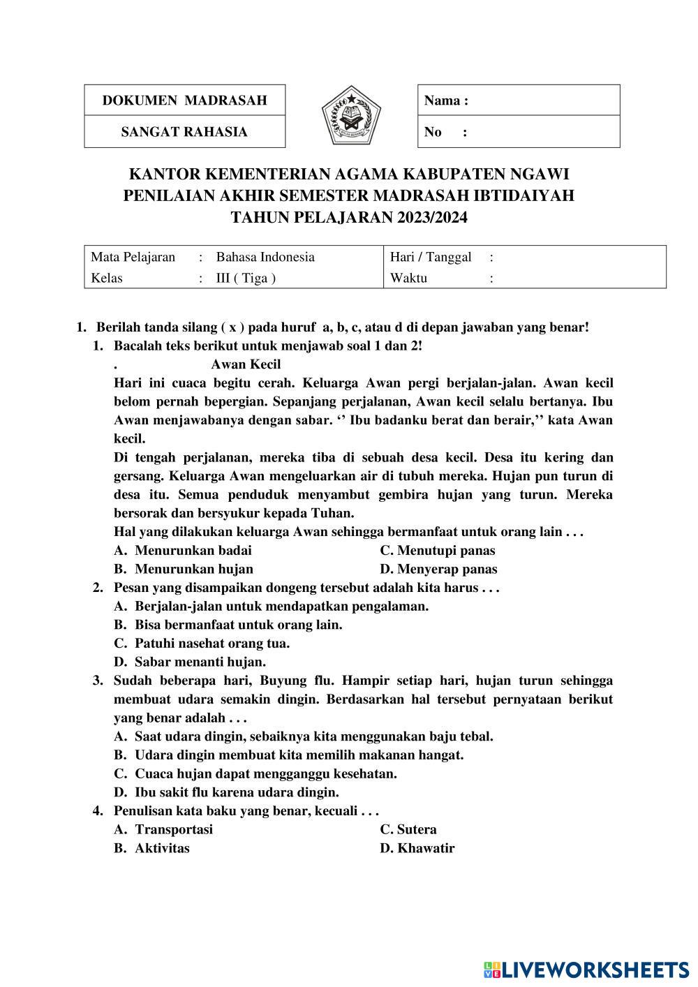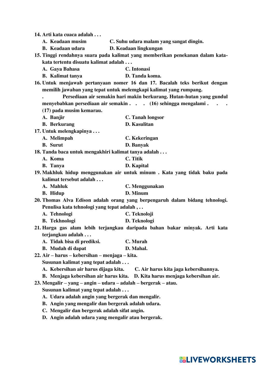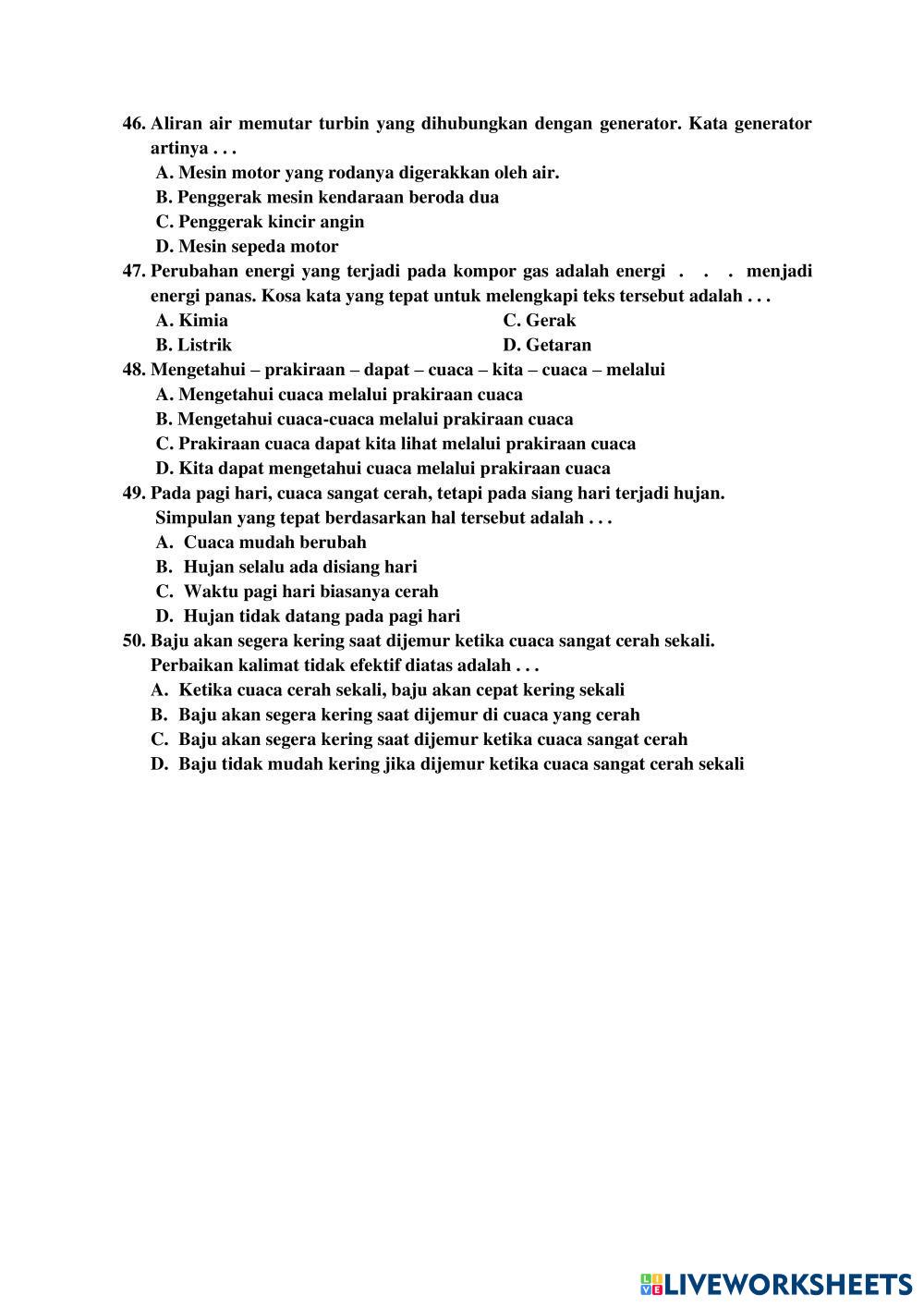 Created by sitiebar Bahasa Indonesia Soal PAT Bahasa Indonesia Age 8-13 level: 3 Indonesian Author's Instructions My Google Classroom Courses × 0 classes selected (0 students total) Quick Access Select all classes (0 classes) All Classes Loading courses... Cancel Share Share to selected Course __COURSE_NAME__ __STUDENT_NAME__ (__STUDENT_EMAIL__) MI. HID. MUB. DEMPEL Download Worksheet Validation Check my answers Emails my answers to my teacher Full name Group/level School subject Teacher's email or key code Close Submit Validating worksheet... (12) Your answers have been sent to your teacher. Good luck! OK We encountered an error submitting your answers. Please try again. OK Advertisement | Go Ad Free Created by sitiebar Bahasa Indonesia Soal PAT Bahasa Indonesia Age 8-13 level: 3 Indonesian Author's Instructions