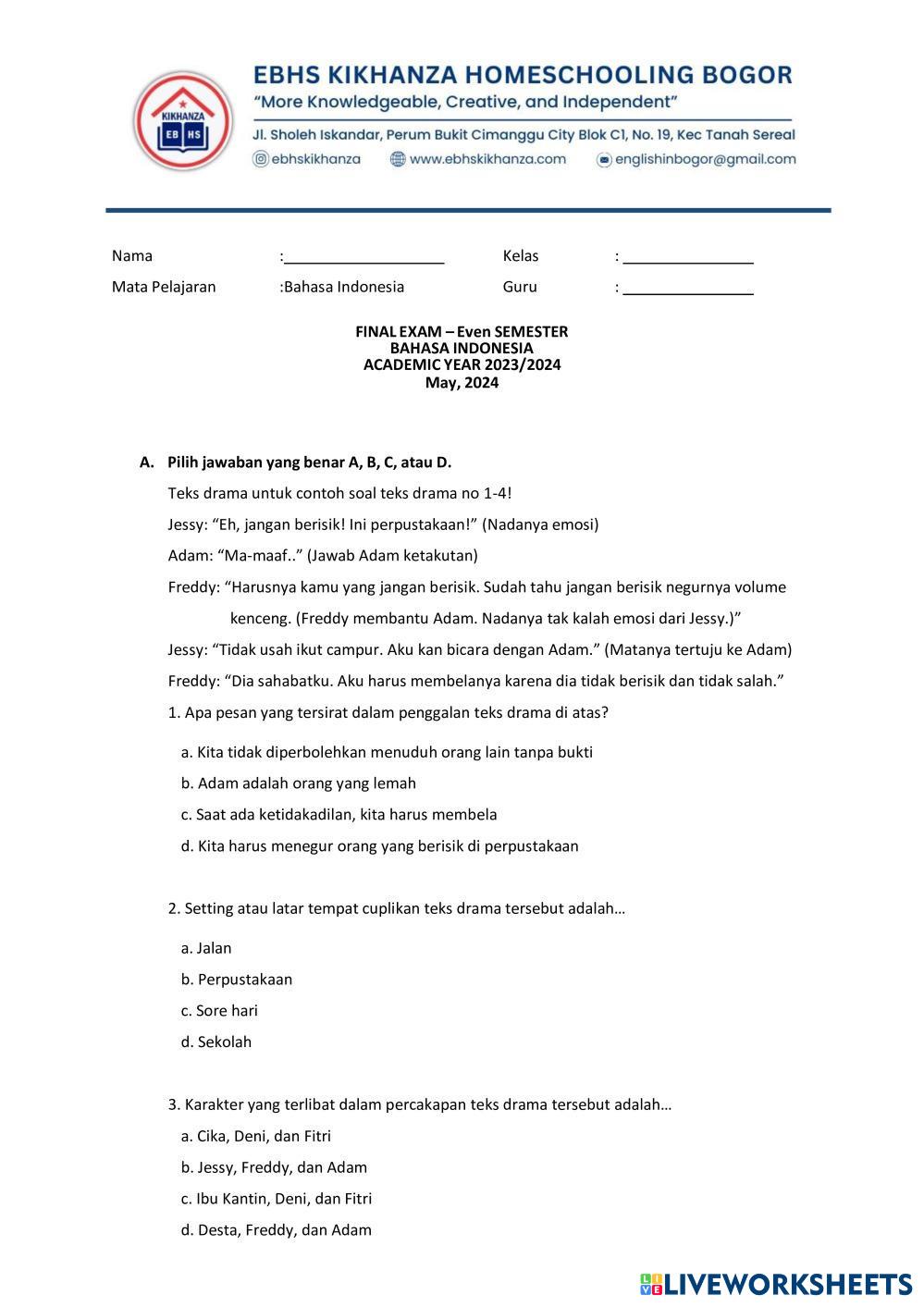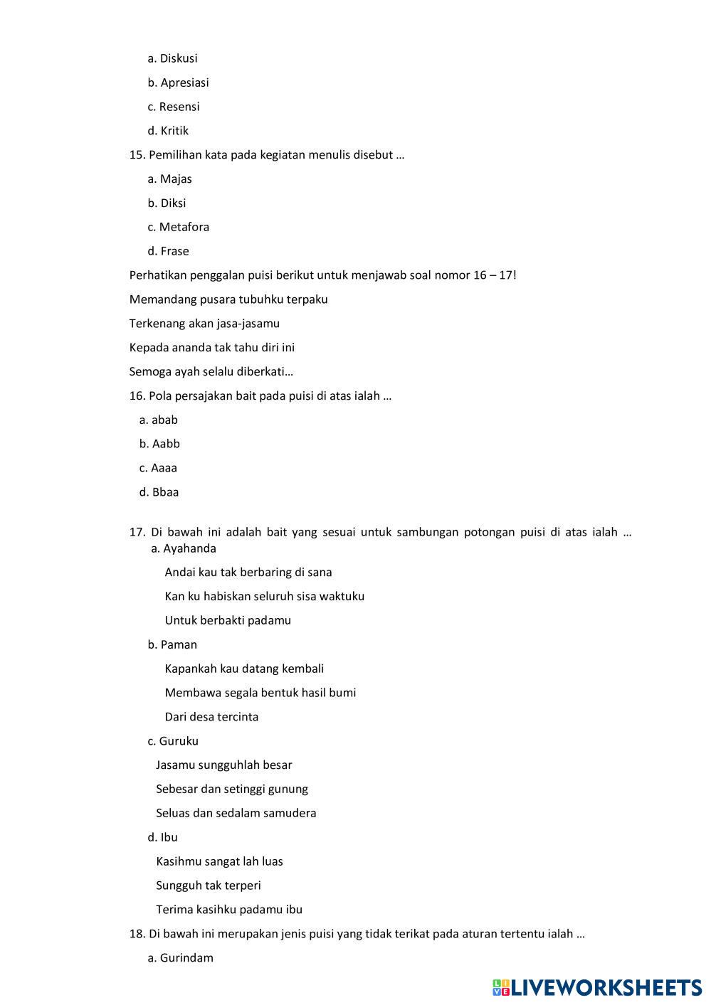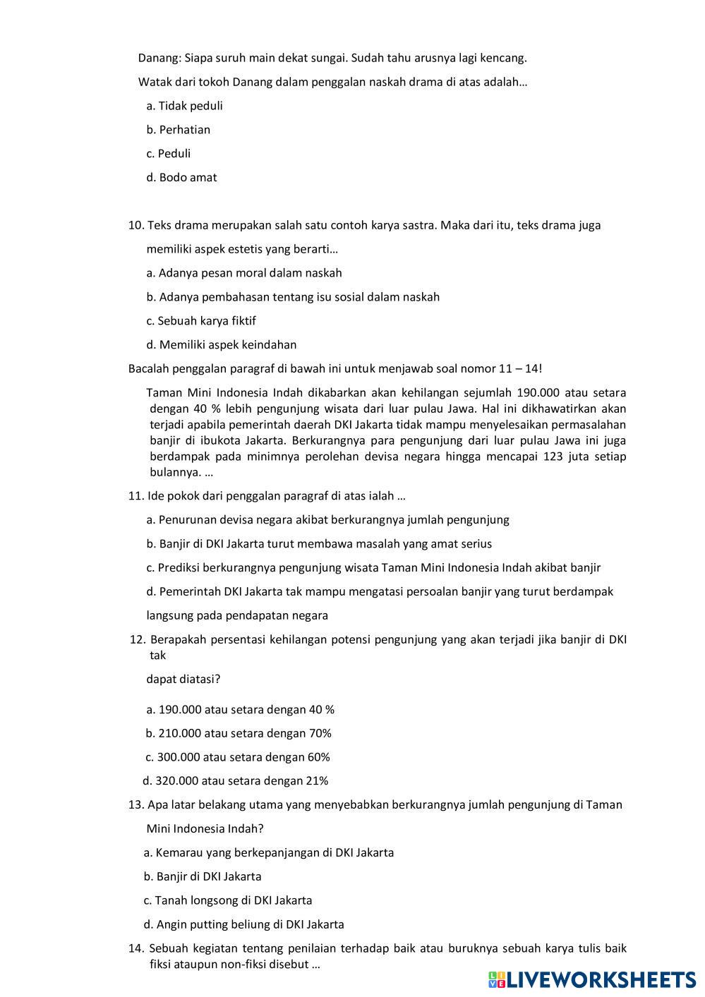 Created byRian Muhamad Apriandi Bahasa Indonesia Penilaian Akhir Semester Age 12-18 level: 8 Indonesian Author's Instructions My Google Classroom Courses × 0 classes selected (0 students total) Quick Access Select all classes (0 classes) All Classes Loading courses... Cancel Share Share to selected Course __COURSE_NAME__ __STUDENT_NAME__ (__STUDENT_EMAIL__) Penilaian Akhir Semester Bahasa Indonesia Kelas 2 SMP Download Worksheet Validation Check my answers Emails my answers to my teacher Full name Group/level School subject Teacher's email or key code Close Submit Validating worksheet... (12) Your answers have been sent to your teacher. Good luck! OK We encountered an error submitting your answers. Please try again. OK Advertisement | Go Ad Free Created byRian Muhamad Apriandi Bahasa Indonesia Penilaian Akhir Semester Age 12-18 level: 8 Indonesian Author's Instructions