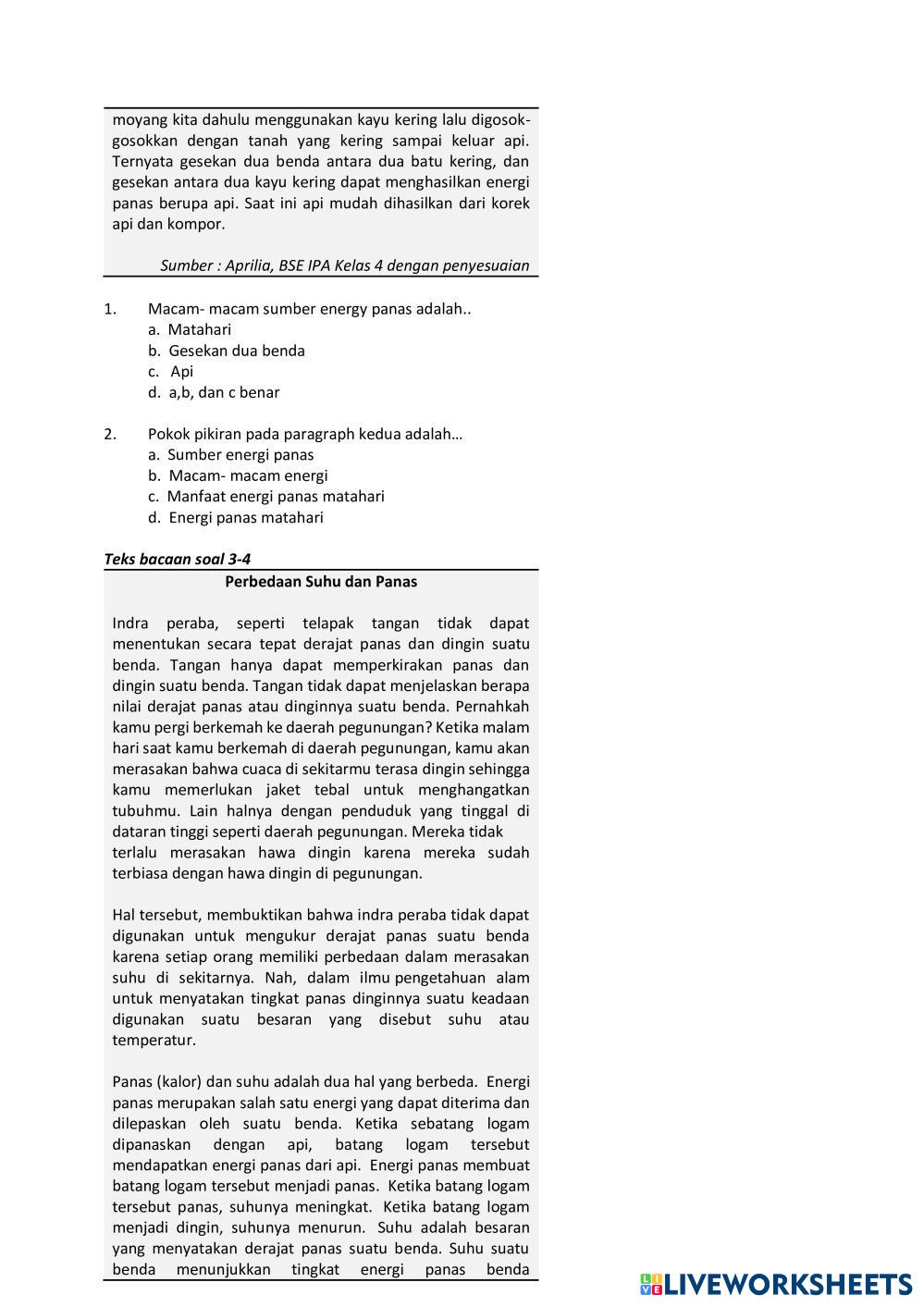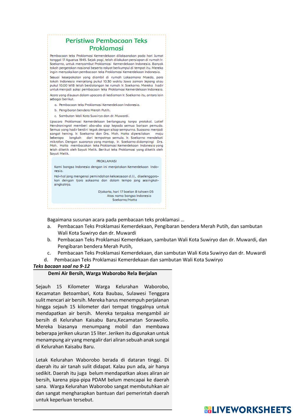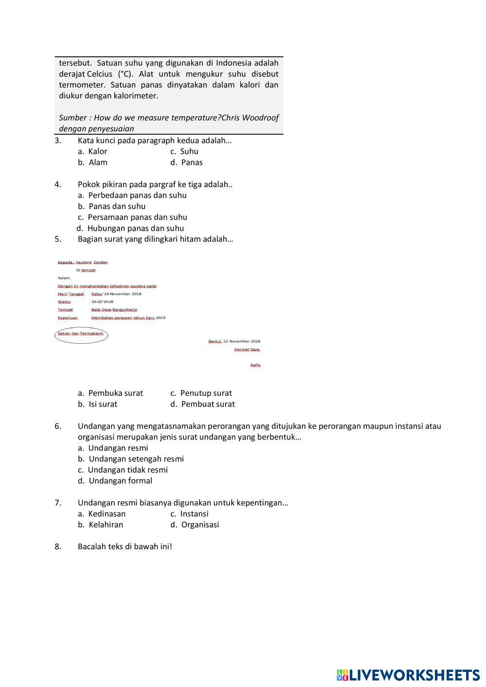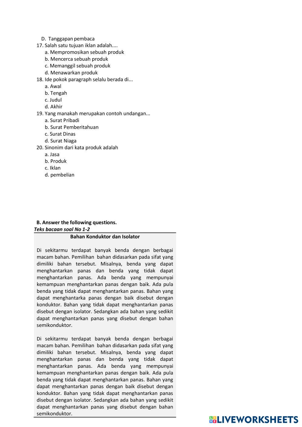Created byRian Muhamad Apriandi Bahasa Indonesia Penilaian Tengah Semester Age 12-18 level: 5 Indonesian Author's Instructions My Google Classroom Courses × 0 classes selected (0 students total) Quick Access Select all classes (0 classes) All Classes Loading courses... Cancel Share Share to selected Course __COURSE_NAME__ __STUDENT_NAME__ (__STUDENT_EMAIL__) Penilaian Akhir Semester Bahasa Indonesia Kelas 5 SD Download Worksheet Validation Check my answers Emails my answers to my teacher Full name Group/level School subject Teacher's email or key code Close Submit Validating worksheet... (12) Your answers have been sent to your teacher. Good luck! OK We encountered an error submitting your answers. Please try again. OK Advertisement | Go Ad Free Created byRian Muhamad Apriandi Bahasa Indonesia Penilaian Tengah Semester Age 12-18 level: 5 Indonesian Author's Instructions