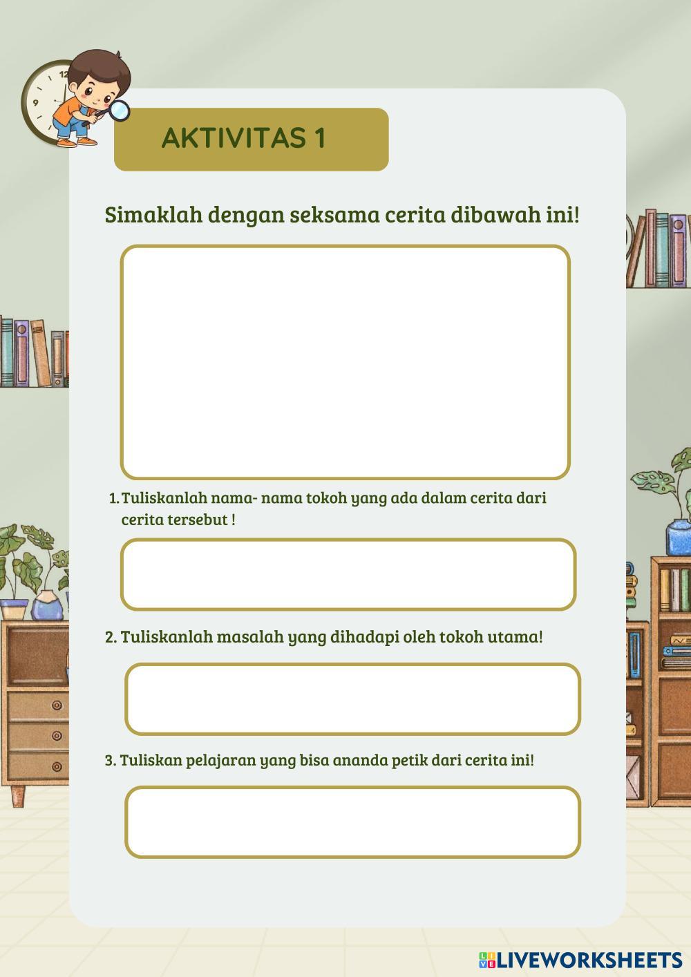 Created byFalmoza Tsabita Bahasa Indonesia Fabel Age 7-12 level: 2 Indonesian Author's Instructions My Google Classroom Courses × 0 classes selected (0 students total) Quick Access Select all classes (0 classes) All Classes Loading courses... Cancel Share Share to selected Course __COURSE_NAME__ __STUDENT_NAME__ (__STUDENT_EMAIL__) Lembar Kerja Peserta Didik Download Worksheet Validation Check my answers Emails my answers to my teacher Full name Group/level School subject Teacher's email or key code Close Submit Validating worksheet... (12) Your answers have been sent to your teacher. Good luck! OK We encountered an error submitting your answers. Please try again. OK Advertisement | Go Ad Free Created byFalmoza Tsabita Bahasa Indonesia Fabel Age 7-12 level: 2 Indonesian Author's Instructions