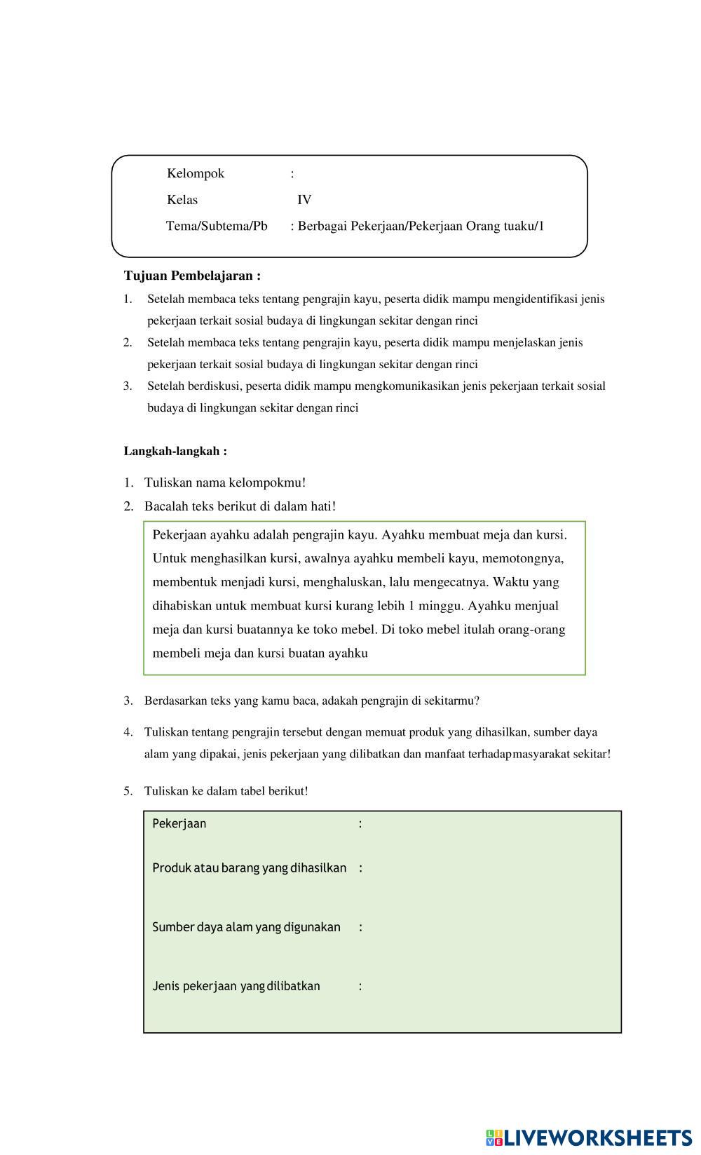 Created byNadia Datunsolang Bahasa Indonesia Tema 4 -berbagai pekerjaan- Age 7-13 level: 4 Indonesian Author's Instructions My Google Classroom Courses × 0 classes selected (0 students total) Quick Access Select all classes (0 classes) All Classes Loading courses... Cancel Share Share to selected Course __COURSE_NAME__ __STUDENT_NAME__ (__STUDENT_EMAIL__) 151422052 NADIA DATUNSOLANG Download Worksheet Validation Check my answers Emails my answers to my teacher Full name Group/level School subject Teacher's email or key code Close Submit Validating worksheet... (12) Your answers have been sent to your teacher. Good luck! OK We encountered an error submitting your answers. Please try again. OK Advertisement | Go Ad Free Created byNadia Datunsolang Bahasa Indonesia Tema 4 -berbagai pekerjaan- Age 7-13 level: 4 Indonesian Author's Instructions