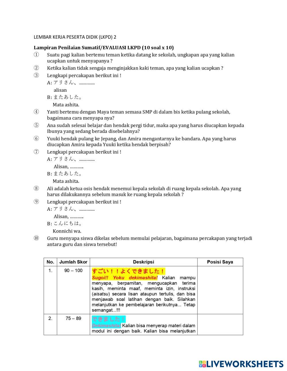Created byUsman Sulaiman BAHASA JEPANG Bahasa Jepang fase f Age 13-15 level: 11 Indonesian Author's Instructions My Google Classroom Courses × 0 classes selected (0 students total) Quick Access Select all classes (0 classes) All Classes Loading courses... Cancel Share Share to selected Course __COURSE_NAME__ __STUDENT_NAME__ (__STUDENT_EMAIL__) TES 1 Download Worksheet Validation Check my answers Emails my answers to my teacher Full name Group/level School subject Teacher's email or key code Close Submit Validating worksheet... (12) Your answers have been sent to your teacher. Good luck! OK We encountered an error submitting your answers. Please try again. OK Advertisement | Go Ad Free Created byUsman Sulaiman BAHASA JEPANG Bahasa Jepang fase f Age 13-15 level: 11 Indonesian Author's Instructions