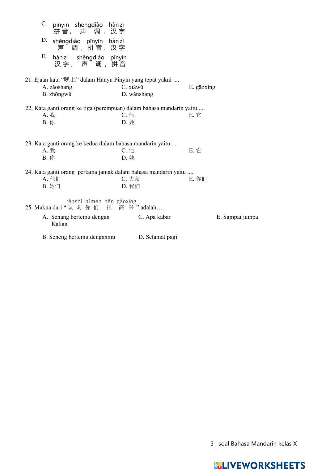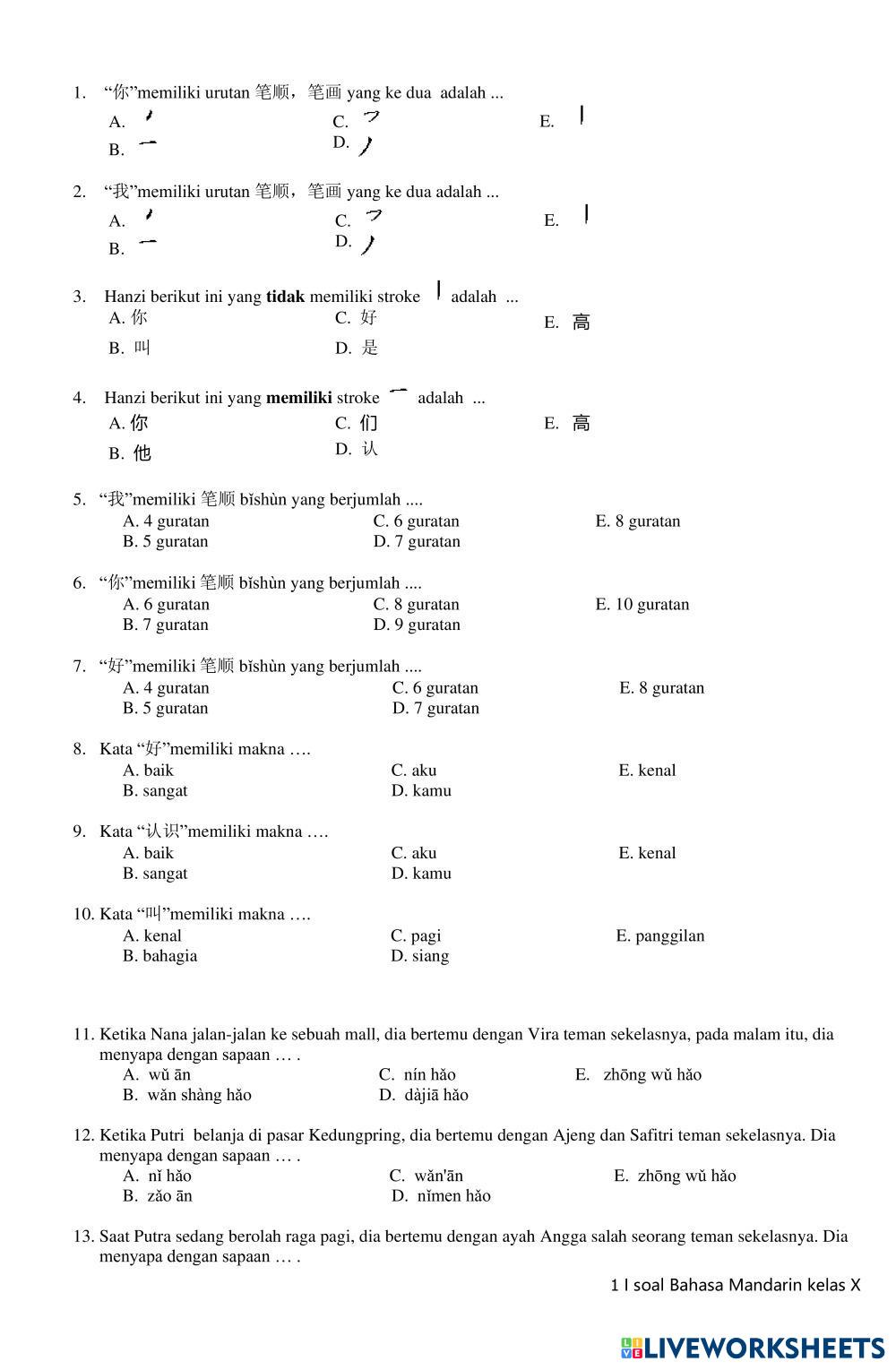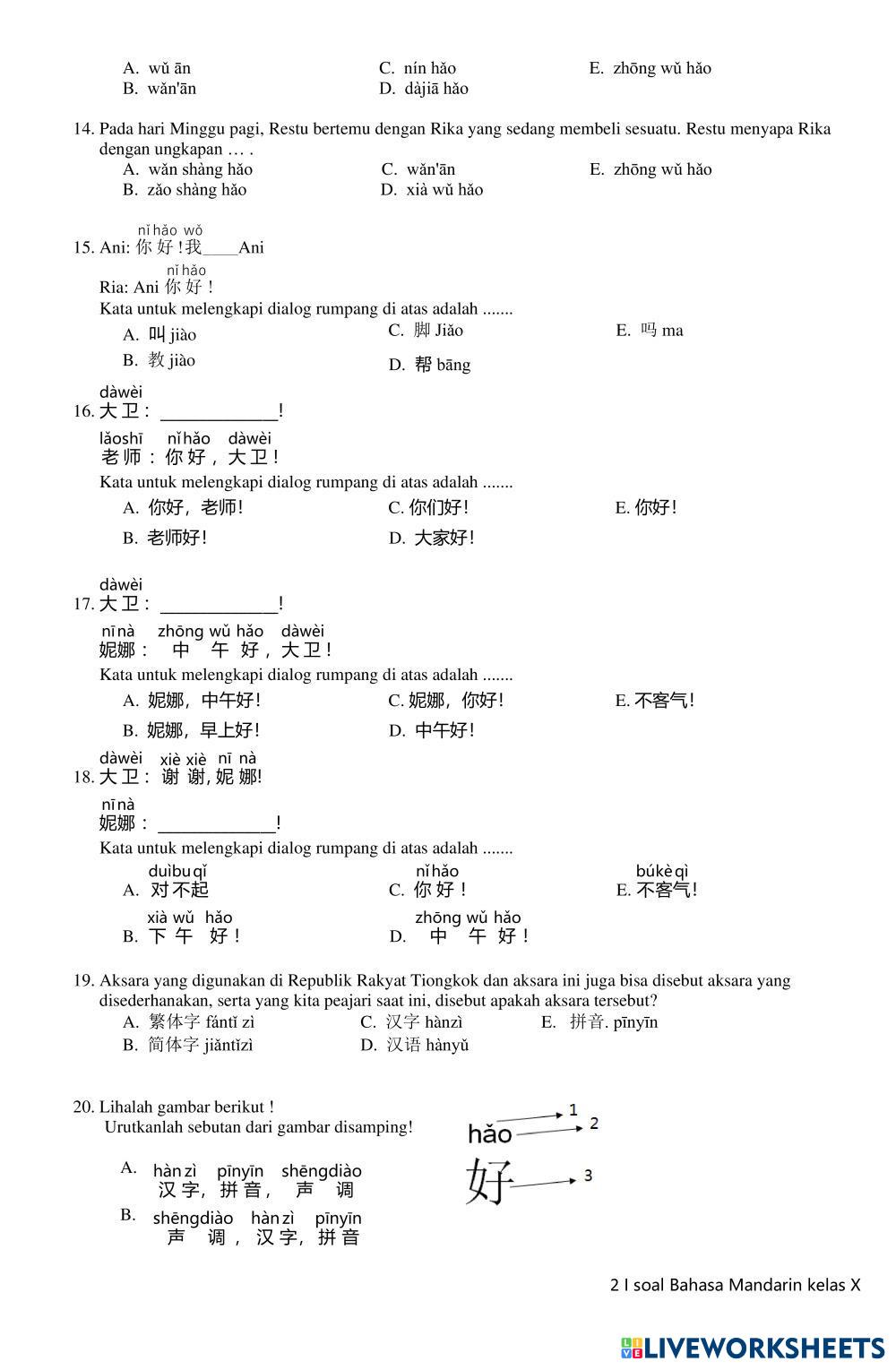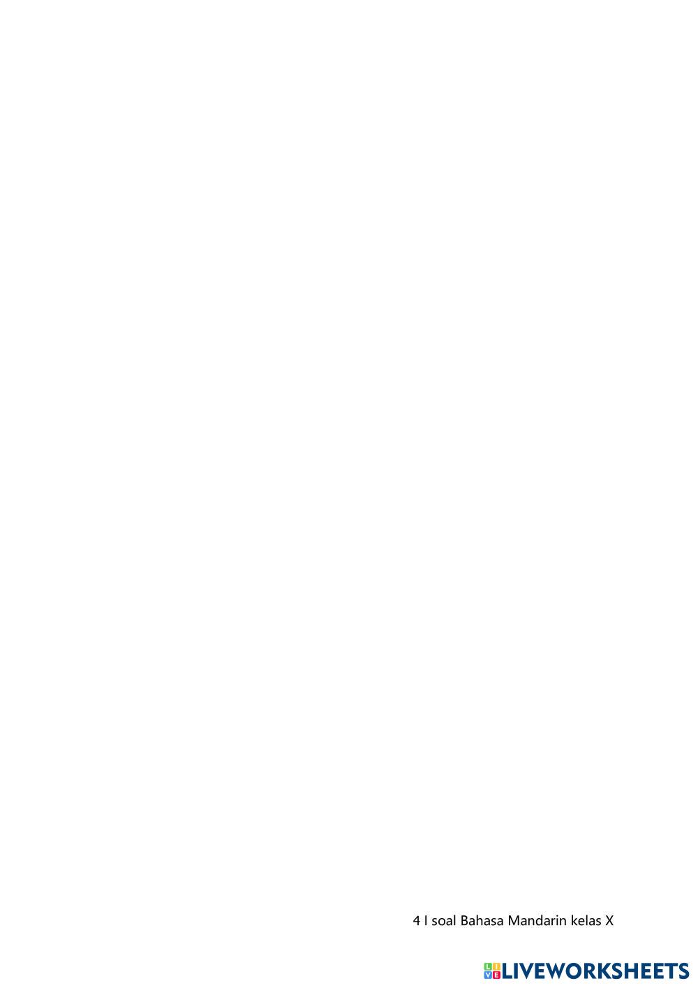 Created byvirly ningrum Bahasa Mandarin LATIHAN SOAL PSTS Age 14+ level: 1 Indonesian Author's Instructions My Google Classroom Courses × 0 classes selected (0 students total) Quick Access Select all classes (0 classes) All Classes Loading courses... Cancel Share Share to selected Course __COURSE_NAME__ __STUDENT_NAME__ (__STUDENT_EMAIL__) LATIAN PSTS Download Worksheet Validation Check my answers Emails my answers to my teacher Full name Group/level School subject Teacher's email or key code Close Submit Validating worksheet... (12) Your answers have been sent to your teacher. Good luck! OK We encountered an error submitting your answers. Please try again. OK Advertisement | Go Ad Free Created byvirly ningrum Bahasa Mandarin LATIHAN SOAL PSTS Age 14+ level: 1 Indonesian Author's Instructions