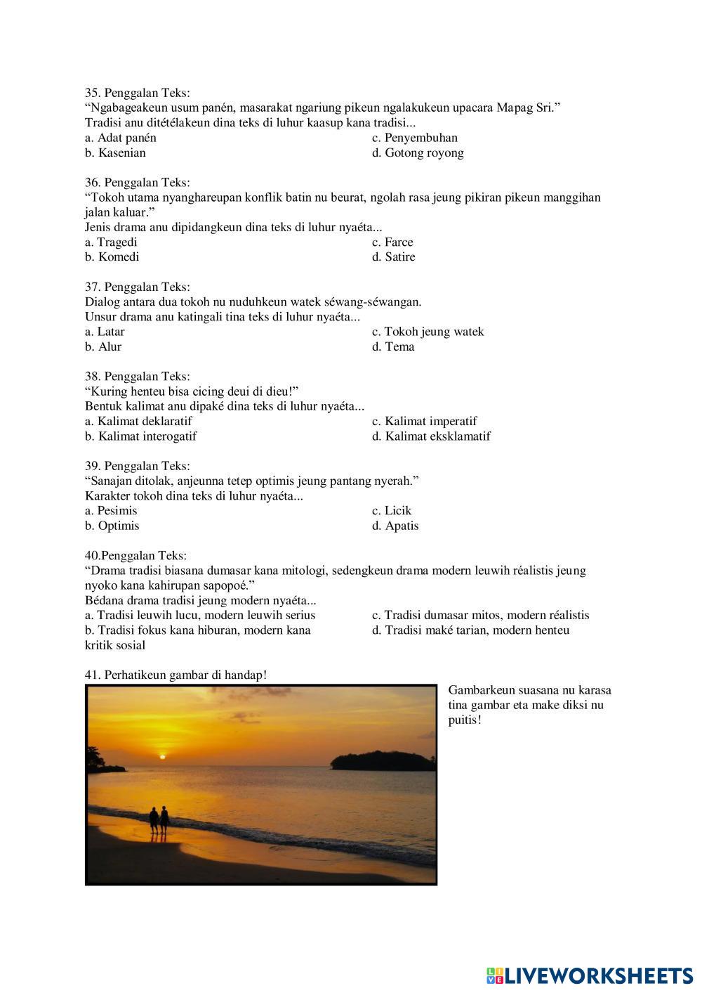 Created byDeni Mulyana Bahasa Sunda Bahasa Sunda Age 17+ level: 12 Indonesian Author's Instructions My Google Classroom Courses × 0 classes selected (0 students total) Quick Access Select all classes (0 classes) All Classes Loading courses... Cancel Share Share to selected Course __COURSE_NAME__ __STUDENT_NAME__ (__STUDENT_EMAIL__) PSAJ BAHASA SUNDA KURMER KELAS XII Download Worksheet Validation Check my answers Emails my answers to my teacher Full name Group/level School subject Teacher's email or key code Close Submit Validating worksheet... (12) Your answers have been sent to your teacher. Good luck! OK We encountered an error submitting your answers. Please try again. OK Advertisement | Go Ad Free Created byDeni Mulyana Bahasa Sunda Bahasa Sunda Age 17+ level: 12 Indonesian Author's Instructions