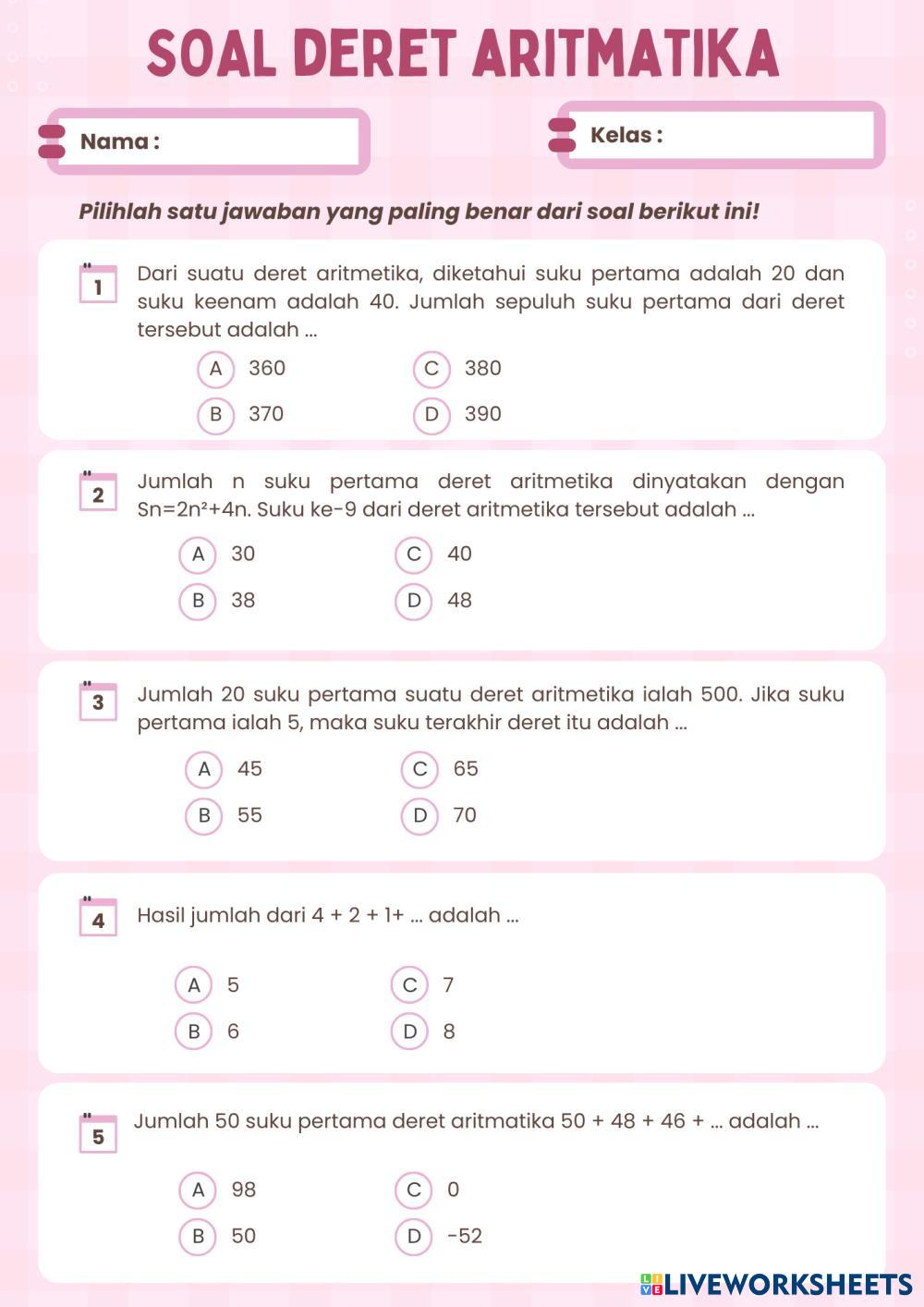 Created byLaras Sati Kusuma Putri barisan dan deret aritmatika barisan dan deret aritmatika Age 10+ level: 4 Indonesian Author's Instructions My Google Classroom Courses × 0 classes selected (0 students total) Quick Access Select all classes (0 classes) All Classes Loading courses... Cancel Share Share to selected Course __COURSE_NAME__ __STUDENT_NAME__ (__STUDENT_EMAIL__) Deret Aritmatika Download Worksheet Validation Check my answers Emails my answers to my teacher Full name Group/level School subject Teacher's email or key code Close Submit Validating worksheet... (12) Your answers have been sent to your teacher. Good luck! OK We encountered an error submitting your answers. Please try again. OK Advertisement | Go Ad Free Created byLaras Sati Kusuma Putri barisan dan deret aritmatika barisan dan deret aritmatika Age 10+ level: 4 Indonesian Author's Instructions