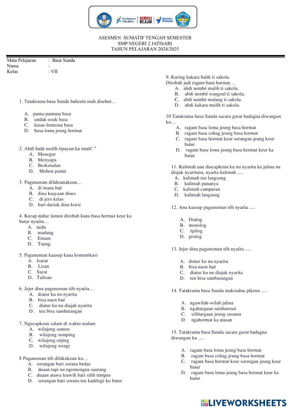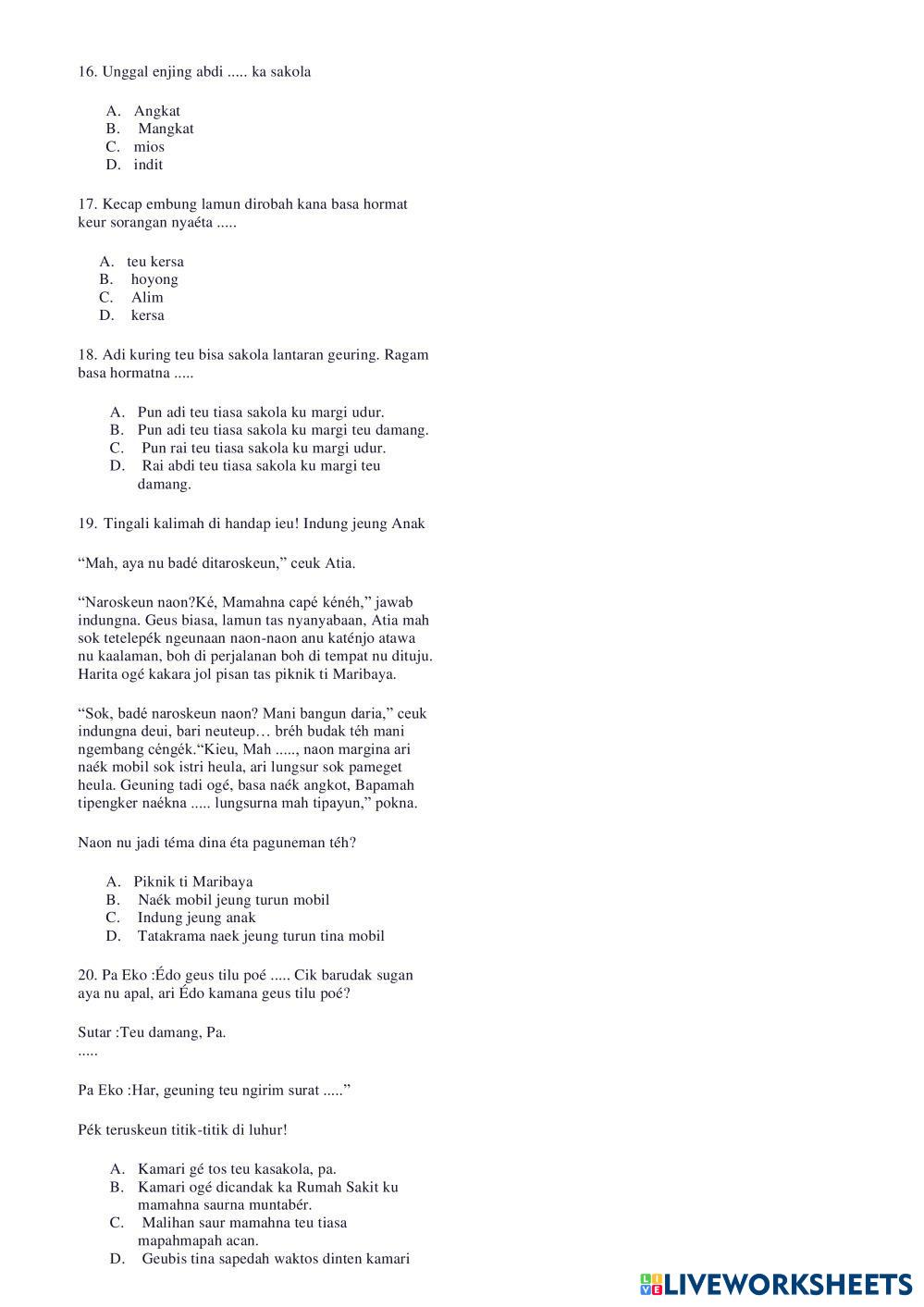 Created bySMP Negeri 2 Jatisari Basa Sunda ASTS BASA Age 10-18 level: VII Indonesian Author's Instructions My Google Classroom Courses × 0 classes selected (0 students total) Quick Access Select all classes (0 classes) All Classes Loading courses... Cancel Share Share to selected Course __COURSE_NAME__ __STUDENT_NAME__ (__STUDENT_EMAIL__) ASTS Basa Sunda Kelas VII Download Worksheet Validation Check my answers Emails my answers to my teacher Full name Group/level School subject Teacher's email or key code Close Submit Validating worksheet... (12) Your answers have been sent to your teacher. Good luck! OK We encountered an error submitting your answers. Please try again. OK Advertisement | Go Ad Free Created bySMP Negeri 2 Jatisari Basa Sunda ASTS BASA Age 10-18 level: VII Indonesian Author's Instructions