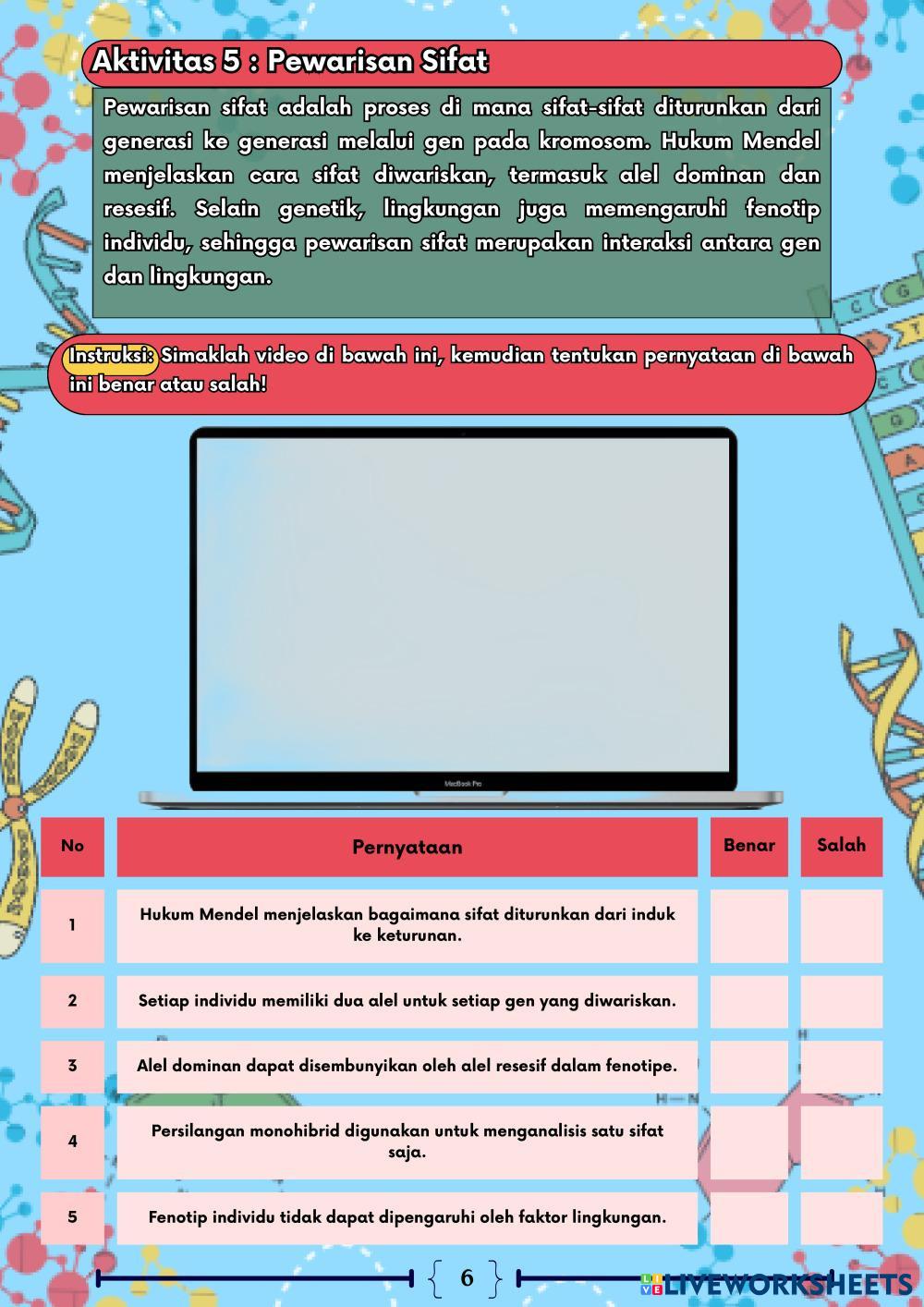 - Aktivitas 5: Menyimak Video dan Menjawab Pernyataan Benar/Salah – Siswa menyaksikan video YouTube yang menjelaskan proses atau konsep terkait genetika (misalnya, replikasi DNA atau pewarisan sifat) dan kemudian menjawab pernyataan benar atau salah berdasarkan isi video. Aktivitas ini melatih kemampuan mendengarkan serta memastikan pemahaman siswa tentang materi yang disajikan secara audio-visual.