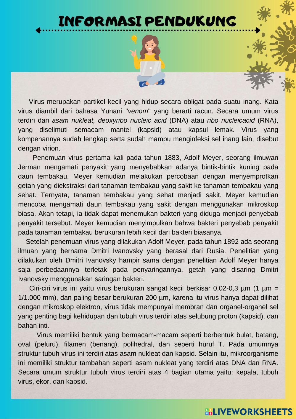 Created bySusi Helen Biologi SMA BIOLOGI Age 14+ level: x Indonesian Author's Instructions My Google Classroom Courses × 0 classes selected (0 students total) Quick Access Select all classes (0 classes) All Classes Loading courses... Cancel Share Share to selected Course __COURSE_NAME__ __STUDENT_NAME__ (__STUDENT_EMAIL__) struktur virus Download Worksheet Validation Check my answers Emails my answers to my teacher Full name Group/level School subject Teacher's email or key code Close Submit Validating worksheet... (12) Your answers have been sent to your teacher. Good luck! OK We encountered an error submitting your answers. Please try again. OK Advertisement | Go Ad Free Created bySusi Helen Biologi SMA BIOLOGI Age 14+ level: x Indonesian Author's Instructions