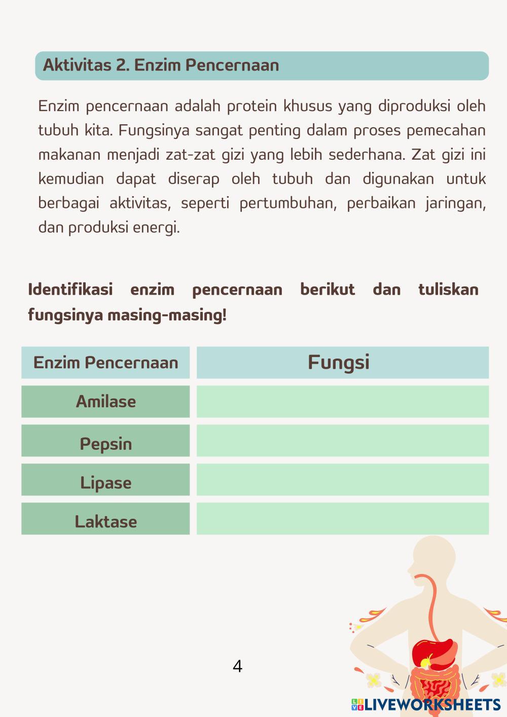 Sistem pencernaan adalah serangkaian organ dalam tubuh yang bekerja sama untuk mengolah makanan menjadi nutrisi yang dapat diserap oleh tubuh. Proses ini dimulai dari saat kita memasukkan makanan ke dalam mulut hingga sisa makanan yang tidak terpakai dikeluarkan dari tubuh melalui anus. Selain itu juga pada sistem pencernaan ini terdapat fungsi organ dan enzim, serta pentingnya memahami gangguan pencernaan dan kebutuhan nutrisi.