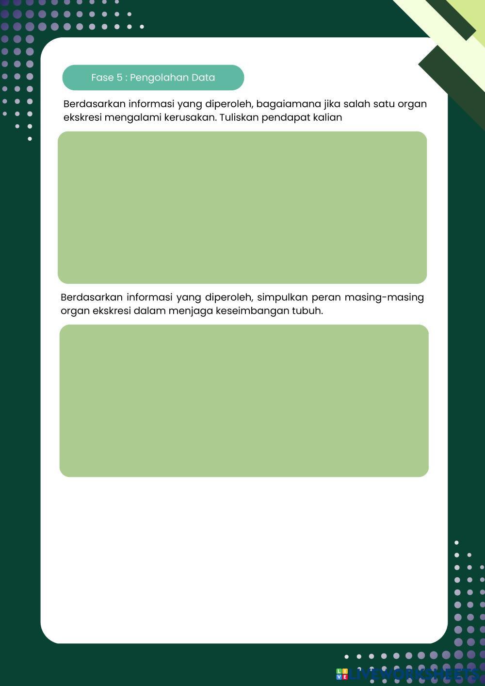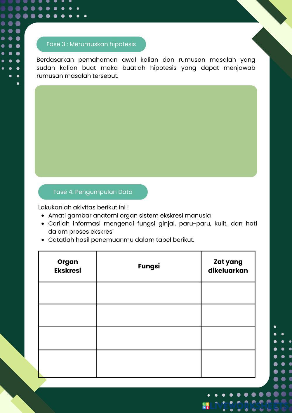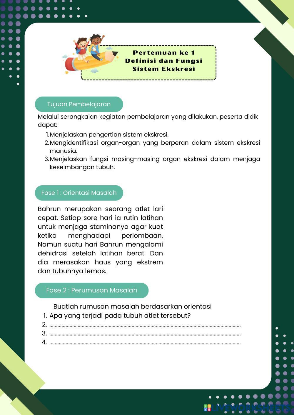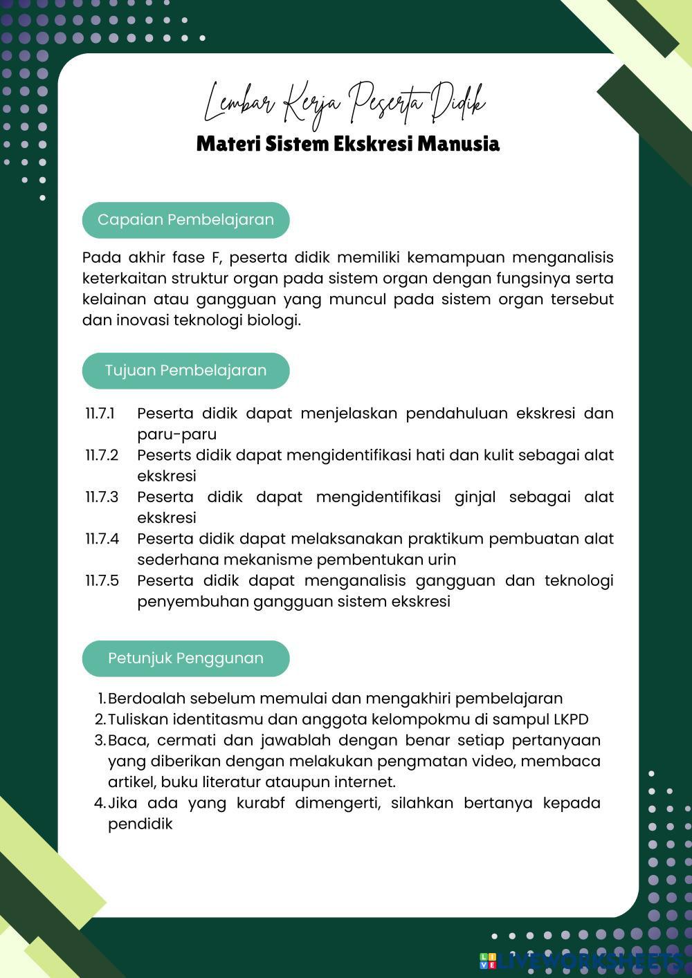 Created byFrasa Puspita Dewi Biology lesson definition and function of the excretory system Age 16+ level: 11 Indonesian Author's Instructions My Google Classroom Courses × 0 classes selected (0 students total) Quick Access Select all classes (0 classes) All Classes Loading courses... Cancel Share Share to selected Course __COURSE_NAME__ __STUDENT_NAME__ (__STUDENT_EMAIL__) Pertemuan 1 Sistem Ekskresi Download Worksheet Validation Check my answers Emails my answers to my teacher Full name Group/level School subject Teacher's email or key code Close Submit Validating worksheet... (12) Your answers have been sent to your teacher. Good luck! OK We encountered an error submitting your answers. Please try again. OK Advertisement | Go Ad Free Created byFrasa Puspita Dewi Biology lesson definition and function of the excretory system Age 16+ level: 11 Indonesian Author's Instructions