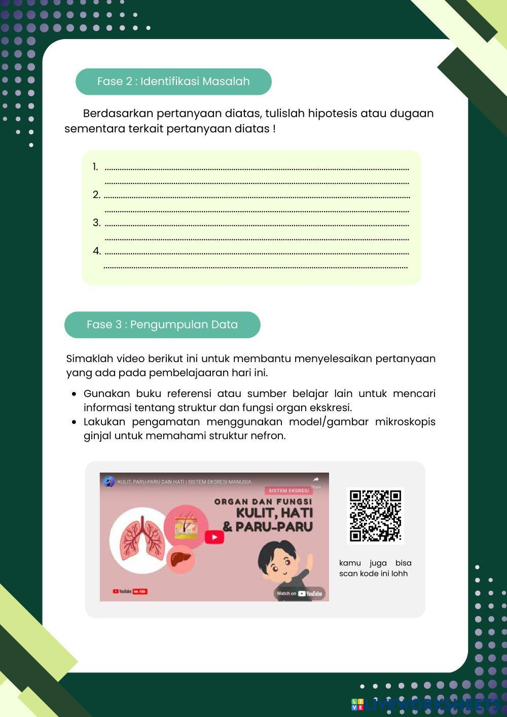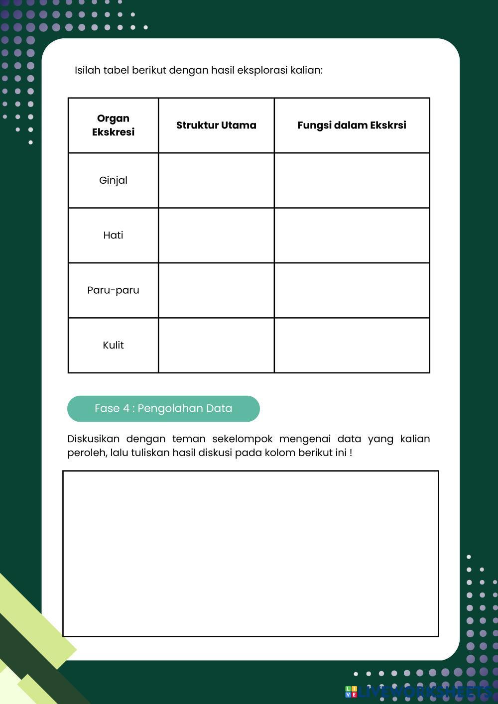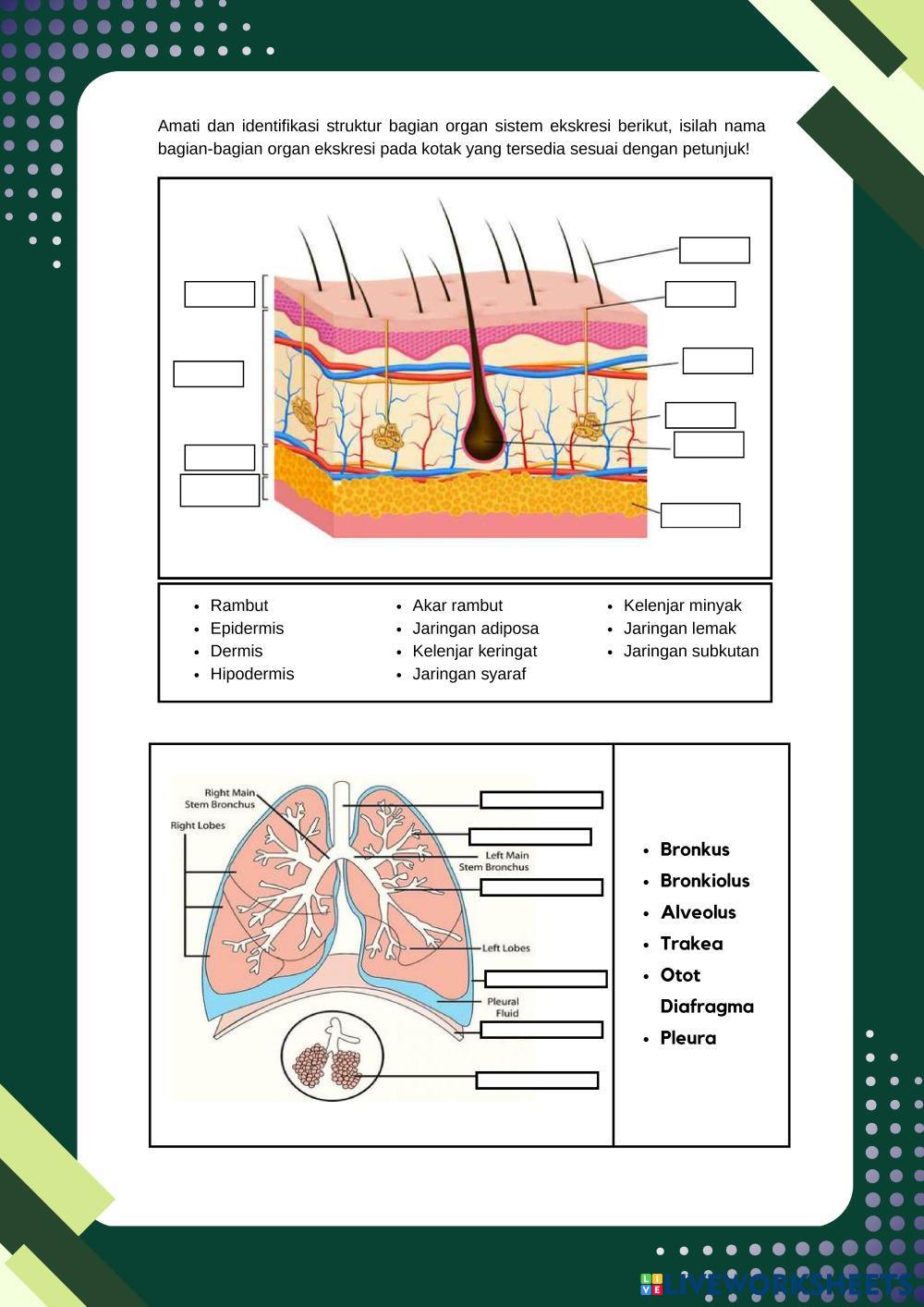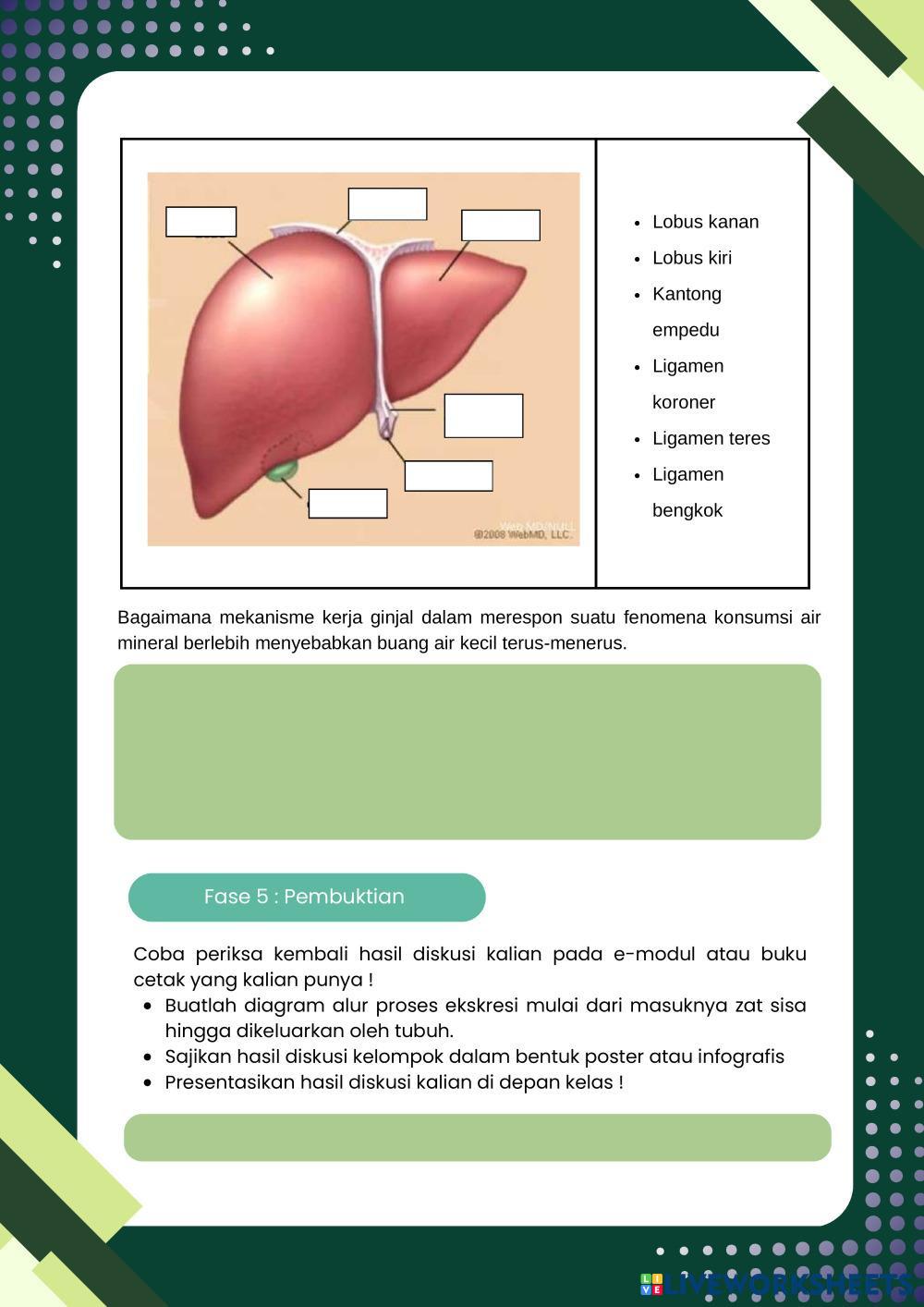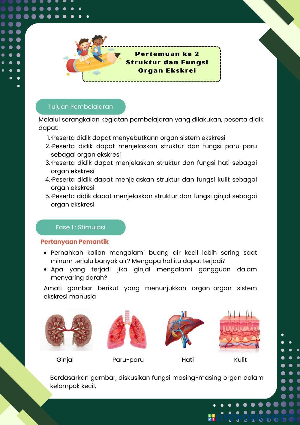 Created byFrasa Puspita Dewi Biology lesson struktur dan fungsi organ sistem ekskresi Age 16+ level: 11 Indonesian Author's Instructions My Google Classroom Courses × 0 classes selected (0 students total) Quick Access Select all classes (0 classes) All Classes Loading courses... Cancel Share Share to selected Course __COURSE_NAME__ __STUDENT_NAME__ (__STUDENT_EMAIL__) Pertemuan 2 Sistem Ekskresi Download Worksheet Validation Check my answers Emails my answers to my teacher Full name Group/level School subject Teacher's email or key code Close Submit Validating worksheet... (12) Your answers have been sent to your teacher. Good luck! OK We encountered an error submitting your answers. Please try again. OK Advertisement | Go Ad Free Created byFrasa Puspita Dewi Biology lesson struktur dan fungsi organ sistem ekskresi Age 16+ level: 11 Indonesian Author's Instructions