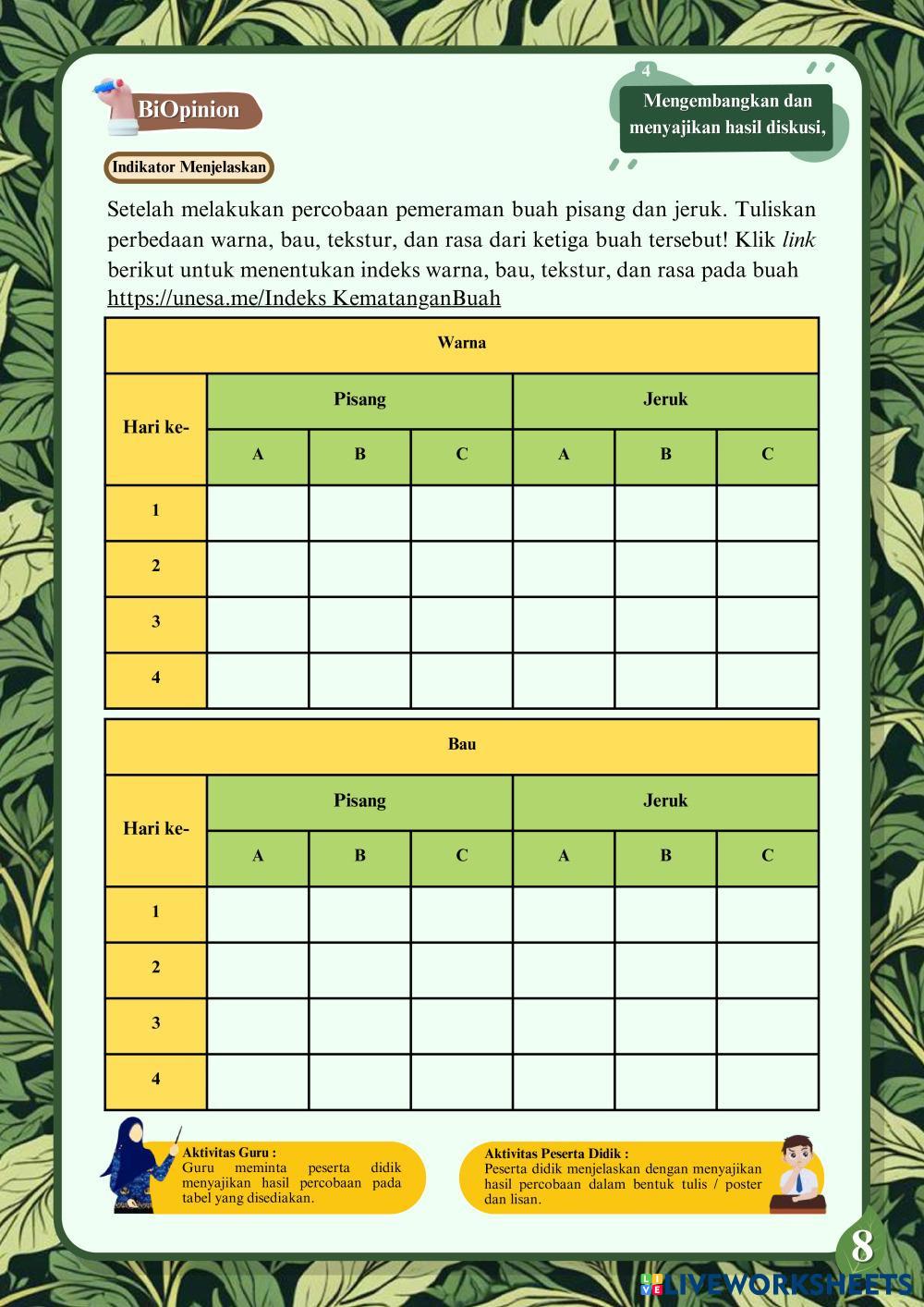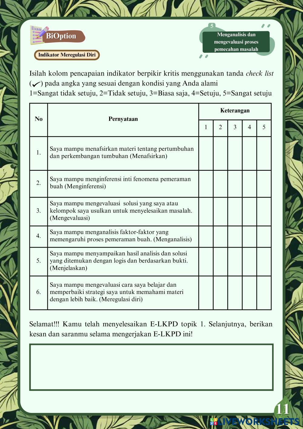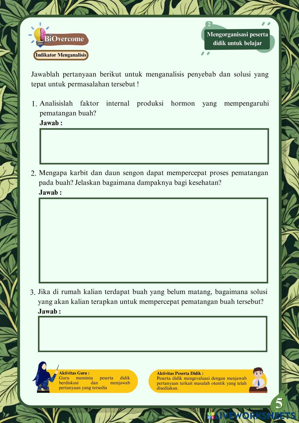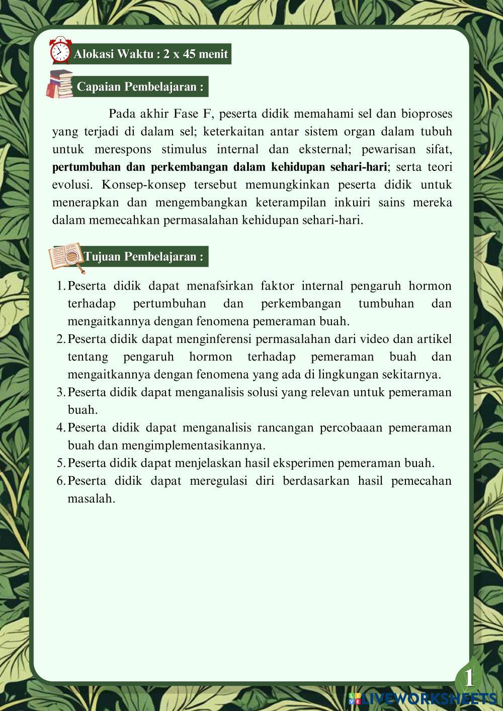 Created byTika Awwalus Sholihah BIOLOGY PERTUMBUHAN DAN PERKEMBANGAN Age 16+ level: 12 Indonesian Author's Instructions My Google Classroom Courses × 0 classes selected (0 students total) Quick Access Select all classes (0 classes) All Classes Loading courses... Cancel Share Share to selected Course __COURSE_NAME__ __STUDENT_NAME__ (__STUDENT_EMAIL__) E-LKPD KEGIATAN 1 FAKTOR INTERNAL PERTUMBUHAN DAN PERKEMBANGAN TUMBUHAN Download Worksheet Validation Check my answers Emails my answers to my teacher Full name Group/level School subject Teacher's email or key code Close Submit Validating worksheet... (12) Your answers have been sent to your teacher. Good luck! OK We encountered an error submitting your answers. Please try again. OK Advertisement | Go Ad Free Created byTika Awwalus Sholihah BIOLOGY PERTUMBUHAN DAN PERKEMBANGAN Age 16+ level: 12 Indonesian Author's Instructions