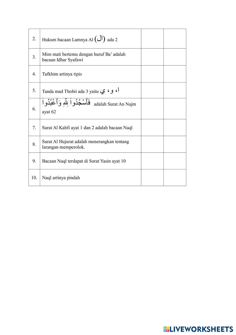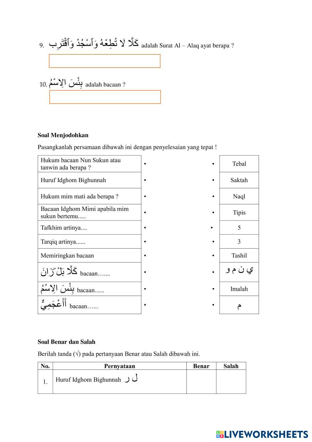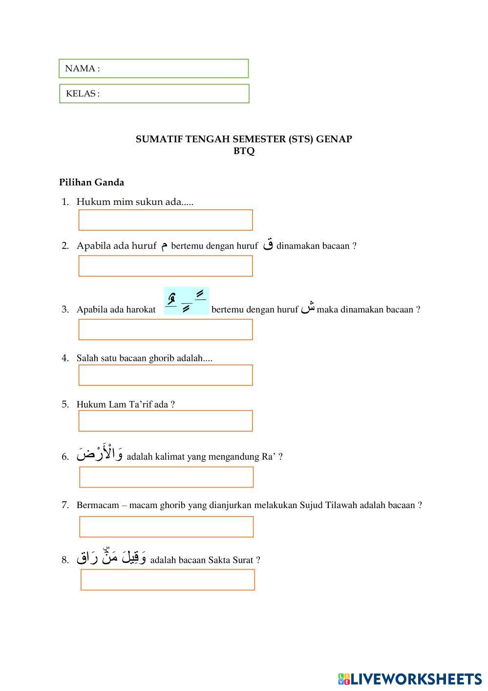 Created byNur lailiyah BTQ Tajwid Age 13-18 level: Kelas 9 Indonesian Author's Instructions My Google Classroom Courses × 0 classes selected (0 students total) Quick Access Select all classes (0 classes) All Classes Loading courses... Cancel Share Share to selected Course __COURSE_NAME__ __STUDENT_NAME__ (__STUDENT_EMAIL__) SUMATIF TENGAH SEMESTER GENAP KELAS 9 BTQ Download Worksheet Validation Check my answers Emails my answers to my teacher Full name Group/level School subject Teacher's email or key code Close Submit Validating worksheet... (12) Your answers have been sent to your teacher. Good luck! OK We encountered an error submitting your answers. Please try again. OK Advertisement | Go Ad Free Created byNur lailiyah BTQ Tajwid Age 13-18 level: Kelas 9 Indonesian Author's Instructions