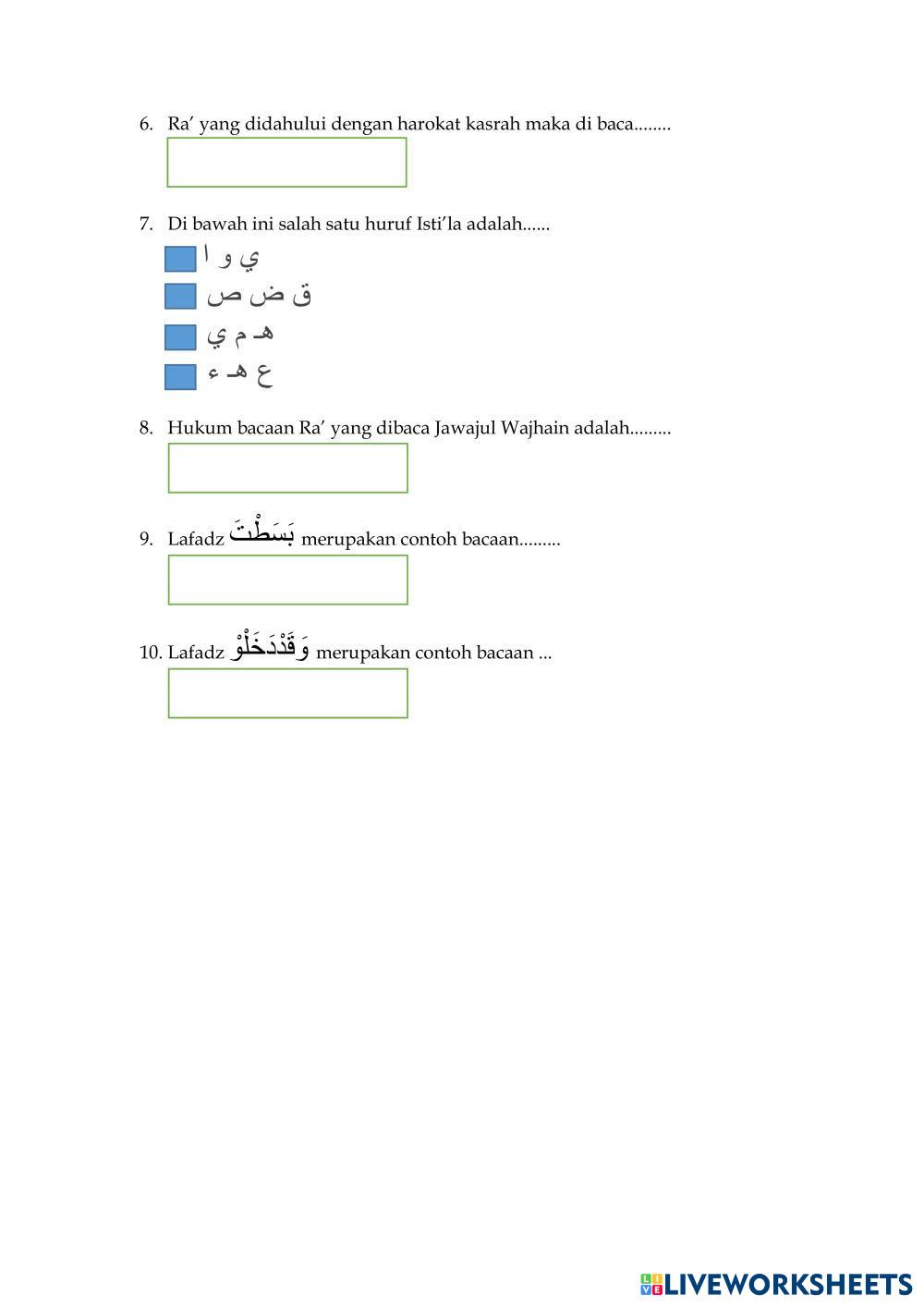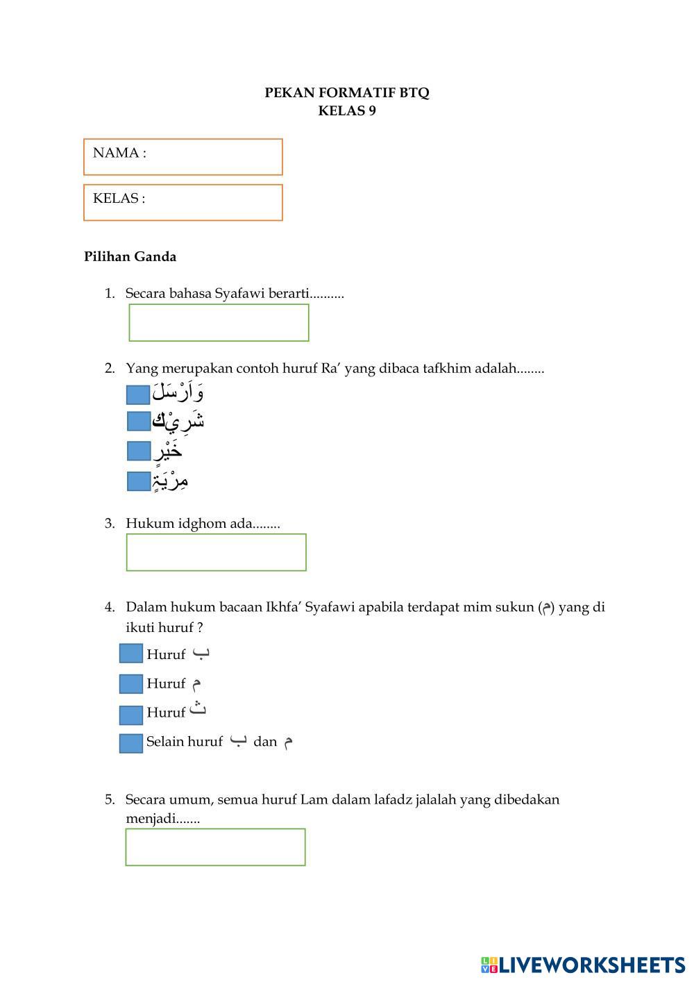 Created byNur lailiyah BTQ Tajwid Age 13+ level: Kelas 9 Indonesian Author's Instructions My Google Classroom Courses × 0 classes selected (0 students total) Quick Access Select all classes (0 classes) All Classes Loading courses... Cancel Share Share to selected Course __COURSE_NAME__ __STUDENT_NAME__ (__STUDENT_EMAIL__) PEKAN FORMATIF BTQ KLS.9 GANJIL 2024/2025 Download Worksheet Validation Check my answers Emails my answers to my teacher Full name Group/level School subject Teacher's email or key code Close Submit Validating worksheet... (12) Your answers have been sent to your teacher. Good luck! OK We encountered an error submitting your answers. Please try again. OK Advertisement | Go Ad Free Created byNur lailiyah BTQ Tajwid Age 13+ level: Kelas 9 Indonesian Author's Instructions