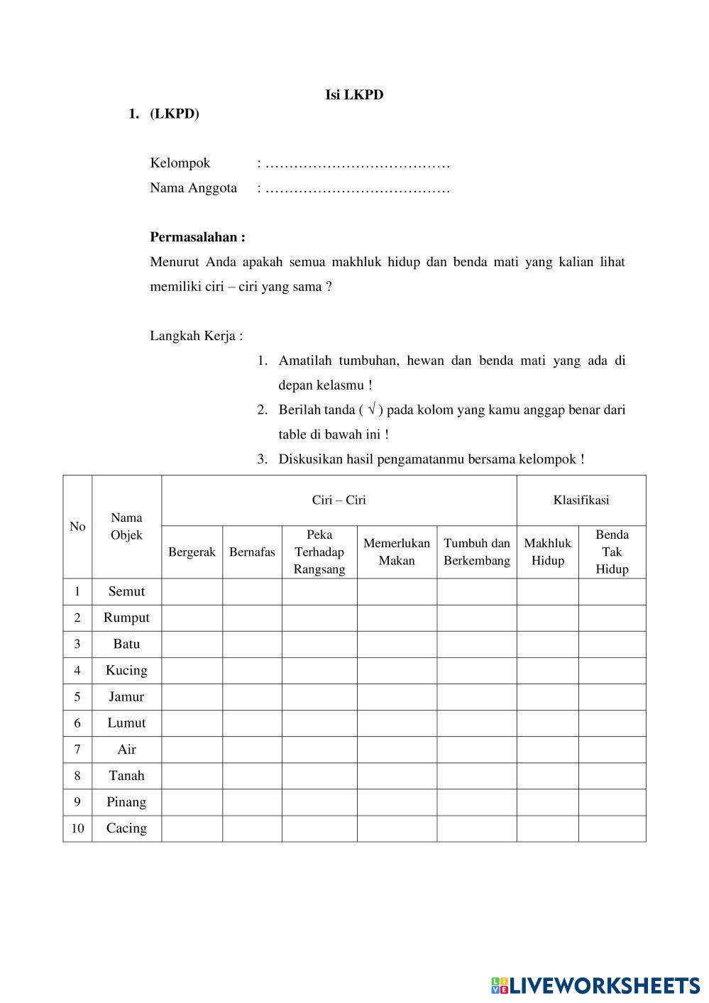 Created byArif Rahman Hakim Ciri-ciri Makhluk Hidup Ciri-ciri makhluk hidup Age 15-18 level: 1 Indonesian Author's Instructions Ciri Mahluk Hidup My Google Classroom Courses × 0 classes selected (0 students total) Quick Access Select all classes (0 classes) All Classes Loading courses... Cancel Share Share to selected Course __COURSE_NAME__ __STUDENT_NAME__ (__STUDENT_EMAIL__) LKPD Ciri mahluk hidup Download Worksheet Validation Check my answers Emails my answers to my teacher Full name Group/level School subject Teacher's email or key code Close Submit Validating worksheet... (12) Your answers have been sent to your teacher. Good luck! OK We encountered an error submitting your answers. Please try again. OK Advertisement | Go Ad Free Created byArif Rahman Hakim Ciri-ciri Makhluk Hidup Ciri-ciri makhluk hidup Age 15-18 level: 1 Indonesian Author's Instructions Ciri Mahluk Hidup