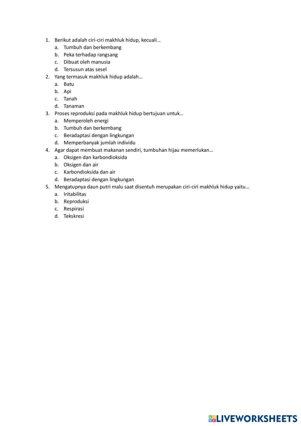 Created byFaizatun Nikmah Ciri-ciri Makhluk Hidup Ciri-ciri makhluk hidup Age 11-17 level: 7 Indonesian Author's Instructions My Google Classroom Courses × 0 classes selected (0 students total) Quick Access Select all classes (0 classes) All Classes Loading courses... Cancel Share Share to selected Course __COURSE_NAME__ __STUDENT_NAME__ (__STUDENT_EMAIL__) Faizatun Nikmah Download Worksheet Validation Check my answers Emails my answers to my teacher Full name Group/level School subject Teacher's email or key code Close Submit Validating worksheet... (12) Your answers have been sent to your teacher. Good luck! OK We encountered an error submitting your answers. Please try again. OK Advertisement | Go Ad Free Created byFaizatun Nikmah Ciri-ciri Makhluk Hidup Ciri-ciri makhluk hidup Age 11-17 level: 7 Indonesian Author's Instructions