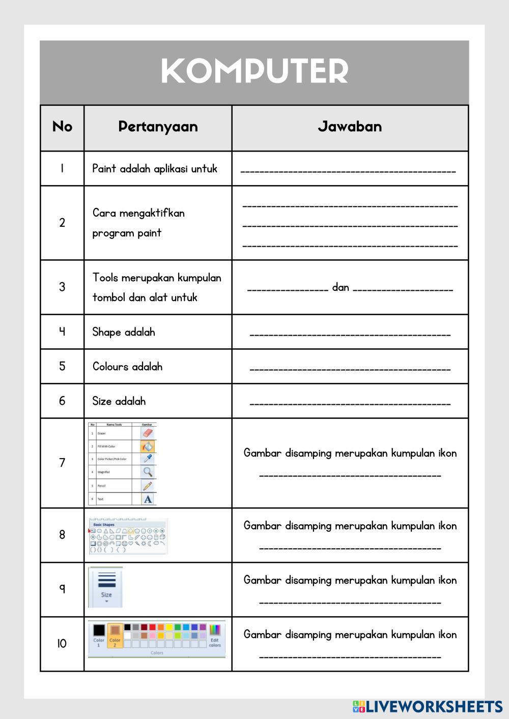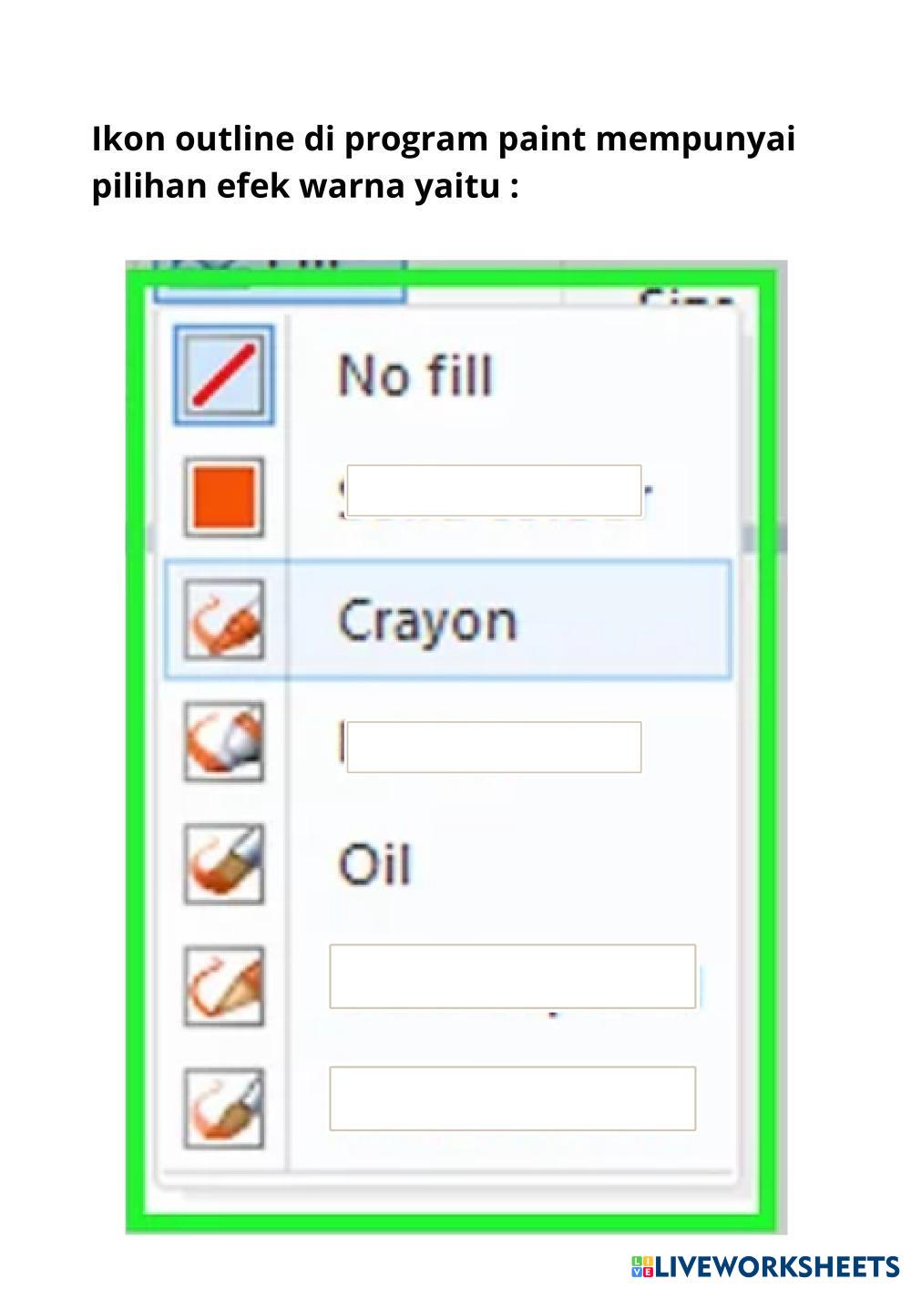 Created byAnna Pertiwi Computer Ms Paint Age 8-12 level: 2 Indonesian Author's Instructions My Google Classroom Courses × 0 classes selected (0 students total) Quick Access Select all classes (0 classes) All Classes Loading courses... Cancel Share Share to selected Course __COURSE_NAME__ __STUDENT_NAME__ (__STUDENT_EMAIL__) Paint Download Worksheet Validation Check my answers Emails my answers to my teacher Full name Group/level School subject Teacher's email or key code Close Submit Validating worksheet... (12) Your answers have been sent to your teacher. Good luck! OK We encountered an error submitting your answers. Please try again. OK Advertisement | Go Ad Free Created byAnna Pertiwi Computer Ms Paint Age 8-12 level: 2 Indonesian Author's Instructions