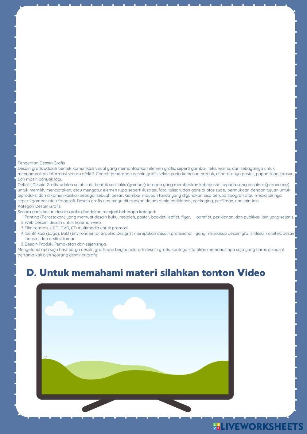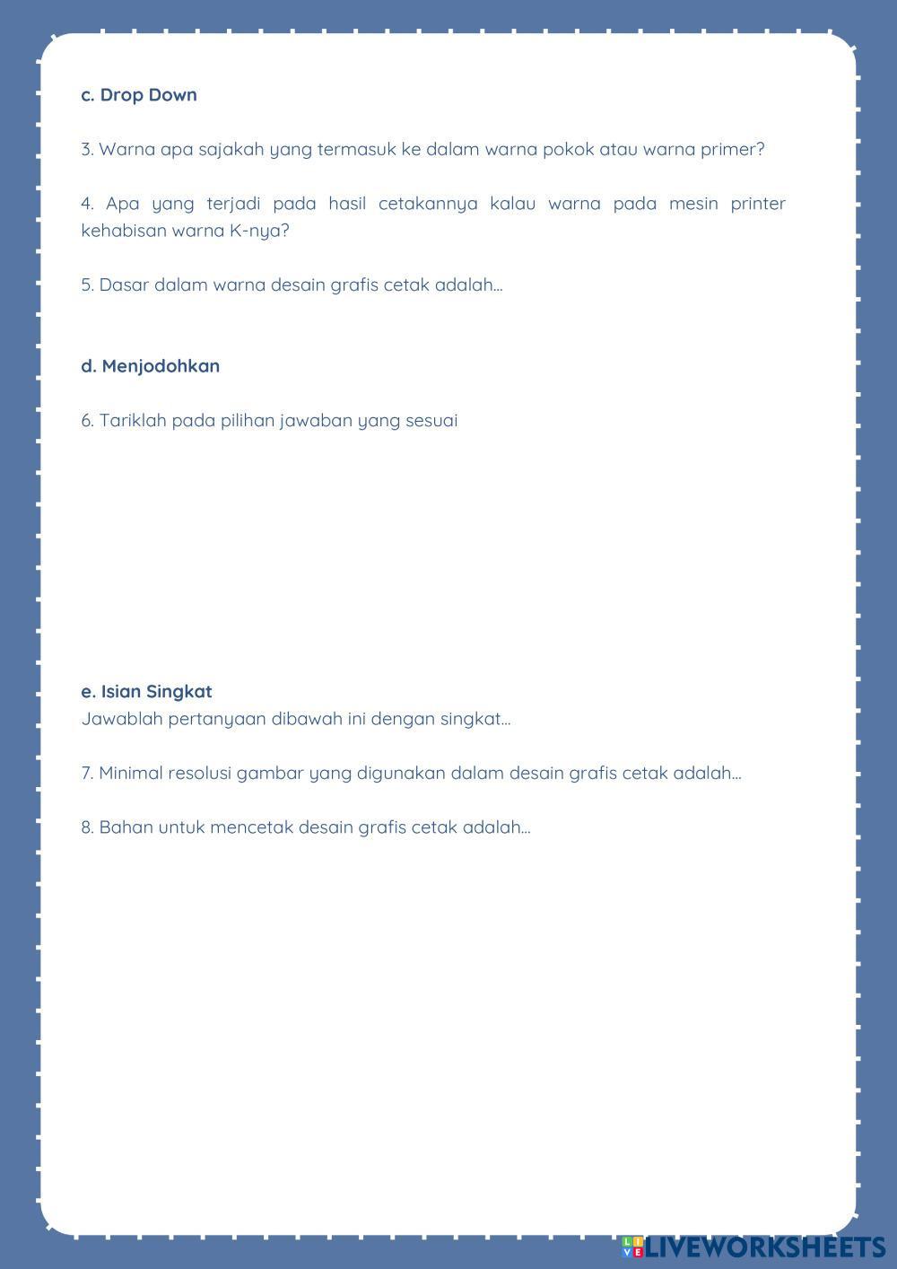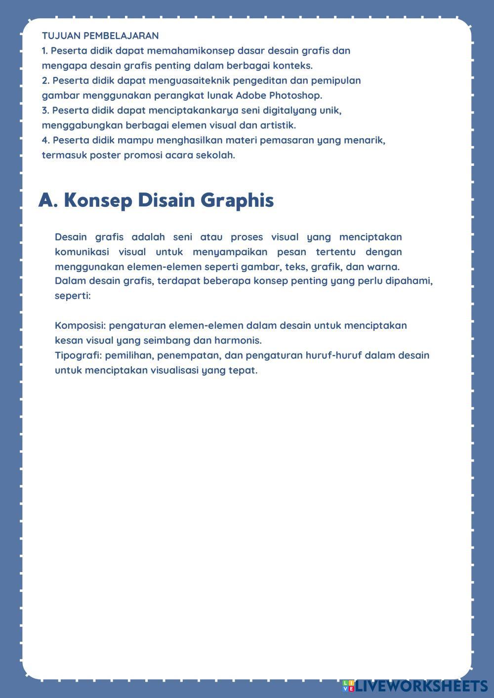 Created bylamiha Dasar Desain Grafis Desain Age 15+ level: 15 Indonesian Author's Instructions My Google Classroom Courses × 0 classes selected (0 students total) Quick Access Select all classes (0 classes) All Classes Loading courses... Cancel Share Share to selected Course __COURSE_NAME__ __STUDENT_NAME__ (__STUDENT_EMAIL__) INFORMATIKA Download Worksheet Validation Check my answers Emails my answers to my teacher Full name Group/level School subject Teacher's email or key code Close Submit Validating worksheet... (12) Your answers have been sent to your teacher. Good luck! OK We encountered an error submitting your answers. Please try again. OK Advertisement | Go Ad Free Created bylamiha Dasar Desain Grafis Desain Age 15+ level: 15 Indonesian Author's Instructions