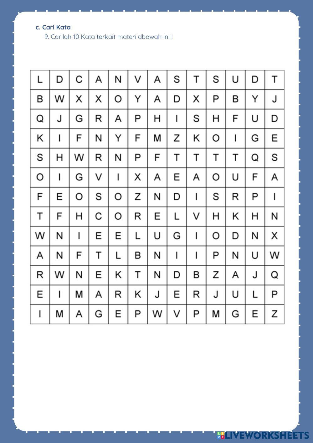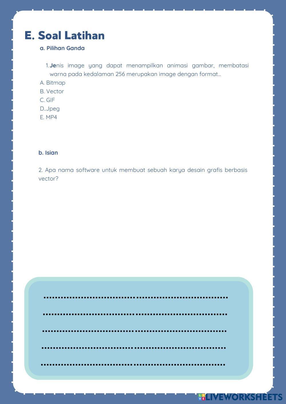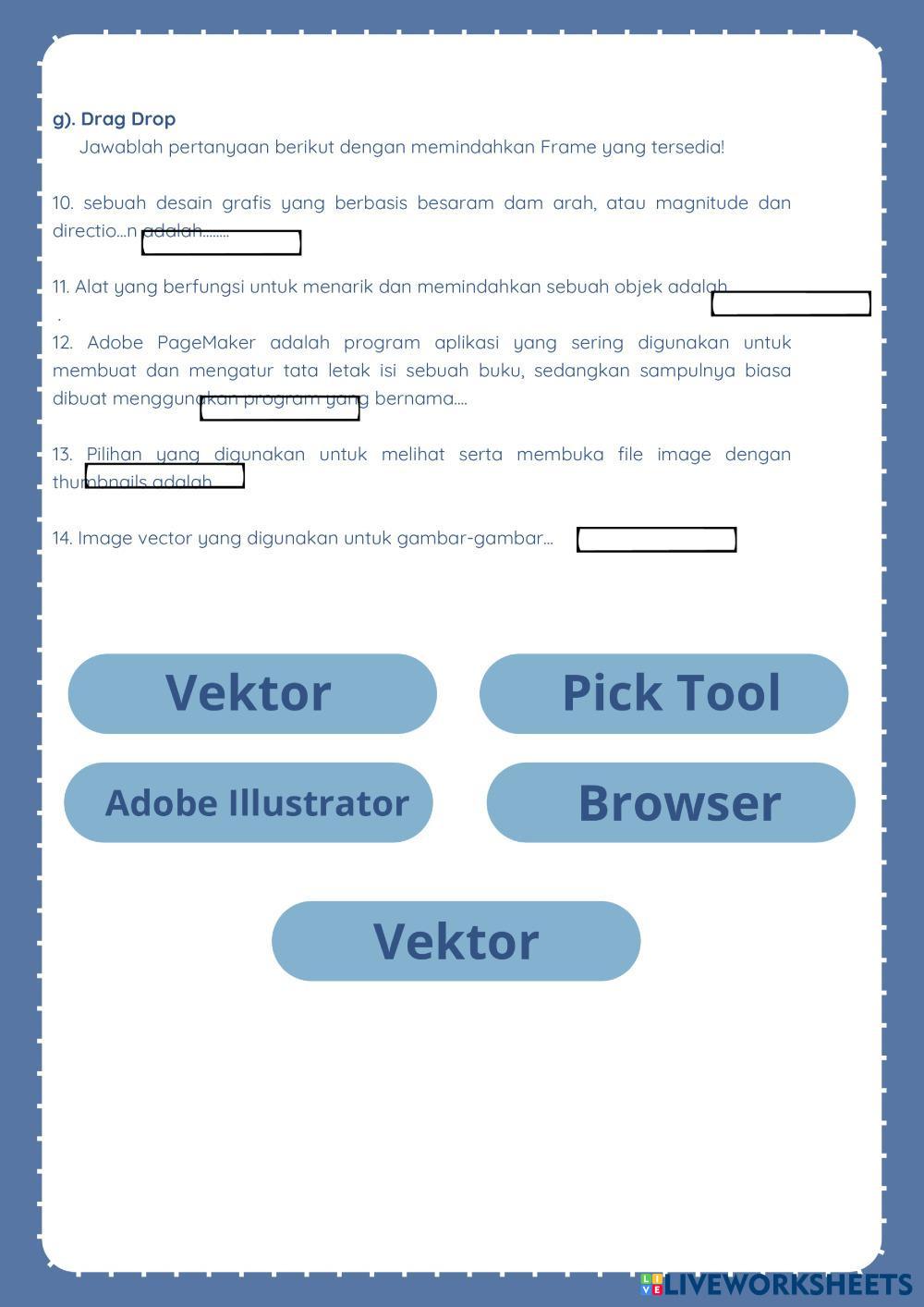 Created bylamiha Dasar Desain Grafis Desain Age 15+ level: 15 Indonesian Author's Instructions My Google Classroom Courses × 0 classes selected (0 students total) Quick Access Select all classes (0 classes) All Classes Loading courses... Cancel Share Share to selected Course __COURSE_NAME__ __STUDENT_NAME__ (__STUDENT_EMAIL__) INFORMATIKA Download Worksheet Validation Check my answers Emails my answers to my teacher Full name Group/level School subject Teacher's email or key code Close Submit Validating worksheet... (12) Your answers have been sent to your teacher. Good luck! OK We encountered an error submitting your answers. Please try again. OK Advertisement | Go Ad Free Created bylamiha Dasar Desain Grafis Desain Age 15+ level: 15 Indonesian Author's Instructions