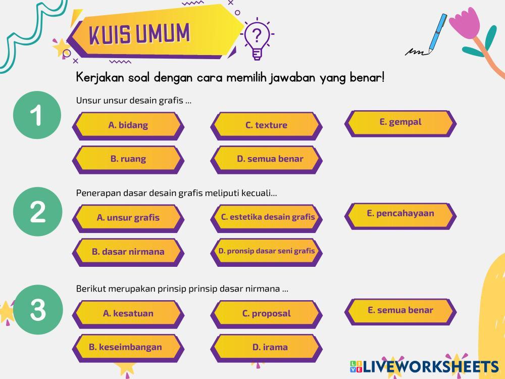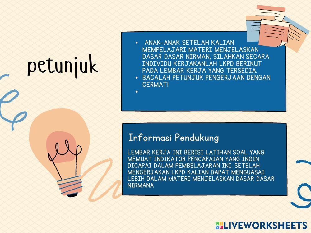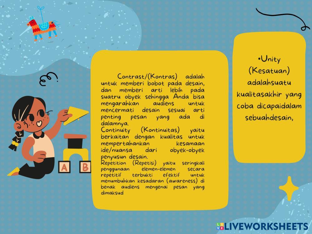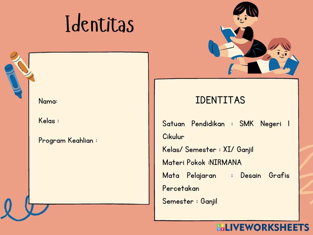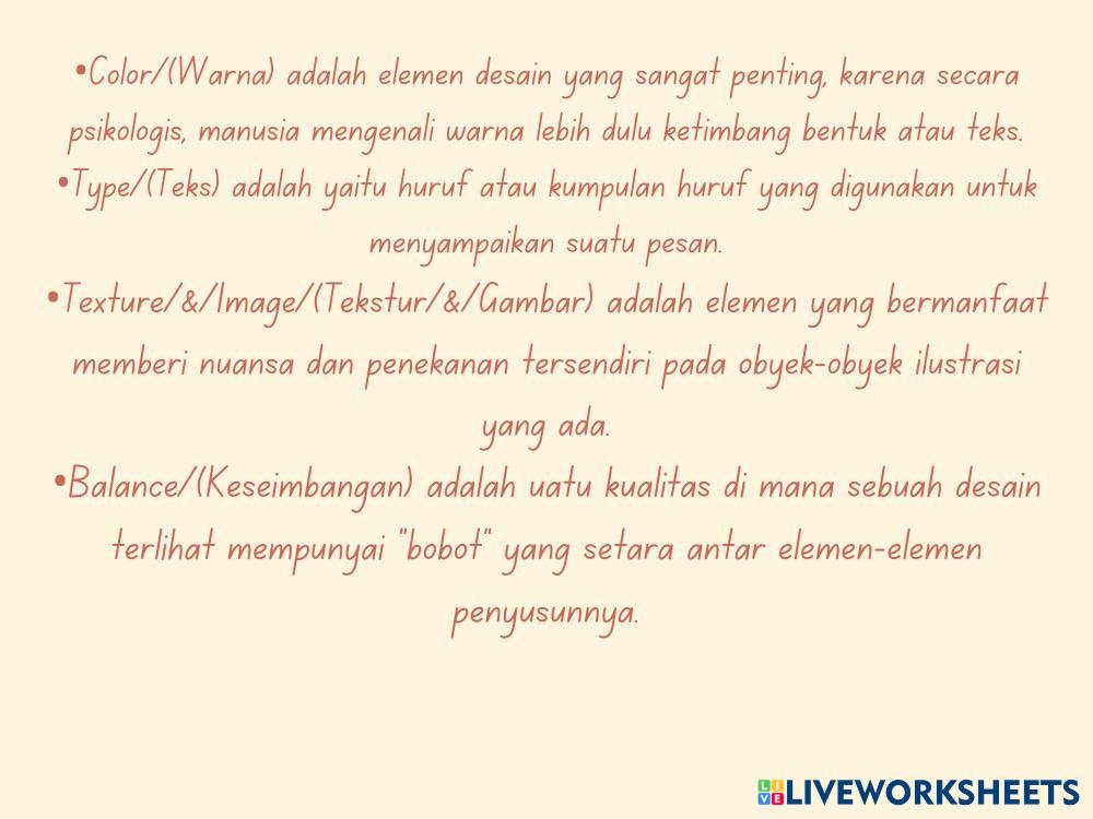 Created byGaman Mustaqim Desain Grafis Percetakan Nirmana Age 16+ level: XI Indonesian Author's Instructions My Google Classroom Courses × 0 classes selected (0 students total) Quick Access Select all classes (0 classes) All Classes Loading courses... Cancel Share Share to selected Course __COURSE_NAME__ __STUDENT_NAME__ (__STUDENT_EMAIL__) LKPD pertemuan 1 REVISI Download Worksheet Validation Check my answers Emails my answers to my teacher Full name Group/level School subject Teacher's email or key code Close Submit Validating worksheet... (12) Your answers have been sent to your teacher. Good luck! OK We encountered an error submitting your answers. Please try again. OK Advertisement | Go Ad Free Created byGaman Mustaqim Desain Grafis Percetakan Nirmana Age 16+ level: XI Indonesian Author's Instructions