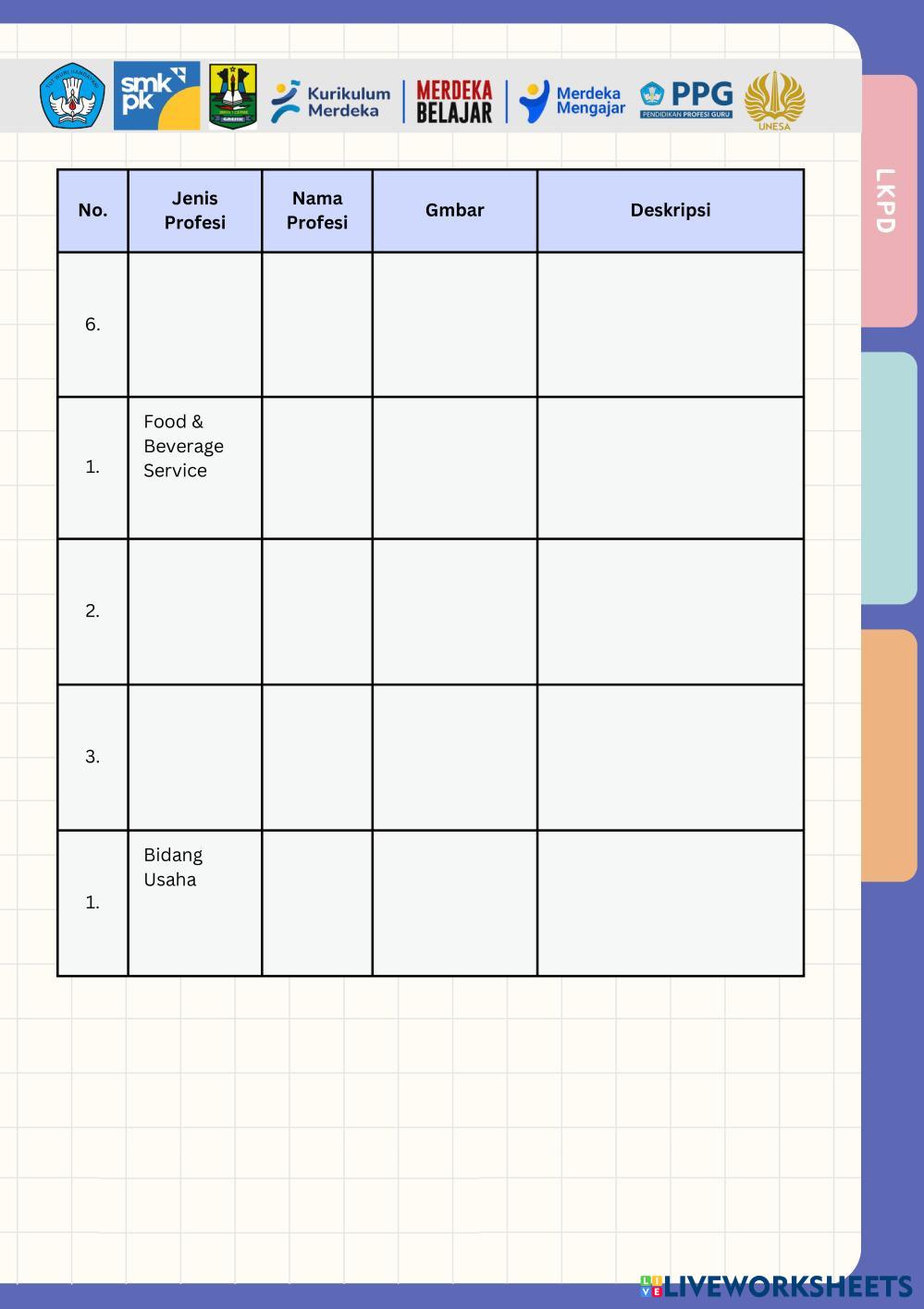 Created byMaulida Dwi Rahmawati Education LKPD Age 16+ level: X Indonesian Author's Instructions My Google Classroom Courses × 0 classes selected (0 students total) Quick Access Select all classes (0 classes) All Classes Loading courses... Cancel Share Share to selected Course __COURSE_NAME__ __STUDENT_NAME__ (__STUDENT_EMAIL__) Aktivitas 1/Profesi di Bidang Kuliner Download Worksheet Validation Check my answers Emails my answers to my teacher Full name Group/level School subject Teacher's email or key code Close Submit Validating worksheet... (12) Your answers have been sent to your teacher. Good luck! OK We encountered an error submitting your answers. Please try again. OK Advertisement | Go Ad Free Created byMaulida Dwi Rahmawati Education LKPD Age 16+ level: X Indonesian Author's Instructions