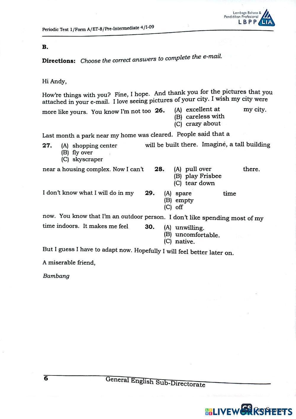 Created by Mdarwis English as a Second Language (ESL) Test Age 10-17 level: Pre Intermediate Indonesian Author's Instructions My Google Classroom Courses × 0 classes selected (0 students total) Quick Access Select all classes (0 classes) All Classes Loading courses... Cancel Share Share to selected Course __COURSE_NAME__ __STUDENT_NAME__ (__STUDENT_EMAIL__) Periodic Test 1 ET 8 Download Worksheet Validation Check my answers Emails my answers to my teacher Full name Group/level School subject Teacher's email or key code Close Submit Validating worksheet... (12) Your answers have been sent to your teacher. Good luck! OK We encountered an error submitting your answers. Please try again. OK Advertisement | Go Ad Free Created by Mdarwis English as a Second Language (ESL) Test Age 10-17 level: Pre Intermediate Indonesian Author's Instructions