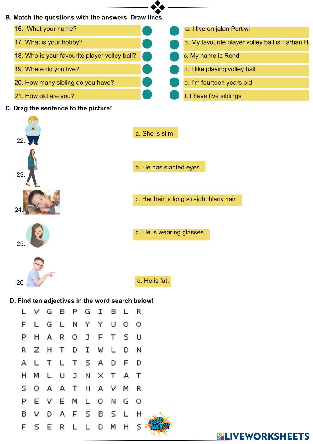 Created by Rosipah English Descriptive text Age 12 level: 7 Indonesian Author's Instructions My Google Classroom Courses × 0 classes selected (0 students total) Quick Access Select all classes (0 classes) All Classes Loading courses... Cancel Share Share to selected Course __COURSE_NAME__ __STUDENT_NAME__ (__STUDENT_EMAIL__) Formatif English 1 Download Worksheet Validation Check my answers Emails my answers to my teacher Full name Group/level School subject Teacher's email or key code Close Submit Validating worksheet... (12) Your answers have been sent to your teacher. Good luck! OK We encountered an error submitting your answers. Please try again. OK Advertisement | Go Ad Free Created by Rosipah English Descriptive text Age 12 level: 7 Indonesian Author's Instructions