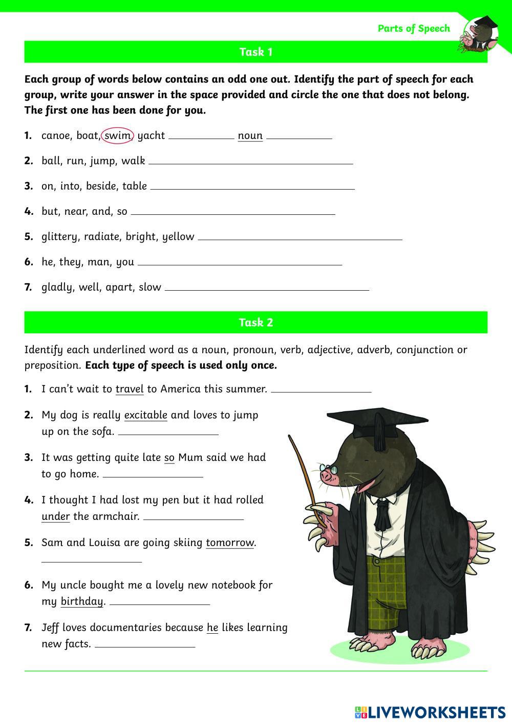 Task 2: Identify each underlined word as a noun, pronoun, verb, adjective, adverb, conjunction, or preposition.