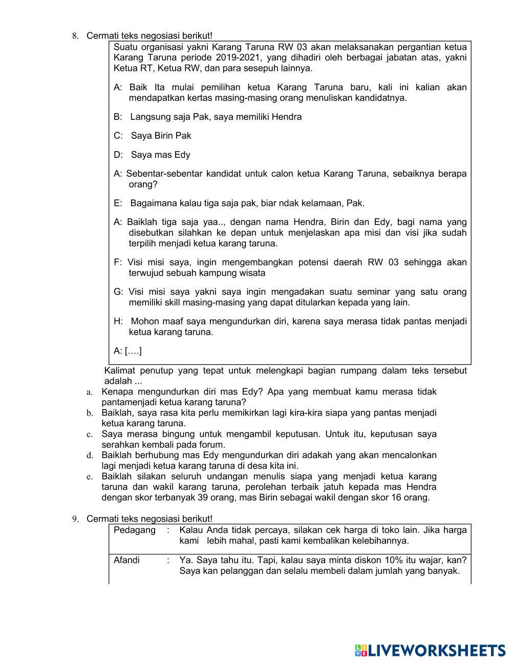 Created bySiti Halimah ESL A2 Reading Indonesian Author's Instructions REMIDIAL ASTS GENAP 2026 My Google Classroom Courses × 0 classes selected (0 students total) Quick Access Select all classes (0 classes) All Classes Loading courses... Cancel Share Share to selected Course __COURSE_NAME__ __STUDENT_NAME__ (__STUDENT_EMAIL__) BAHASA INDONESIA Download Worksheet Validation Check my answers Emails my answers to my teacher Full name Group/level School subject Teacher's email or key code Close Submit Validating worksheet... (12) Your answers have been sent to your teacher. Good luck! OK We encountered an error submitting your answers. Please try again. OK Advertisement | Go Ad Free Created bySiti Halimah ESL A2 Reading Indonesian Author's Instructions REMIDIAL ASTS GENAP 2026 Explore Worksheets G3-3-2《爸爸的老师》(上)2 ESL A2 G3-3-2《爸爸的老师》(上)2 Reading - ESL G3 Reading homework 6 ESL A2 Reading homework 6 Reading - ESL Reading Reading Homework 6 ESL A2 Reading Homework 6 Reading - ESL Reading The Competition A2 Free Time Hobbies Stamp Collecting ESL A2 The Competition A2 Free Time Hobbies Stamp Collecting Reading - ESL Read the text and do the questions