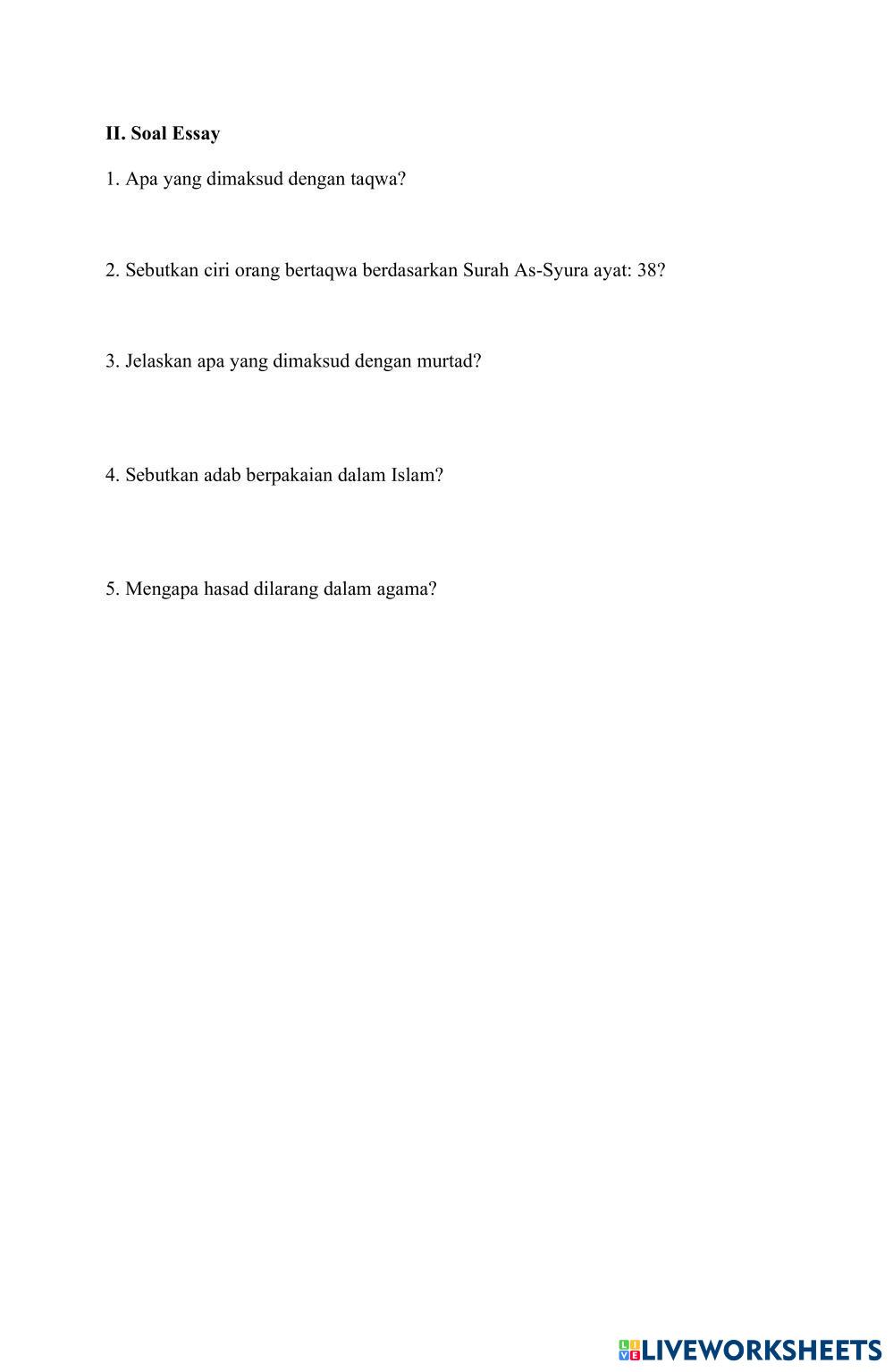 Created byPKBM BAITURROHMAN ESL Indonesian B2 Reading Indonesian Author's Instructions - My Google Classroom Courses × 0 classes selected (0 students total) Quick Access Select all classes (0 classes) All Classes Loading courses... Cancel Share Share to selected Course __COURSE_NAME__ __STUDENT_NAME__ (__STUDENT_EMAIL__) PSTS PAI Kelas 10 Download Worksheet Validation Check my answers Emails my answers to my teacher Full name Group/level School subject Teacher's email or key code Close Submit Validating worksheet... (12) Your answers have been sent to your teacher. Good luck! OK We encountered an error submitting your answers. Please try again. OK Advertisement | Go Ad Free Created byPKBM BAITURROHMAN ESL Indonesian B2 Reading Indonesian Author's Instructions - Explore Worksheets LKPD ESL B2 LKPD Reading - ESL Ayo kerjakan LKPD bersama pasanganmu E-LKPD IBISPAINT X ESL B2 E-LKPD IBISPAINT X Reading - ESL Diberitahukan kepada siswa siswi semua untuk membaca terlebih dahulu sebelum memulai mengerjakan. LKPD ESL B2 LKPD Reading - ESL . Bacalah teks anekdot di bawah ini dengan saksama. 2. Analisislah struktur dan membandingkan teks anekdot tersebut 3. Isilah tabel yang telah disediakan berdasarkan hasil analisismu. 4. Diskusikan dengan kelompokmu untuk memastikan jawabannya tepat! Alam semesta sebagai tanda kekuasaan Allah Swt ESL B2 Alam semesta sebagai tanda kekuasaan Allah Swt Reading - ESL Silahkan kerjakan di dalam worksheet ini tidak perlu di salin ke buku tulis!