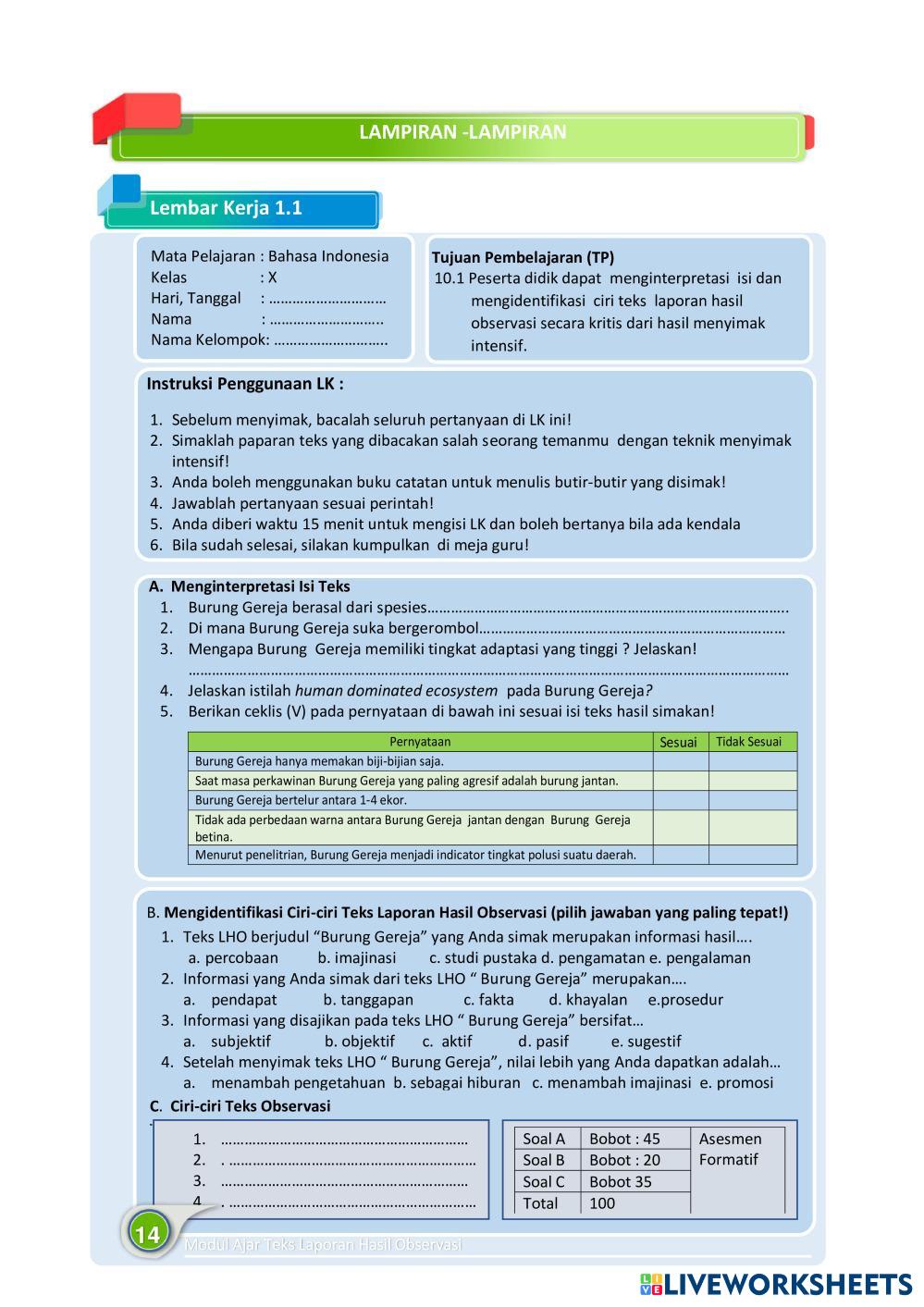 Created byTATIK DWIYANTI Evaluasi Teks LHO BAHASA INDONESIA Age 16+ level: SMA kelas X Indonesian Author's Instructions My Google Classroom Courses × 0 classes selected (0 students total) Quick Access Select all classes (0 classes) All Classes Loading courses... Cancel Share Share to selected Course __COURSE_NAME__ __STUDENT_NAME__ (__STUDENT_EMAIL__) L.K 1.1 TEKS LHO Download Worksheet Validation Check my answers Emails my answers to my teacher Full name Group/level School subject Teacher's email or key code Close Submit Validating worksheet... (12) Your answers have been sent to your teacher. Good luck! OK We encountered an error submitting your answers. Please try again. OK Advertisement | Go Ad Free Created byTATIK DWIYANTI Evaluasi Teks LHO BAHASA INDONESIA Age 16+ level: SMA kelas X Indonesian Author's Instructions