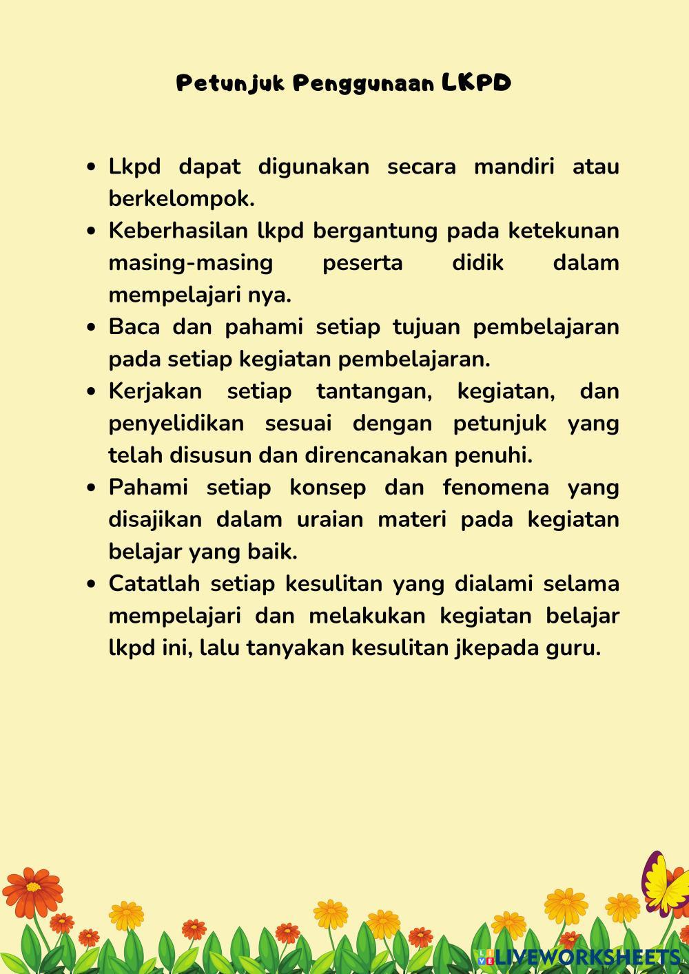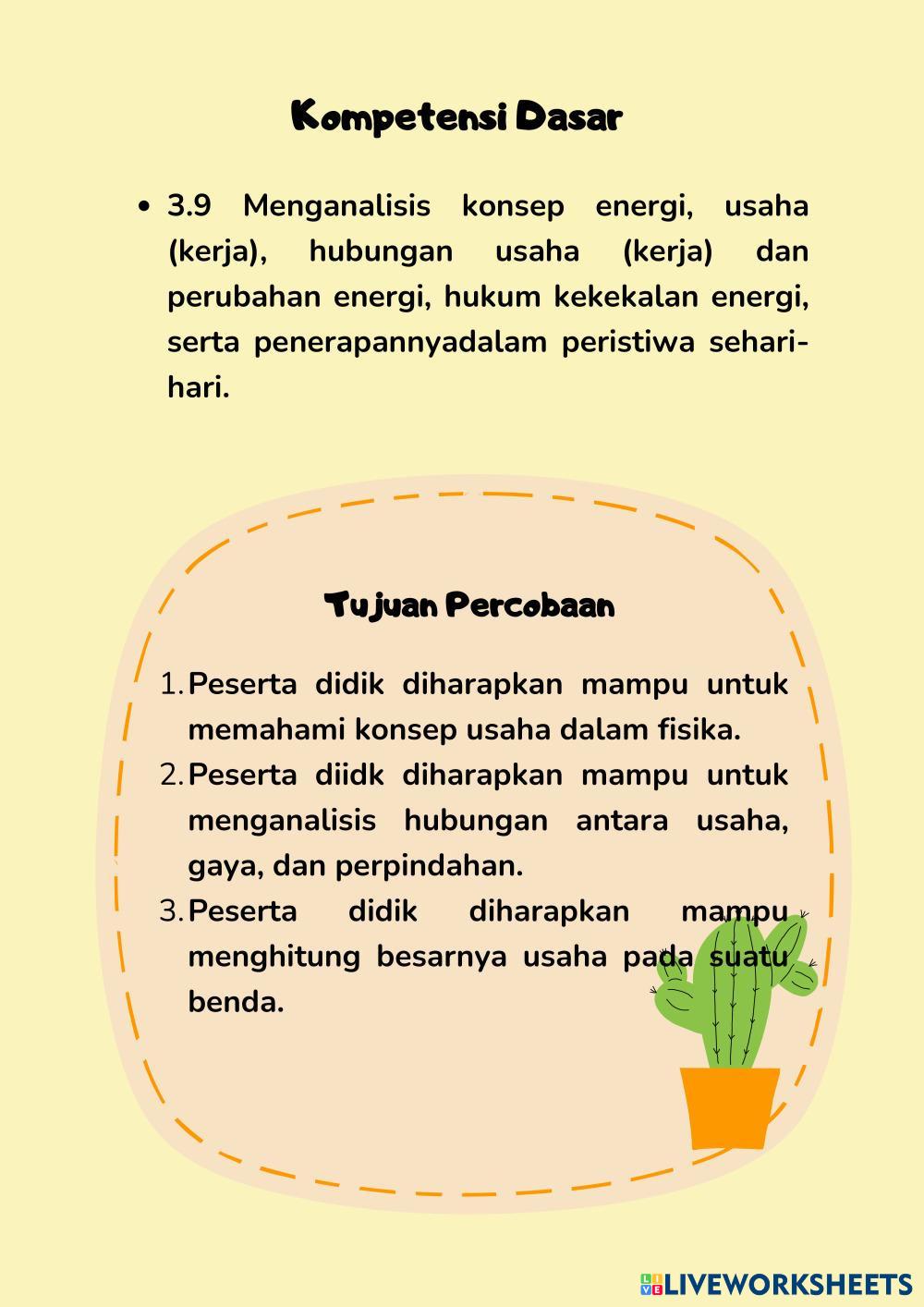 Created byVikamaenis FISIKA KELAS X usaha energi Age 13+ level: 10 Indonesian Author's Instructions My Google Classroom Courses × 0 classes selected (0 students total) Quick Access Select all classes (0 classes) All Classes Loading courses... Cancel Share Share to selected Course __COURSE_NAME__ __STUDENT_NAME__ (__STUDENT_EMAIL__) Lembar Kerja Peserta Didik (LKPD) Usaha SMA Kelas X Download Worksheet Validation Check my answers Emails my answers to my teacher Full name Group/level School subject Teacher's email or key code Close Submit Validating worksheet... (12) Your answers have been sent to your teacher. Good luck! OK We encountered an error submitting your answers. Please try again. OK Advertisement | Go Ad Free Created byVikamaenis FISIKA KELAS X usaha energi Age 13+ level: 10 Indonesian Author's Instructions