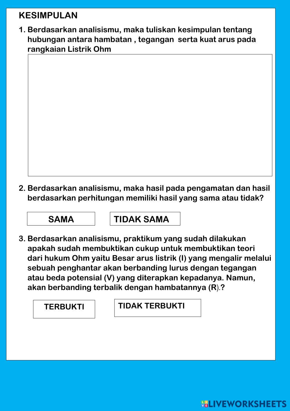 Created byJENNY OKA PUSPITASARI Fisika Hukum Ohm Age 13+ level: 10 Indonesian Author's Instructions My Google Classroom Courses × 0 classes selected (0 students total) Quick Access Select all classes (0 classes) All Classes Loading courses... Cancel Share Share to selected Course __COURSE_NAME__ __STUDENT_NAME__ (__STUDENT_EMAIL__) LEMBAR KERJA SISWA PERCOBAAN HUKUM OHM Download Worksheet Validation Check my answers Emails my answers to my teacher Full name Group/level School subject Teacher's email or key code Close Submit Validating worksheet... (12) Your answers have been sent to your teacher. Good luck! OK We encountered an error submitting your answers. Please try again. OK Advertisement | Go Ad Free Created byJENNY OKA PUSPITASARI Fisika Hukum Ohm Age 13+ level: 10 Indonesian Author's Instructions