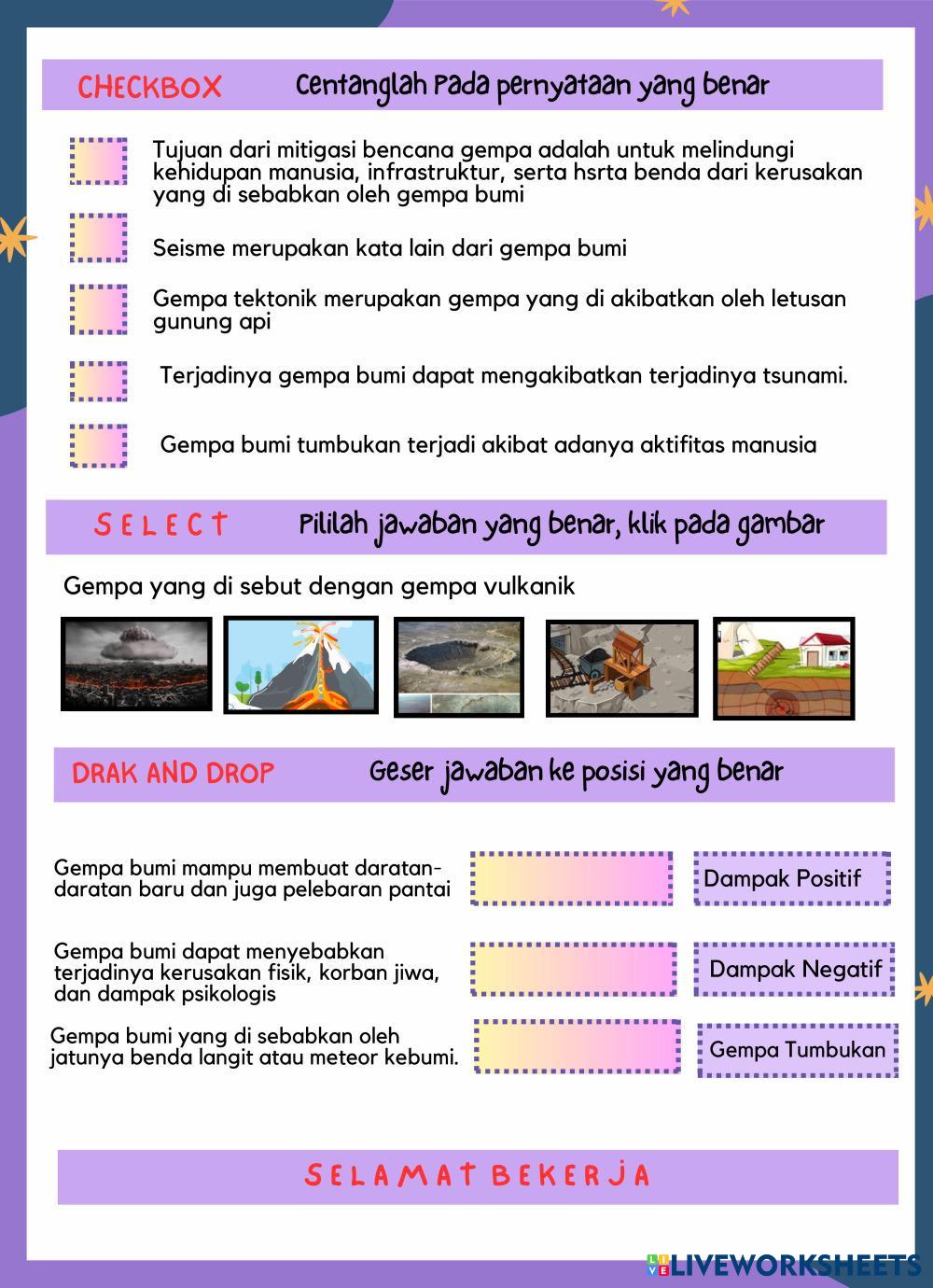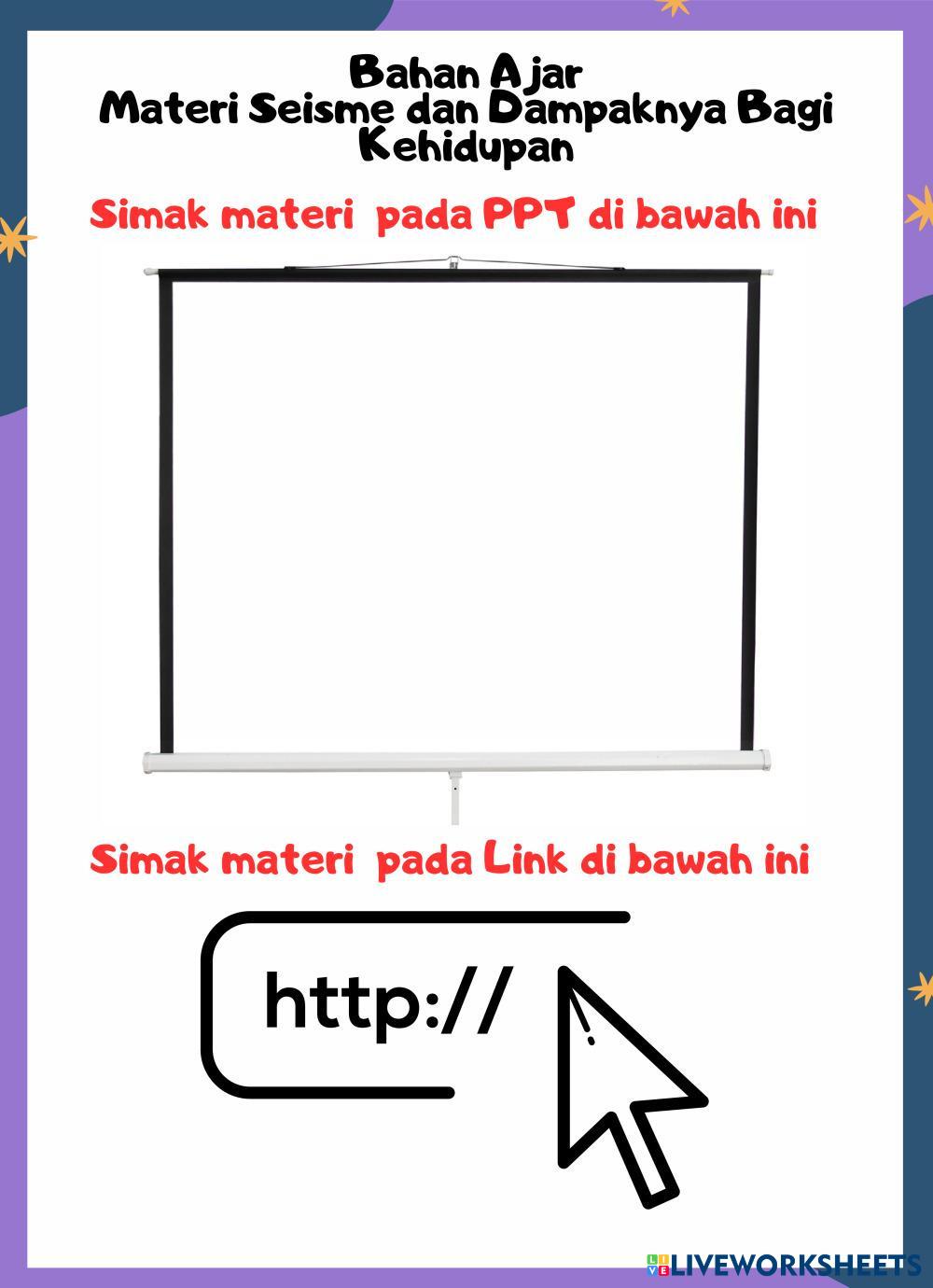 Created byHajmawati GEOGRAFI Karakteristk bencana alam Age 15+ level: X Indonesian Author's Instructions LKPD ini berisi materi dan soal-soal My Google Classroom Courses × 0 classes selected (0 students total) Quick Access Select all classes (0 classes) All Classes Loading courses... Cancel Share Share to selected Course __COURSE_NAME__ __STUDENT_NAME__ (__STUDENT_EMAIL__) LKPD Materi Seisme Download Worksheet Validation Check my answers Emails my answers to my teacher Full name Group/level School subject Teacher's email or key code Close Submit Validating worksheet... (12) Your answers have been sent to your teacher. Good luck! OK We encountered an error submitting your answers. Please try again. OK Advertisement | Go Ad Free Created byHajmawati GEOGRAFI Karakteristk bencana alam Age 15+ level: X Indonesian Author's Instructions LKPD ini berisi materi dan soal-soal